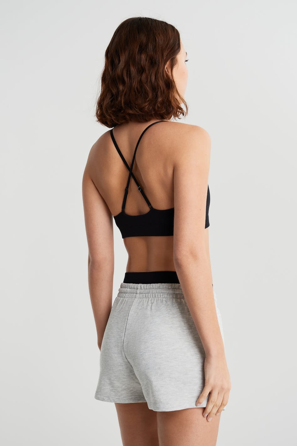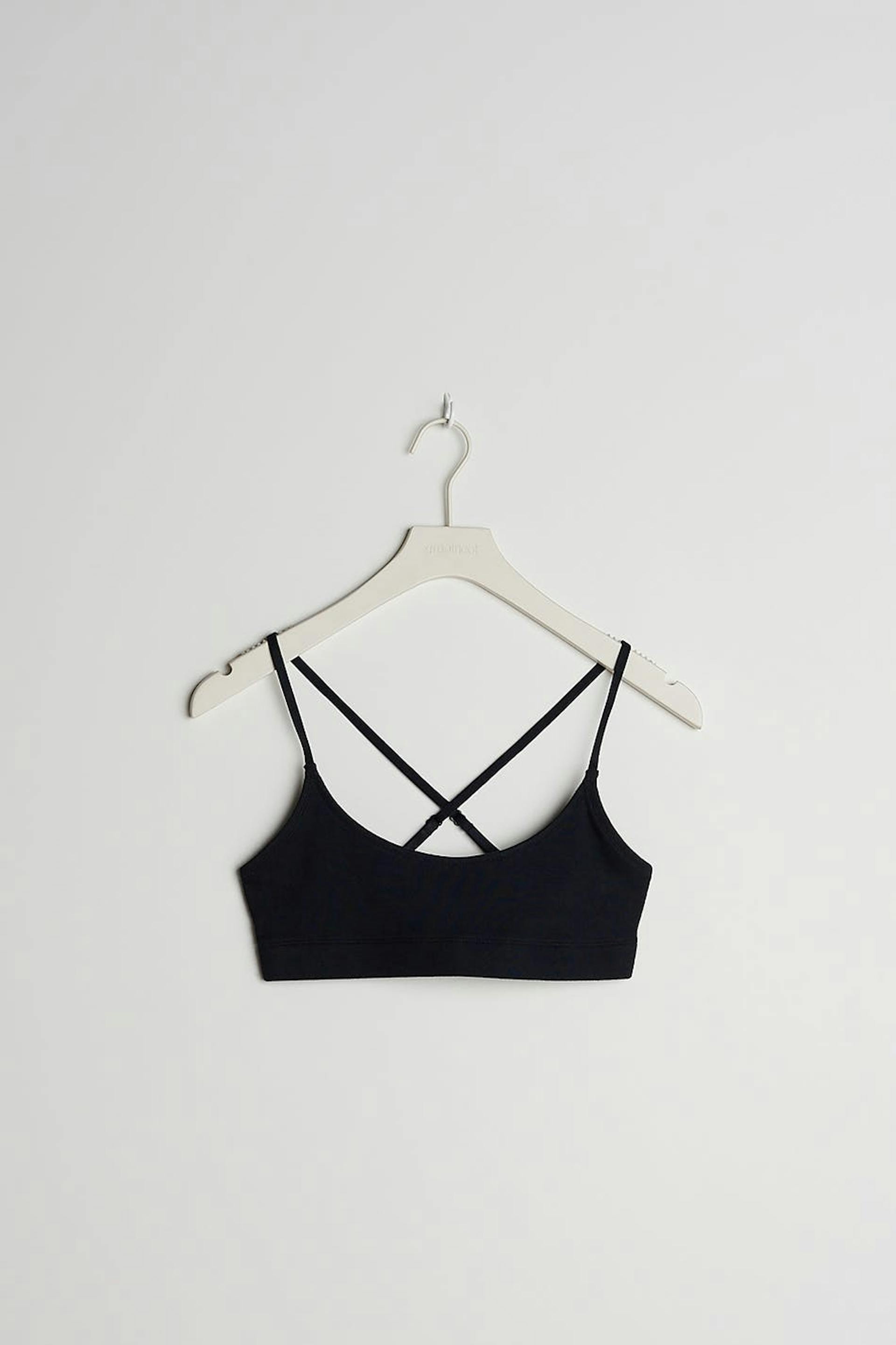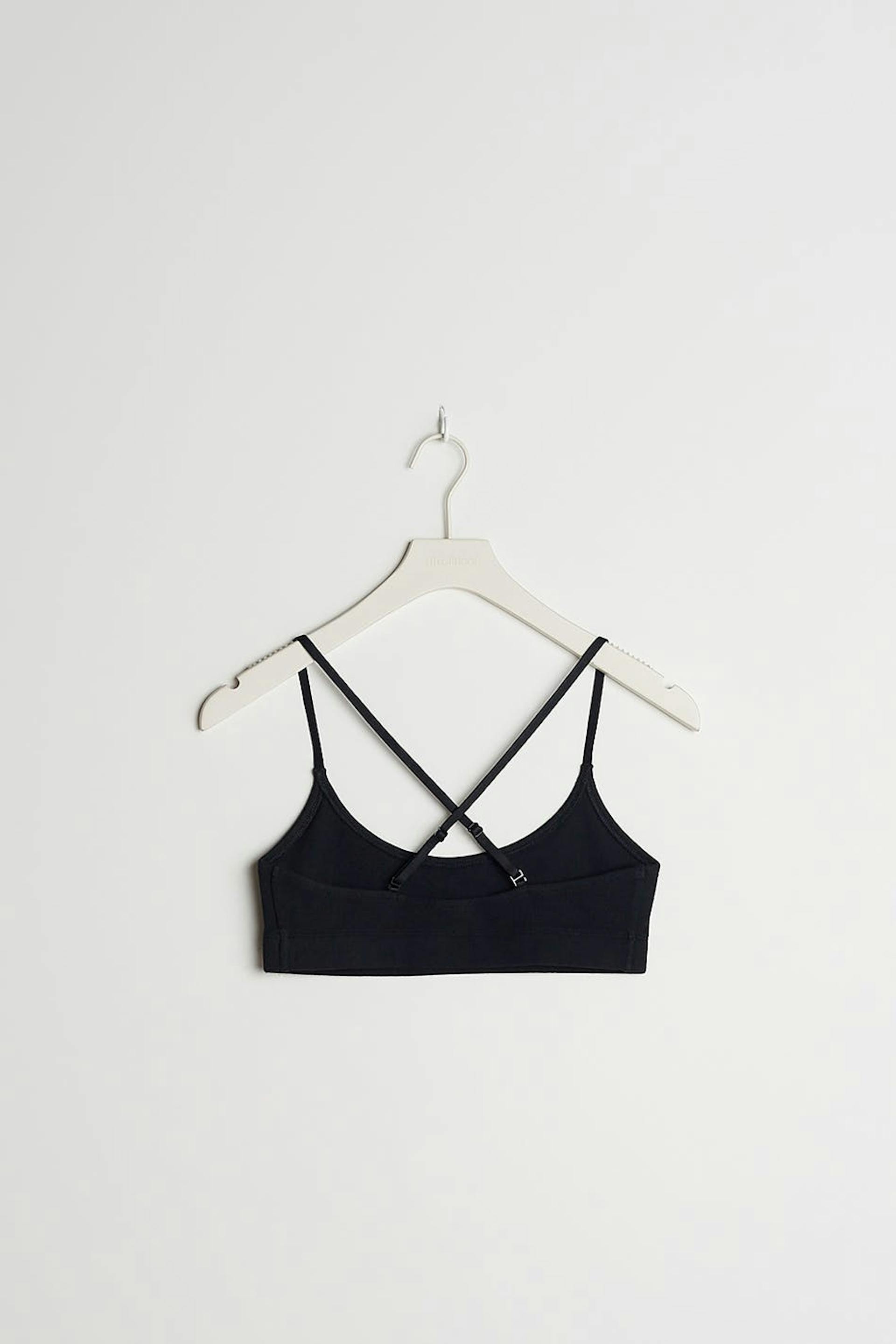 Mjuk BH med korsade, justerbara axelband. BH:n är svart och ribbad. Den är gjord av bomull.