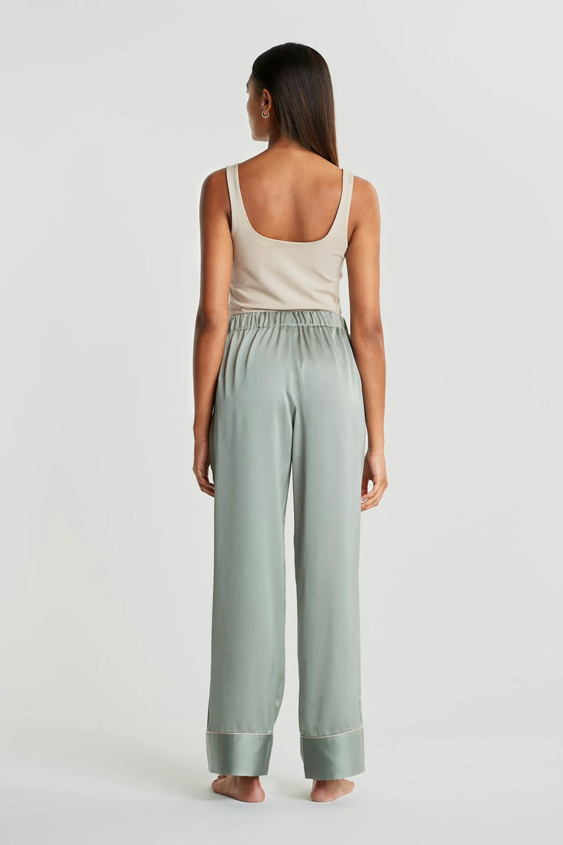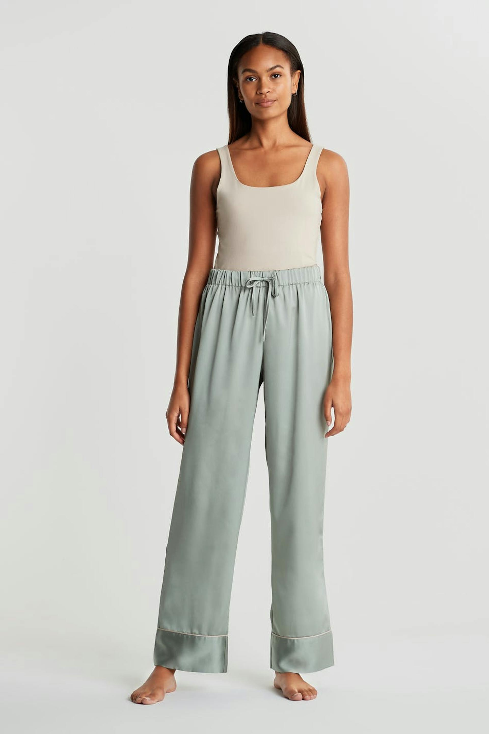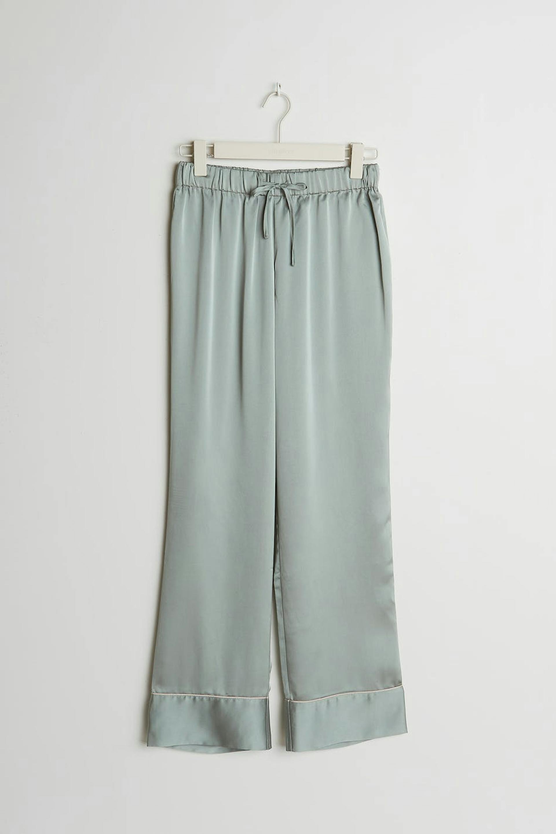 Pyjamasbyxor med vida ben. Pyjamasbyxorna är gröna och har en midja i resår med en dragsko.