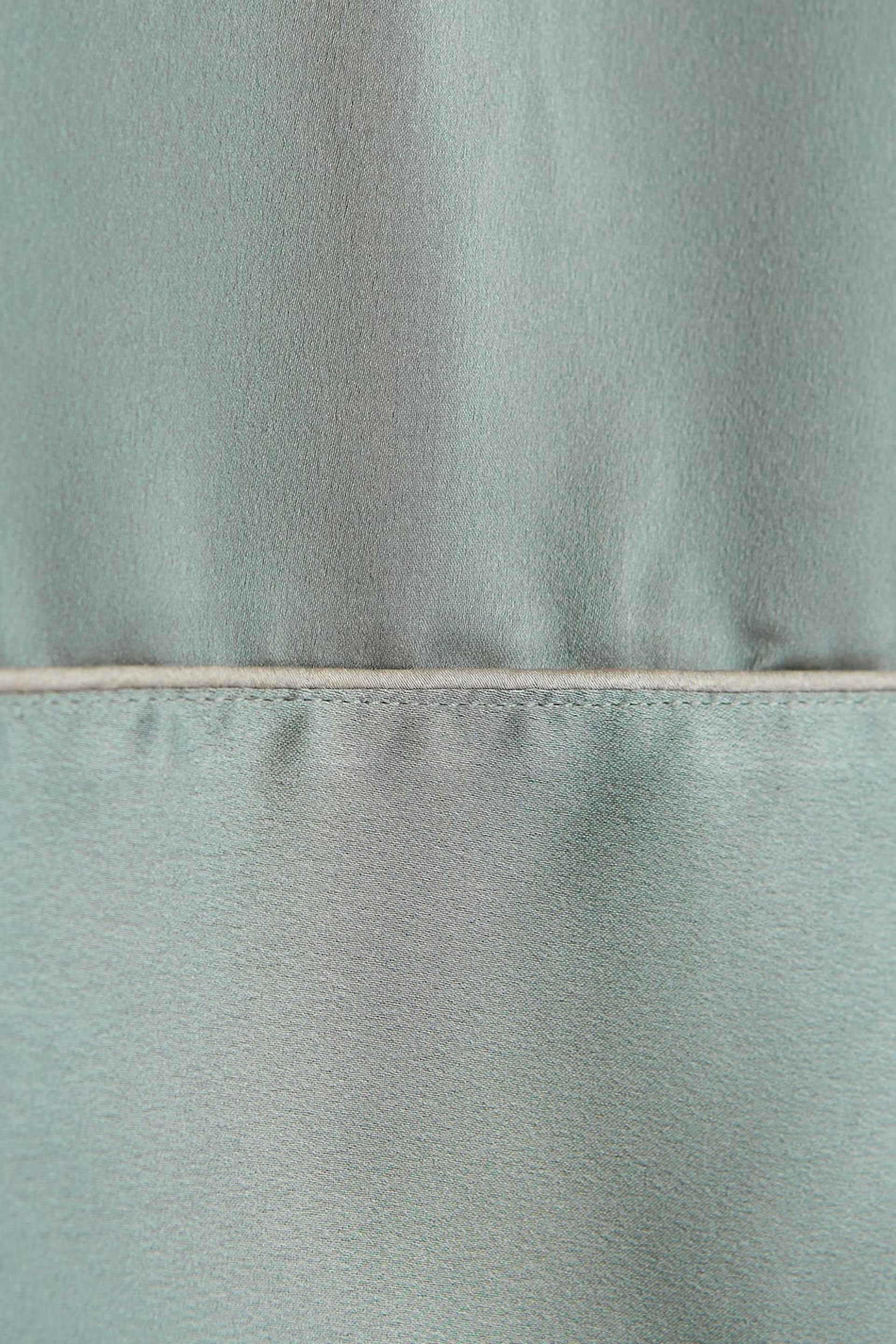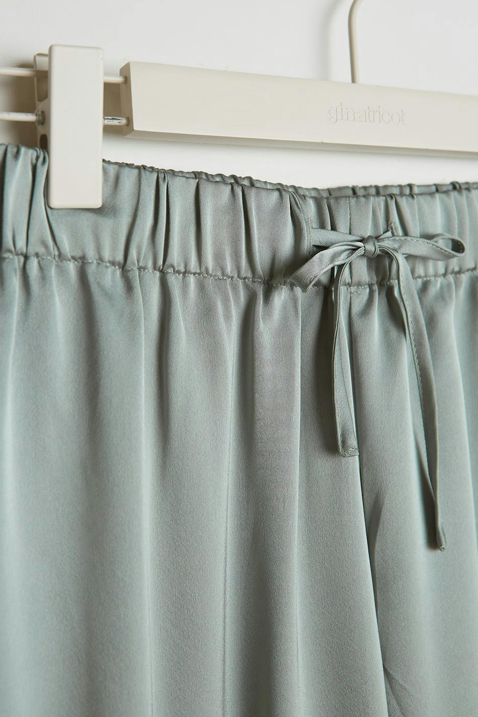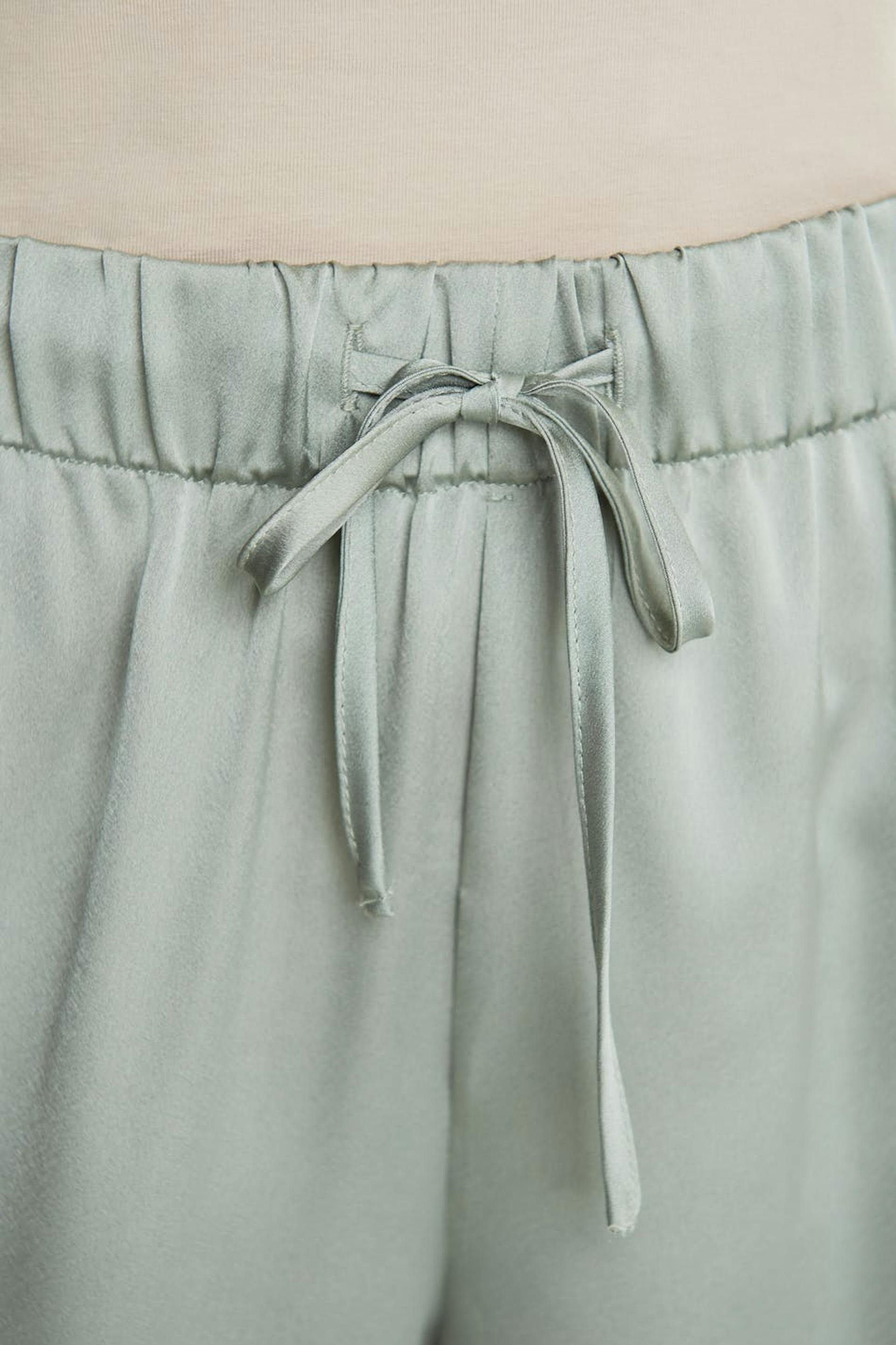 Pyjamasbyxor med vida ben. Pyjamasbyxorna är gröna och har en midja i resår med en dragsko.