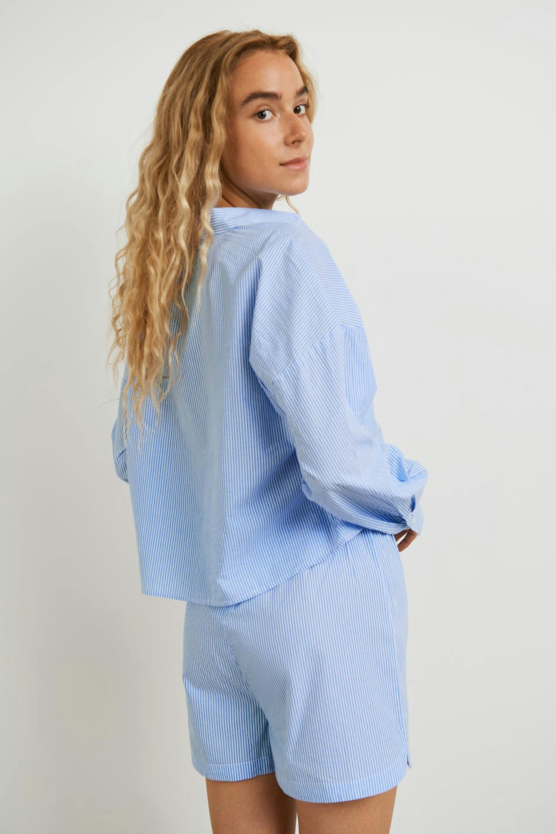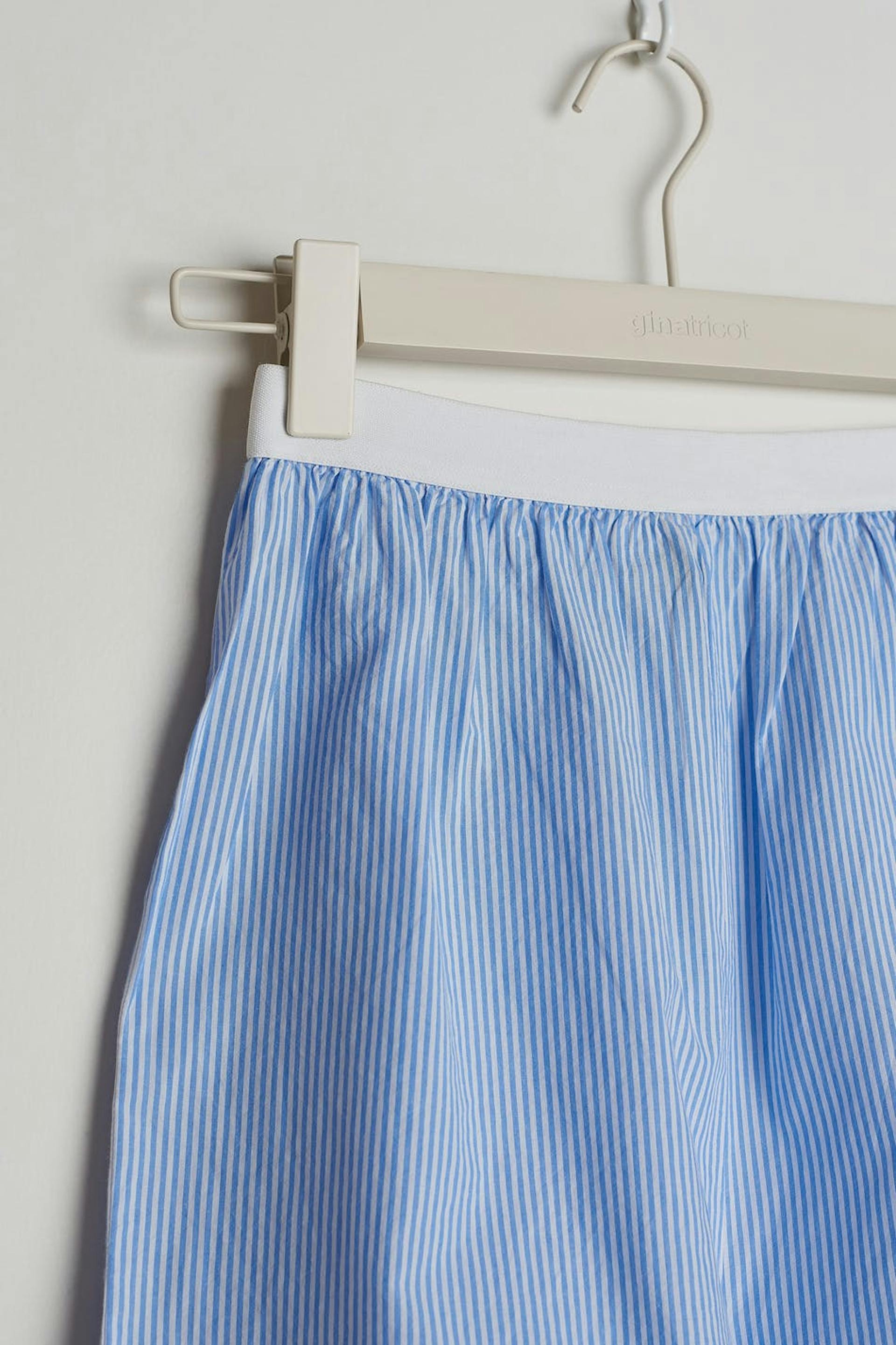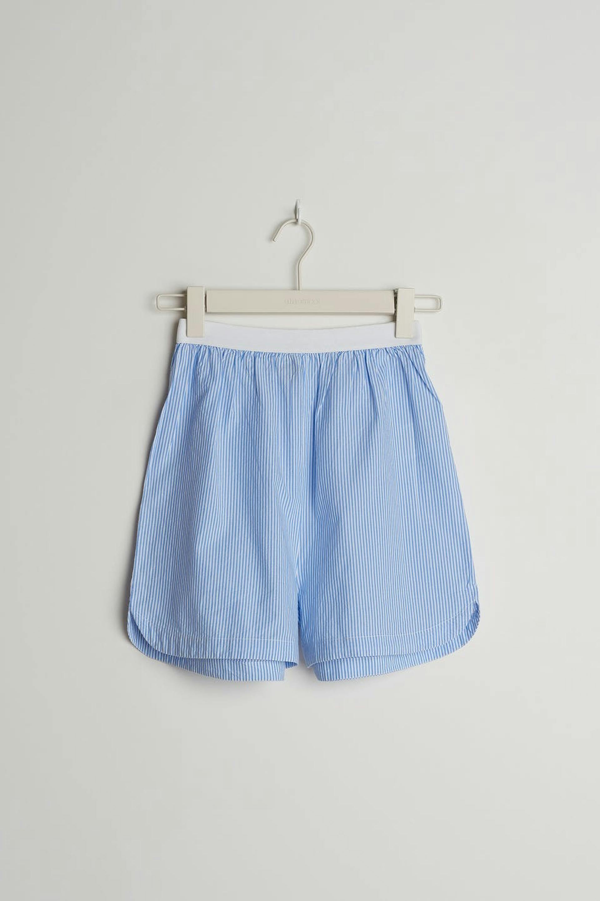 Randiga pyjamasshorts med en figurnära passform. Shortsen är blåa, vita och mjuka. De har en rak skärning, ett elastiskt band i midjan och ett mjukt material i bomull.