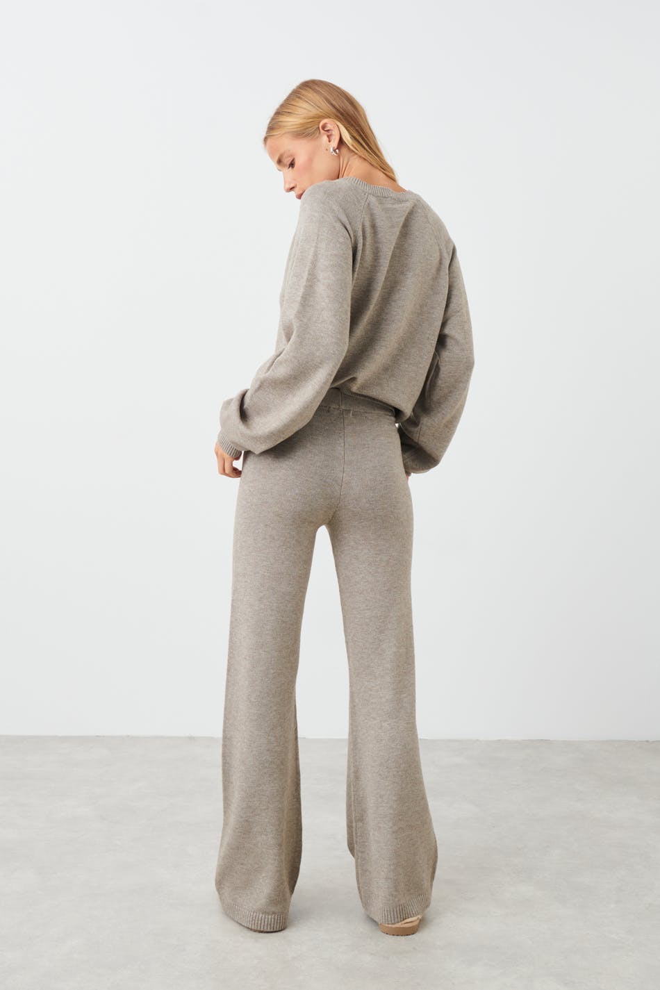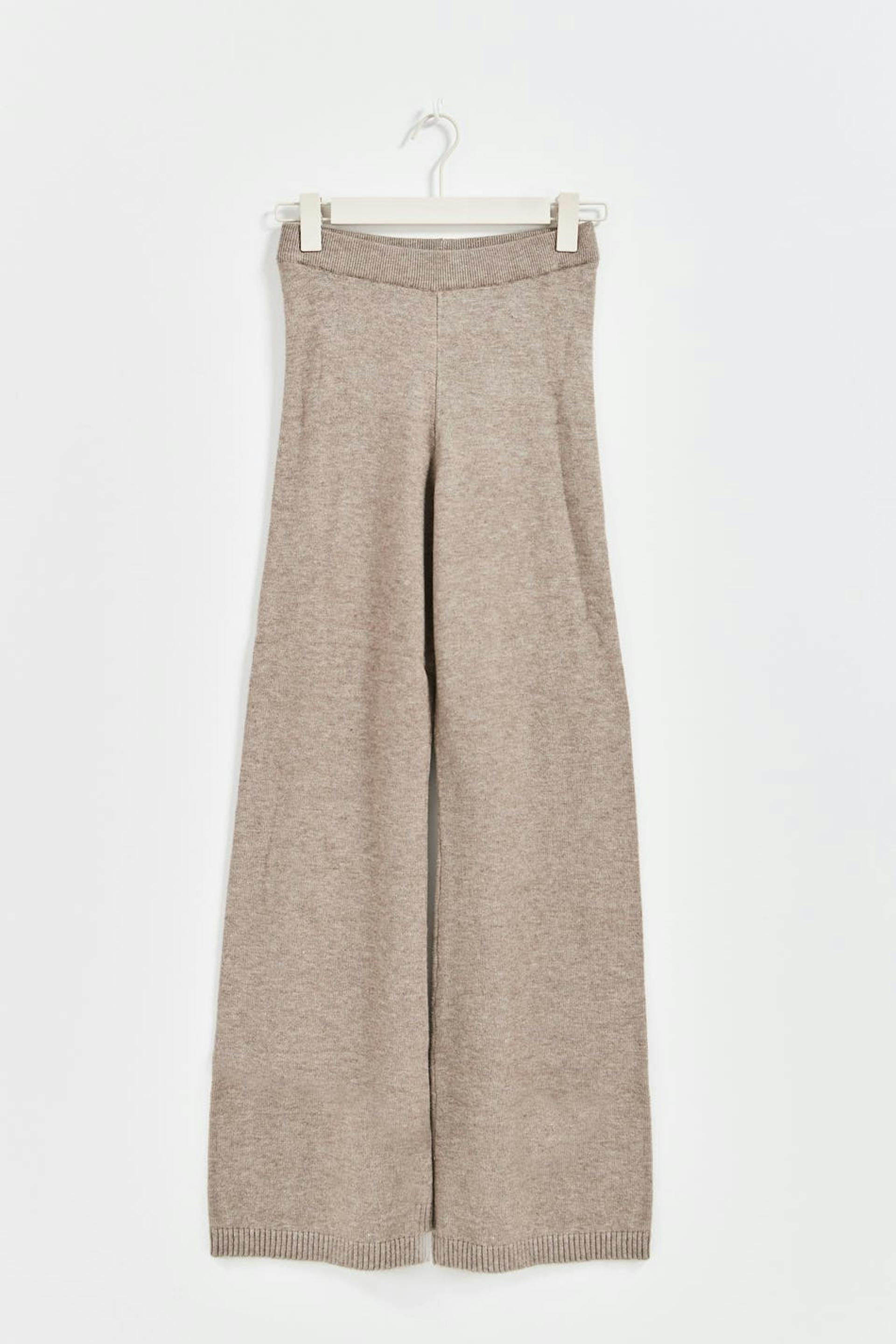 Mjukt stickade byxor med rak passform. Byxorna är beigea och har resår i midjan.