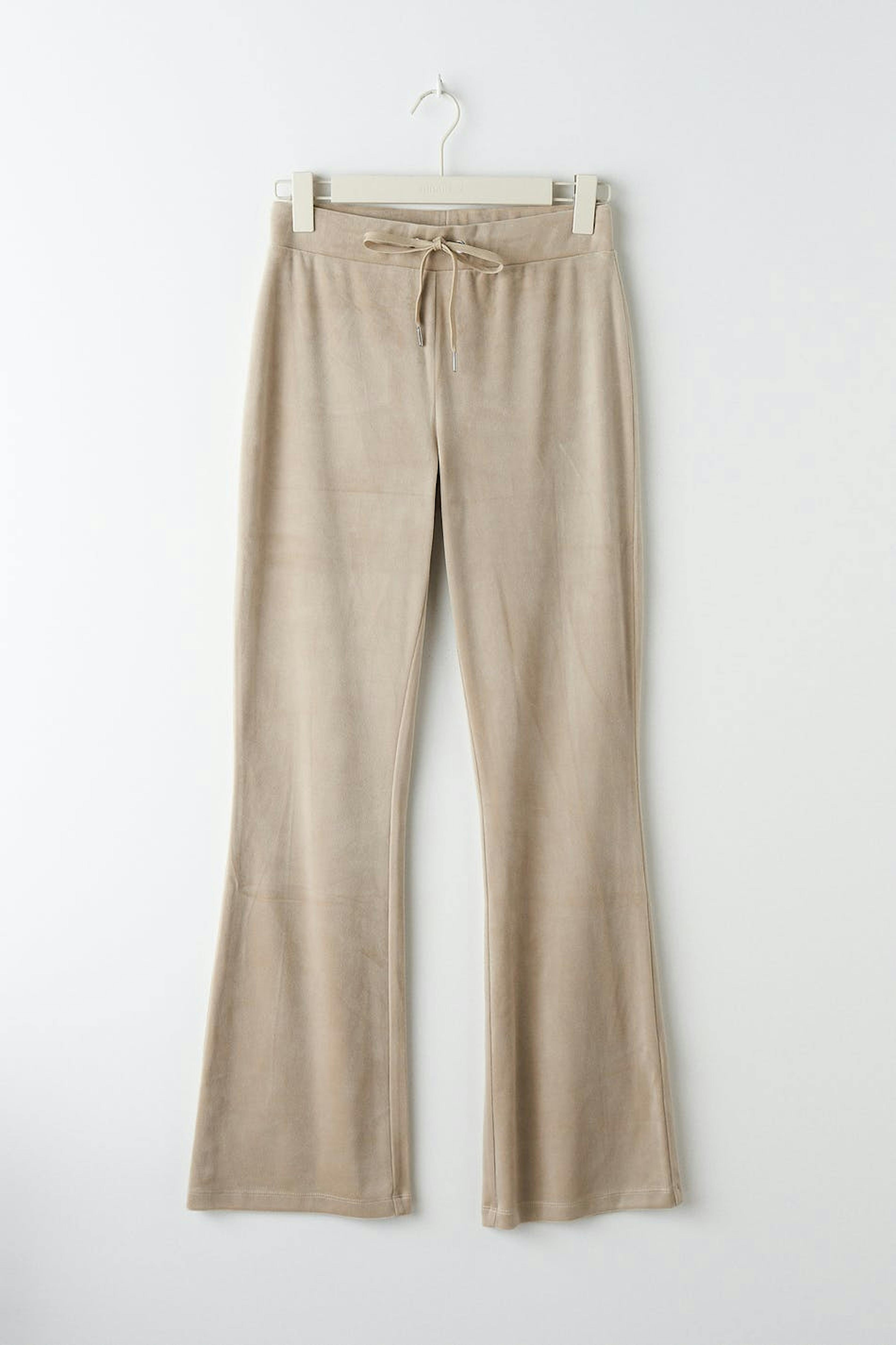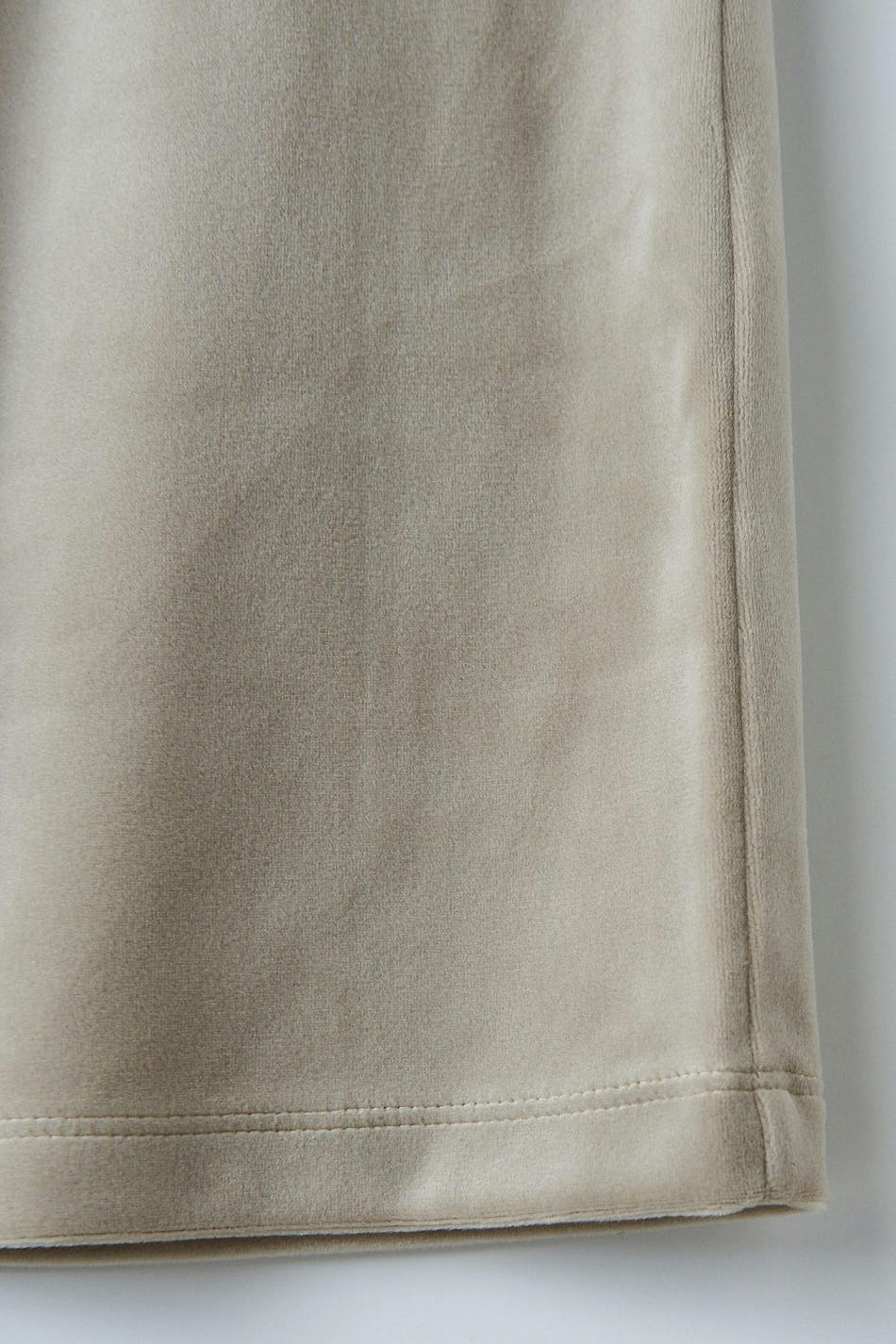 Mysbyxor i velour med fickor bak. Byxan är beige och har en resår i midjan med en knytning framtill.