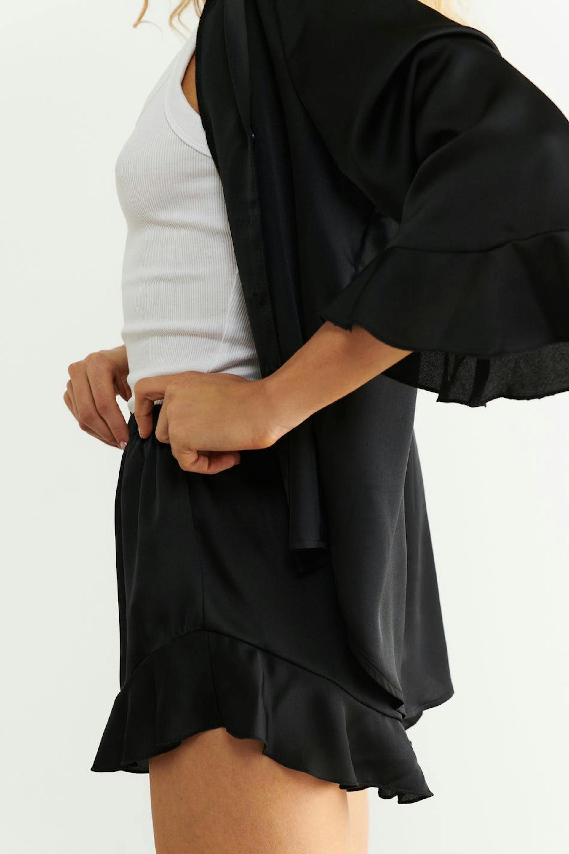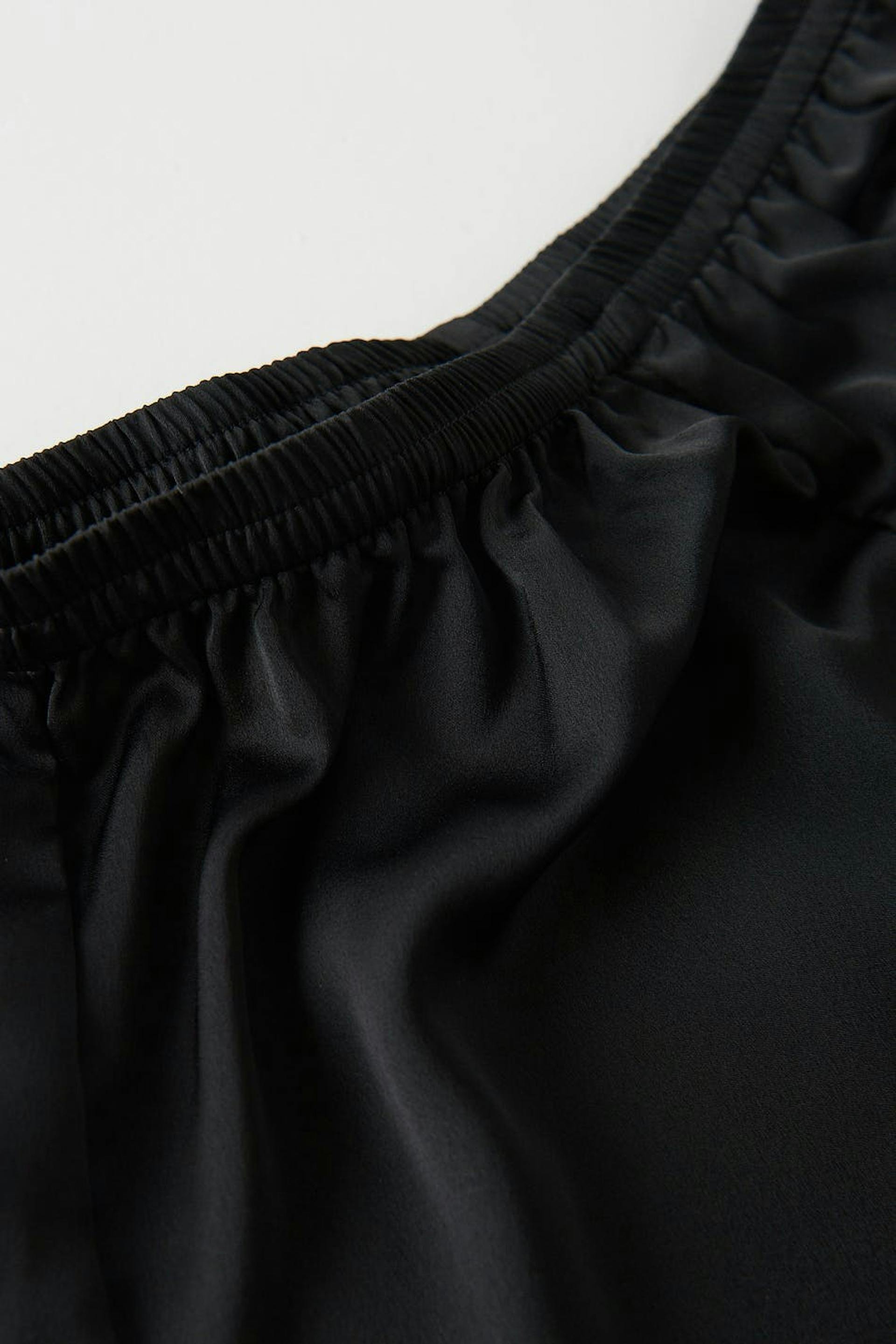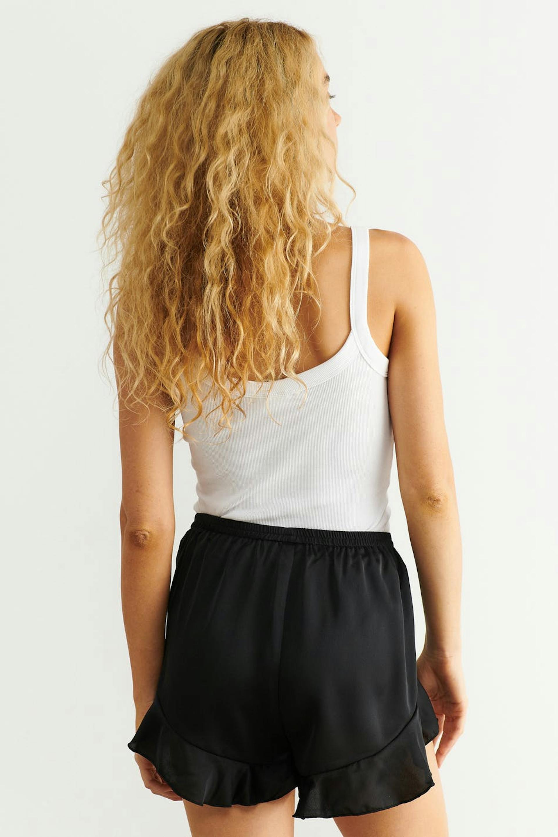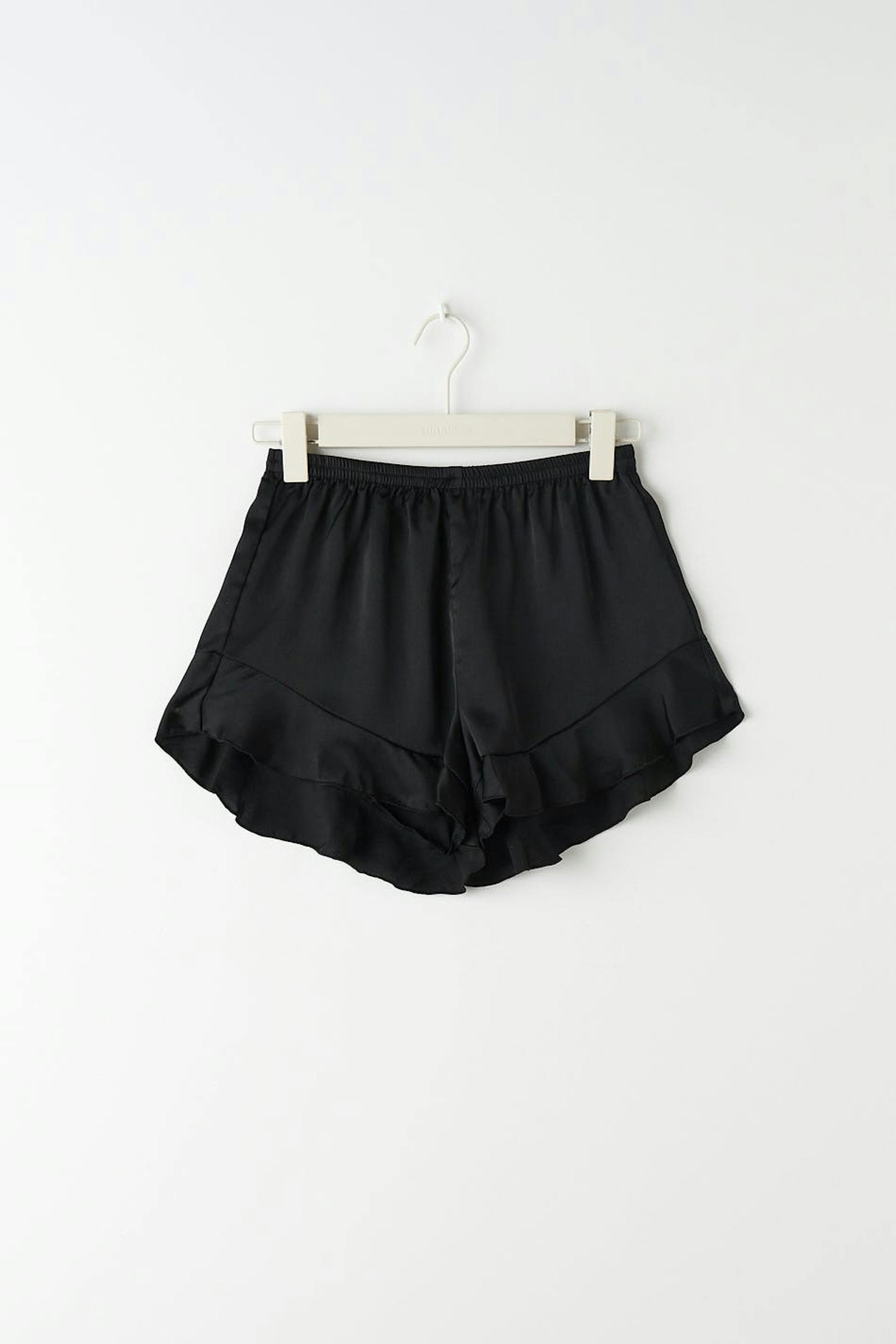 Korta pyjamasshorts i satin med resår i midjan. Shortsen är svarta och har volanger nedtill.