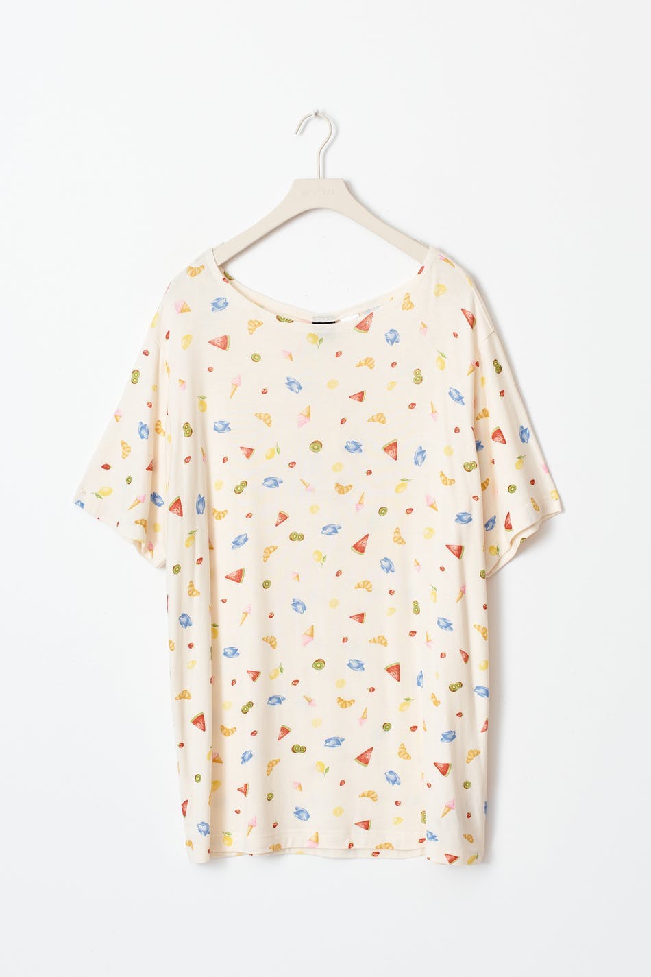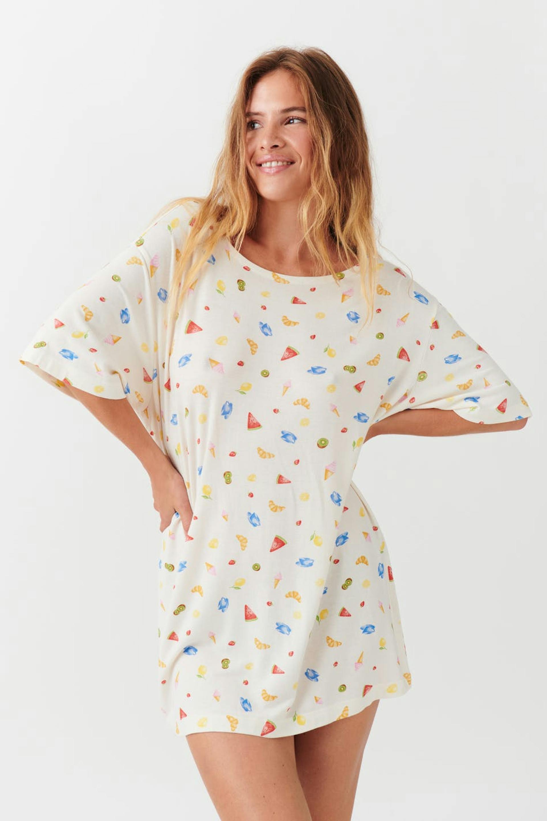 Mönstrad t-shirtklänning med båtringning. Klänningen är vit och har kort ärm. Den har oversize fit och nedhasad axel.