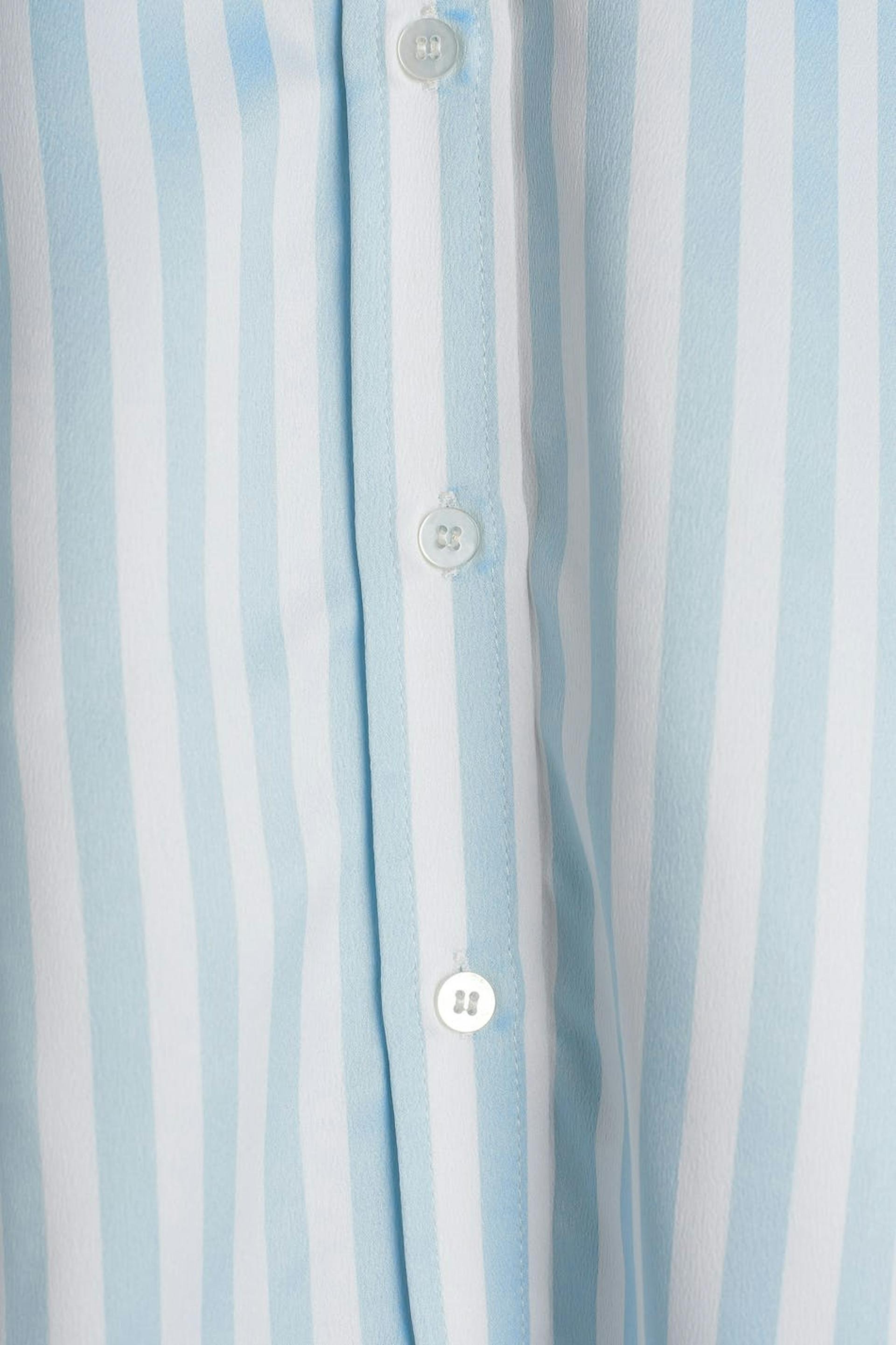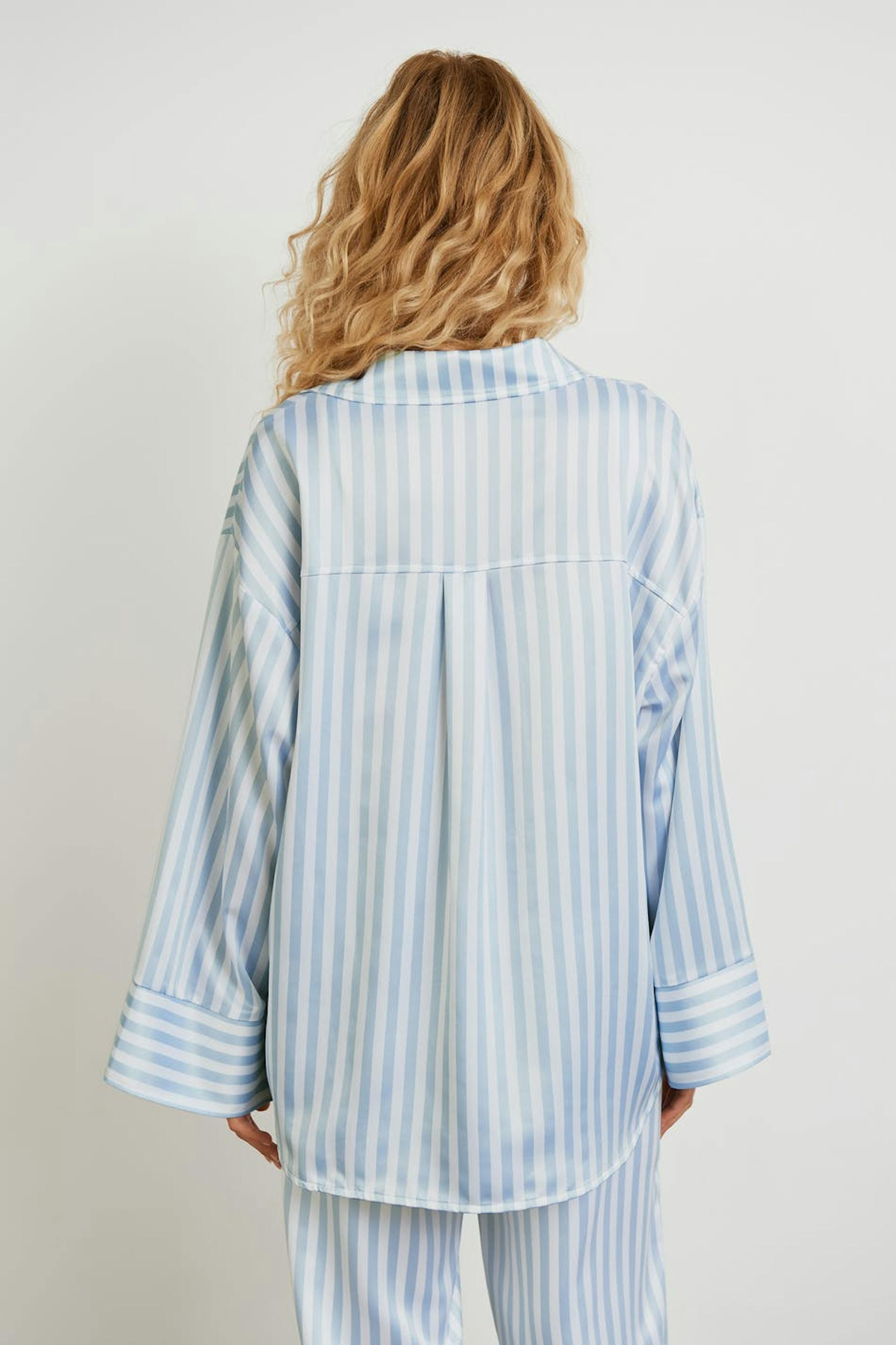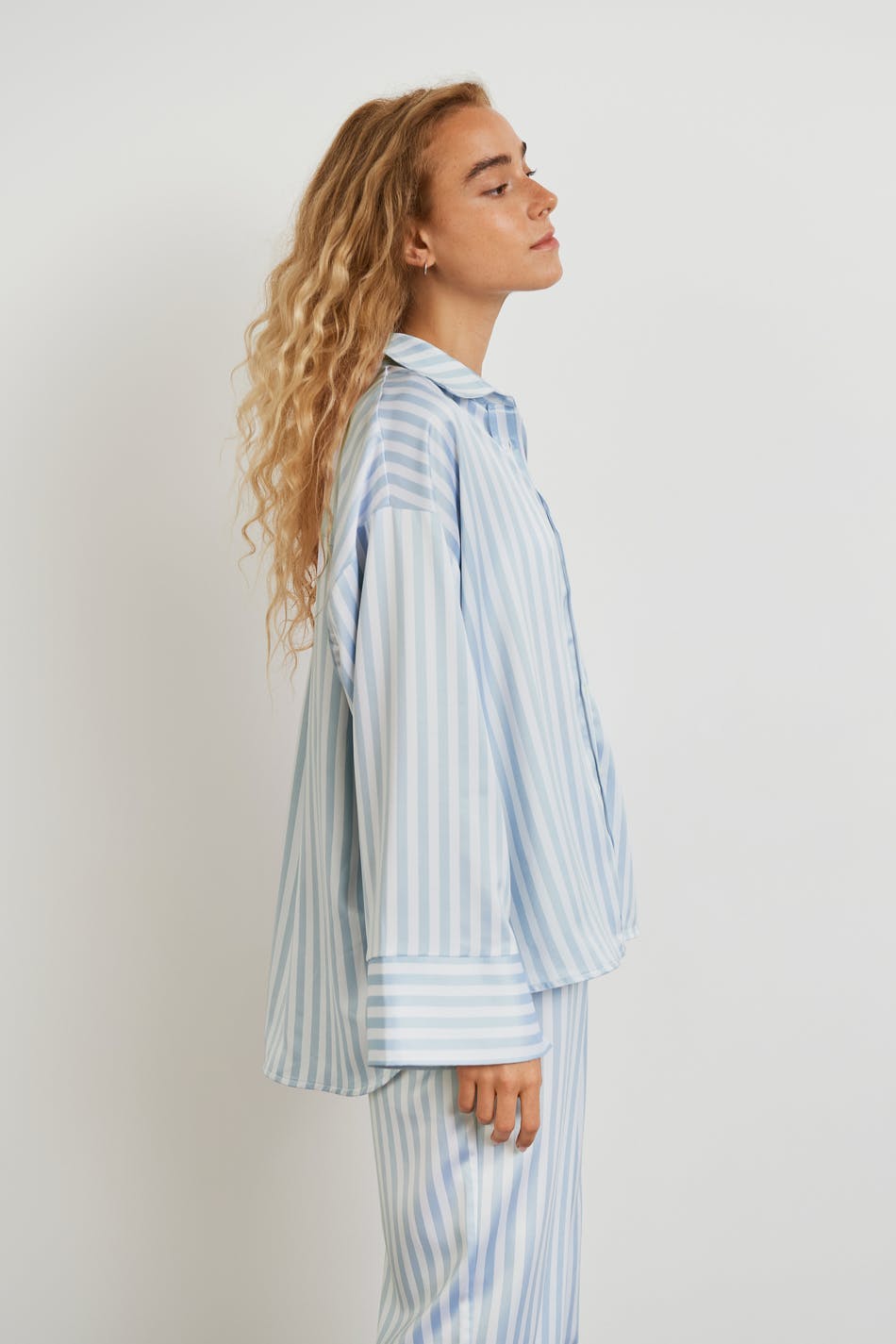 Randig pyjamasskjorta med satinkänsla. Skjortan är blå och oversized och har knappar fram. Den har en krage.