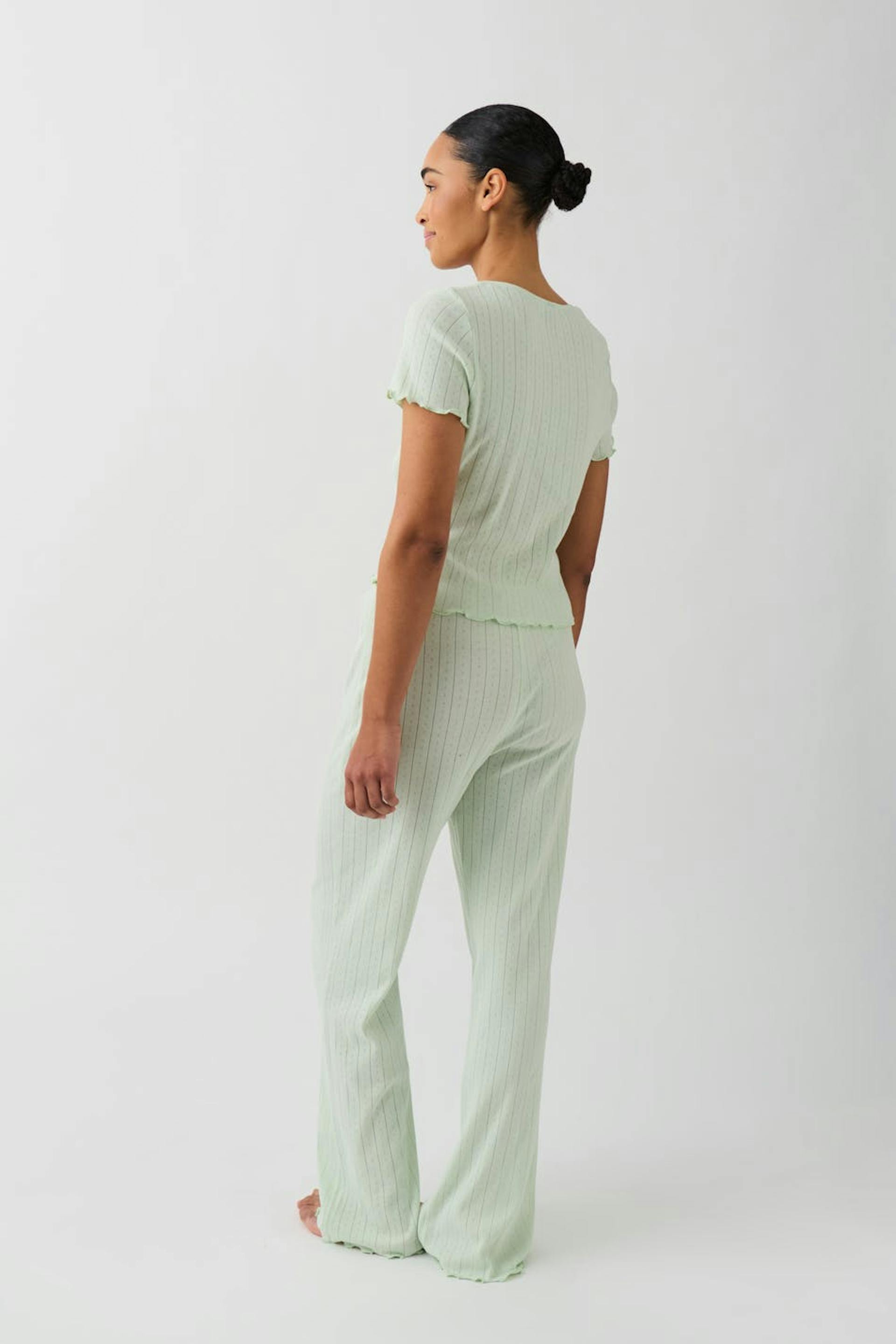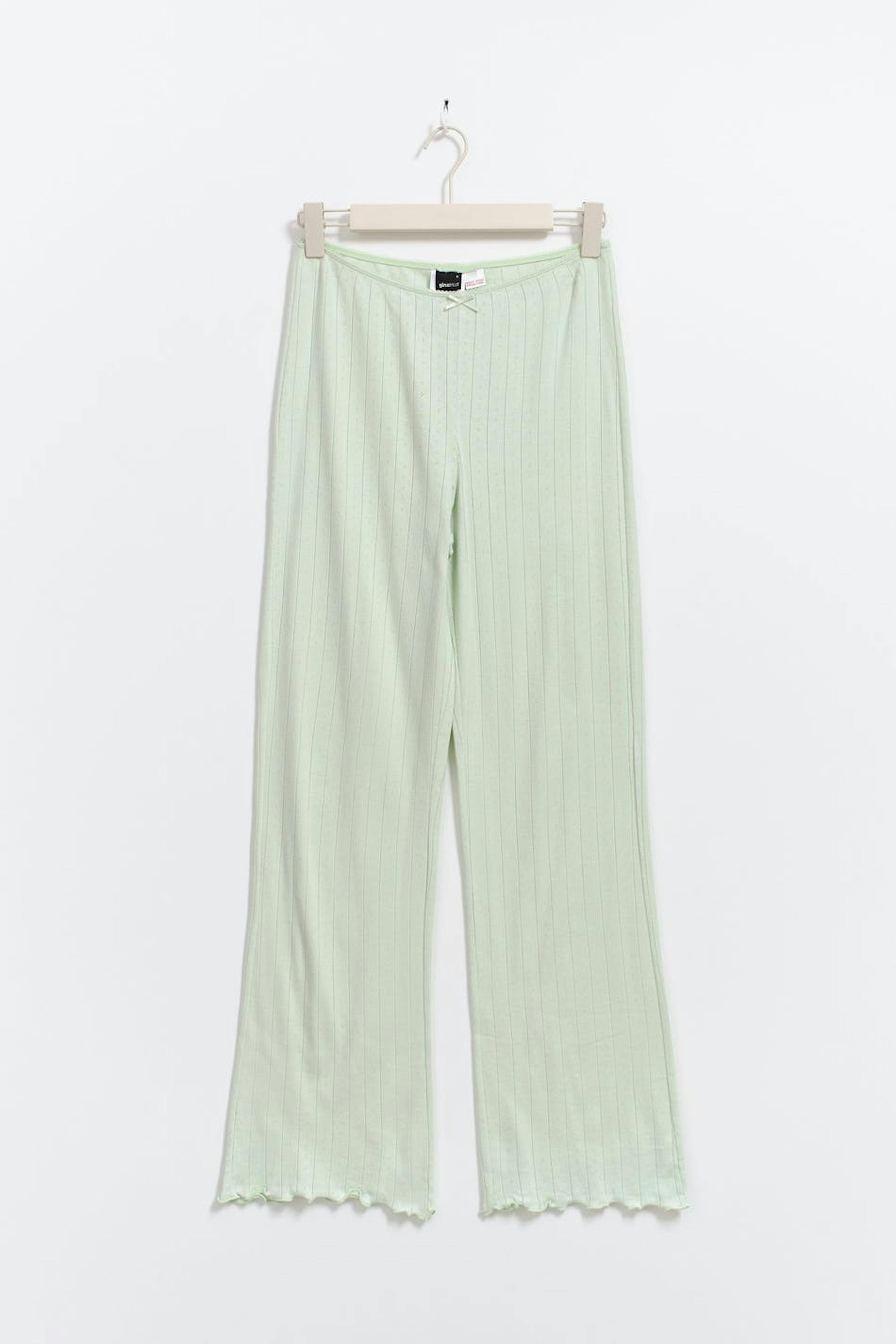 Pyjamasbyxor med en krusning längst ner med en rosett i midjan. Pyjamasen är grön och har en ribbdesign.