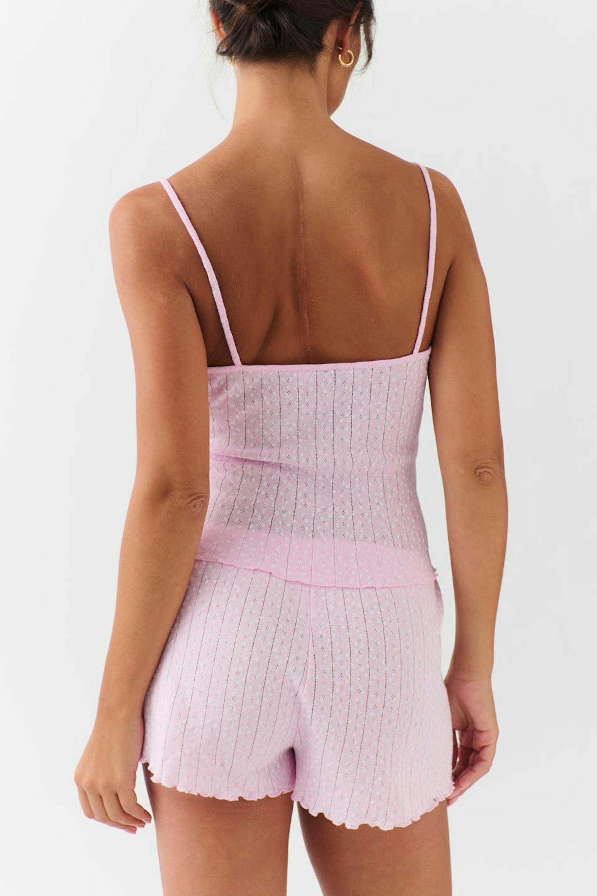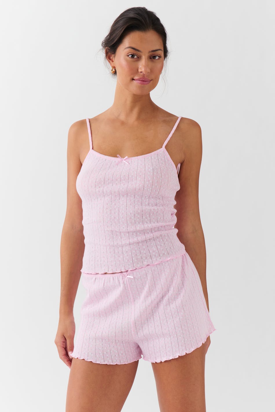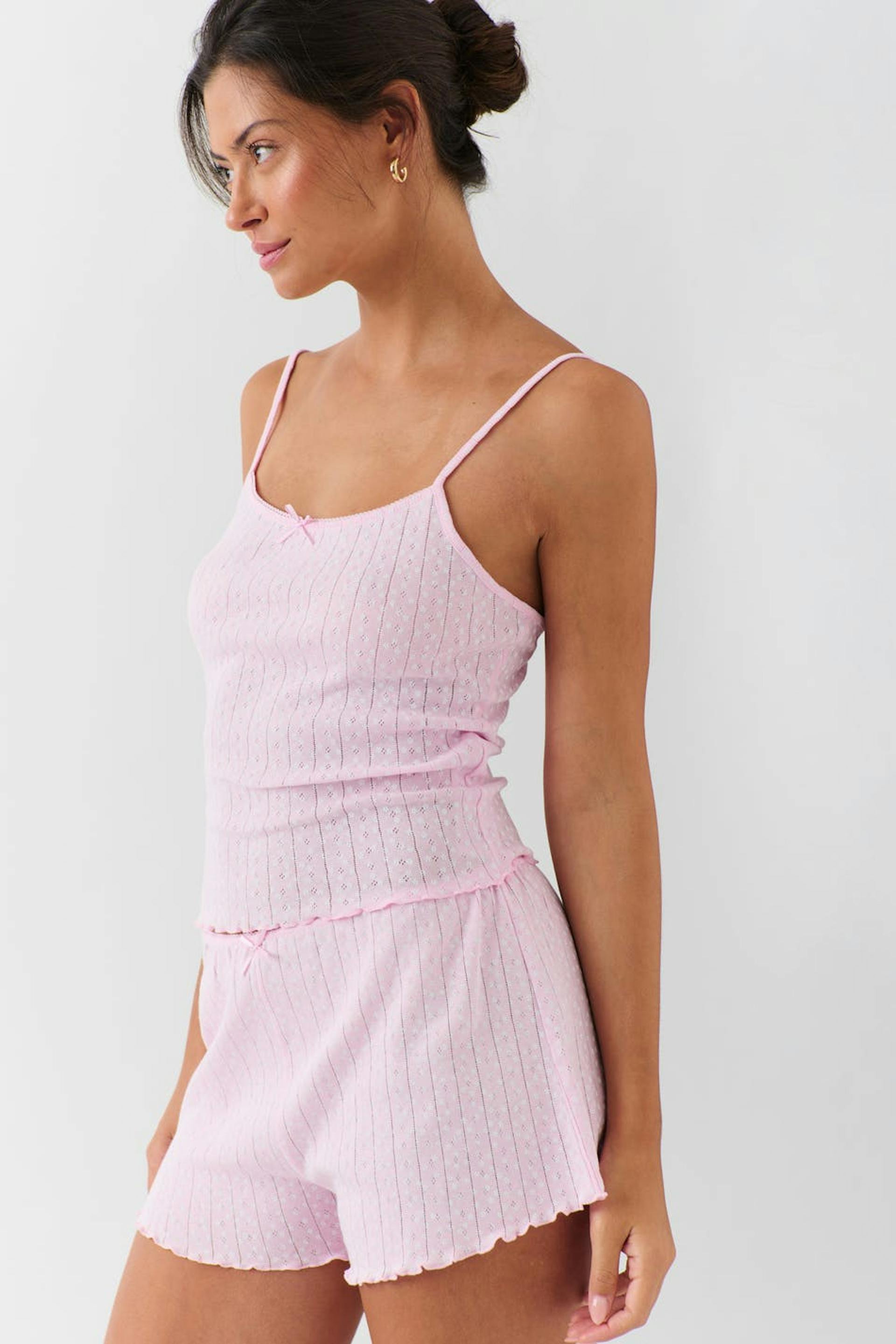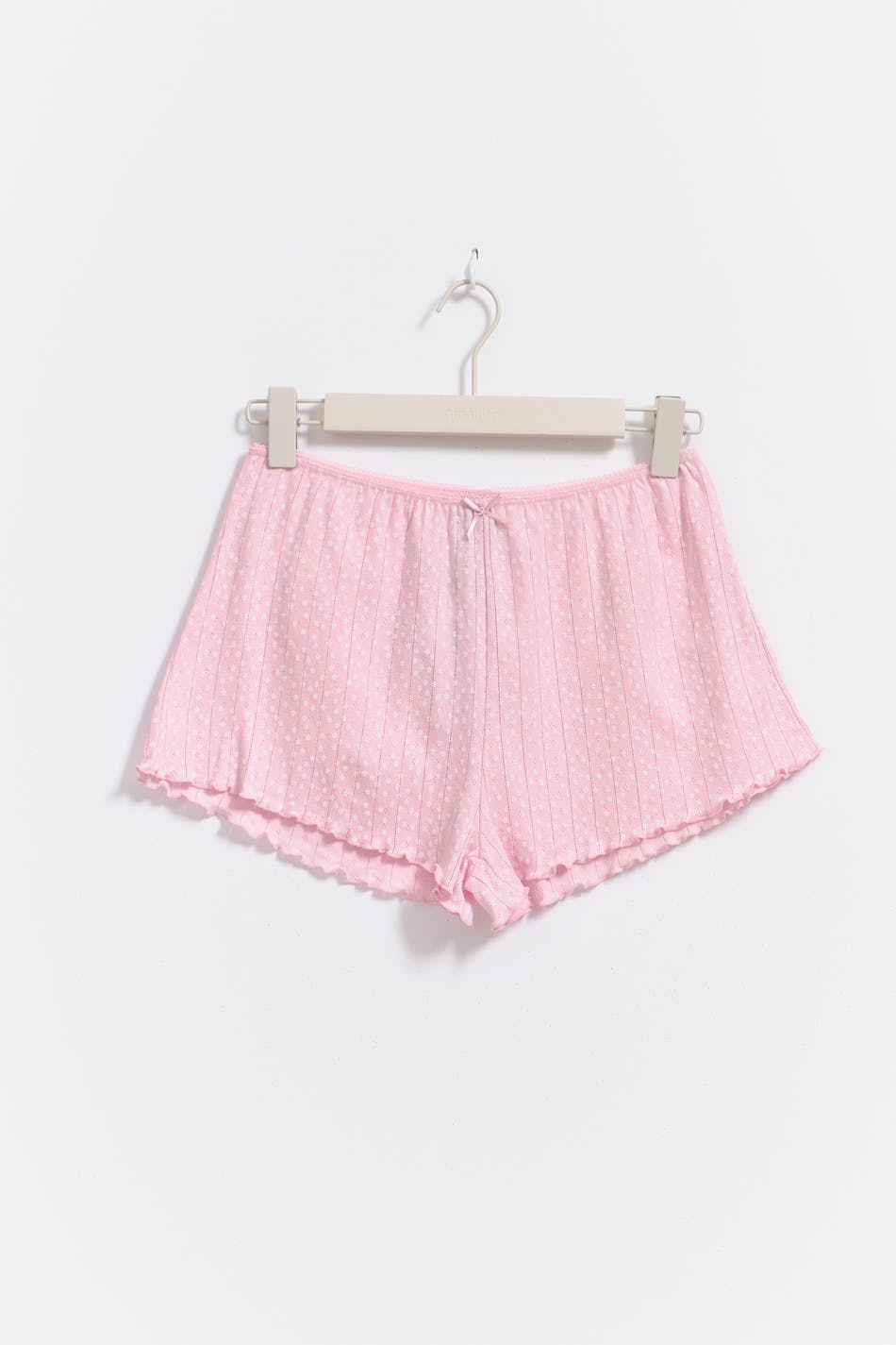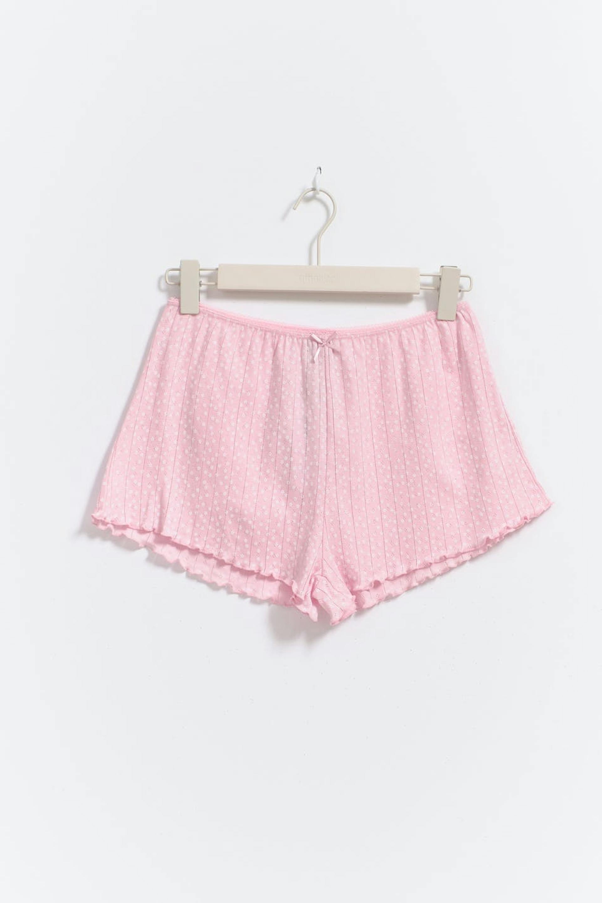 Prickiga pyjamasshorts med rosettdetalj framtill. Shortsen är rosa, pointellestickade och korta. De har resår i midjan och overlockad nederkant.