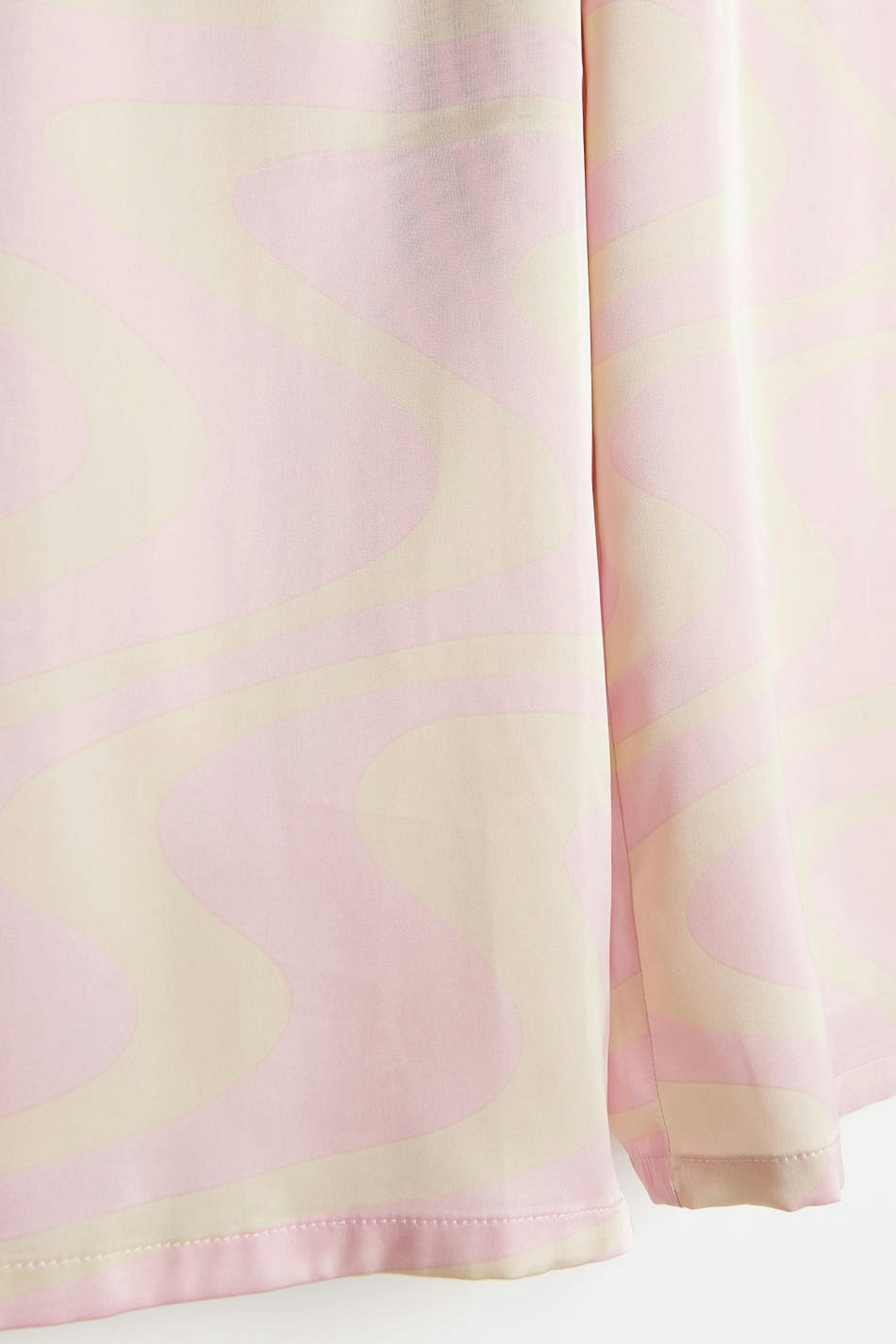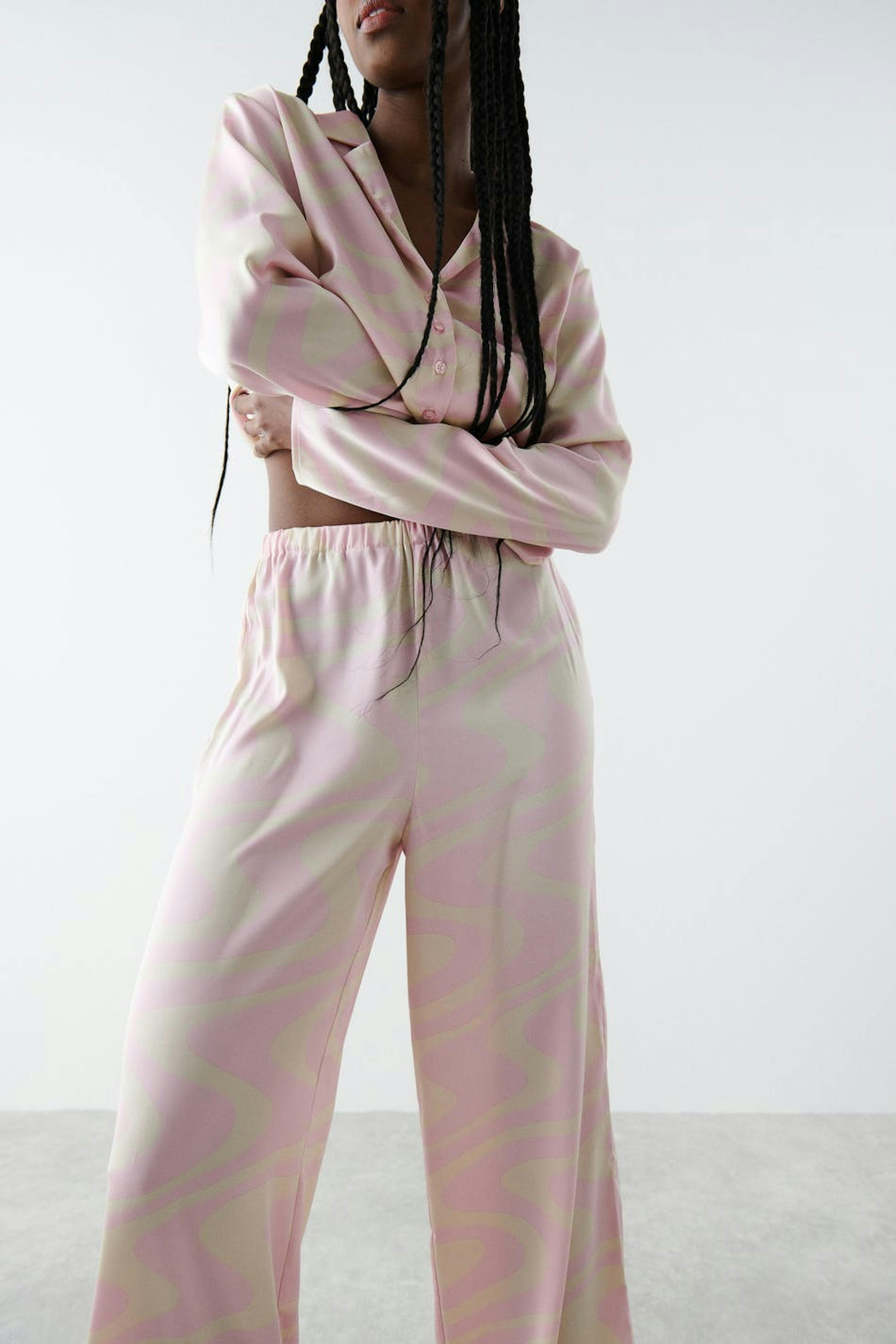 Mjuka pyjamasbyxor med en vävd kvalitet i satin. Pyjamasbyxorna är rosa och har ett dekorativt vågmönster. De har raka ben och resår i midjan.