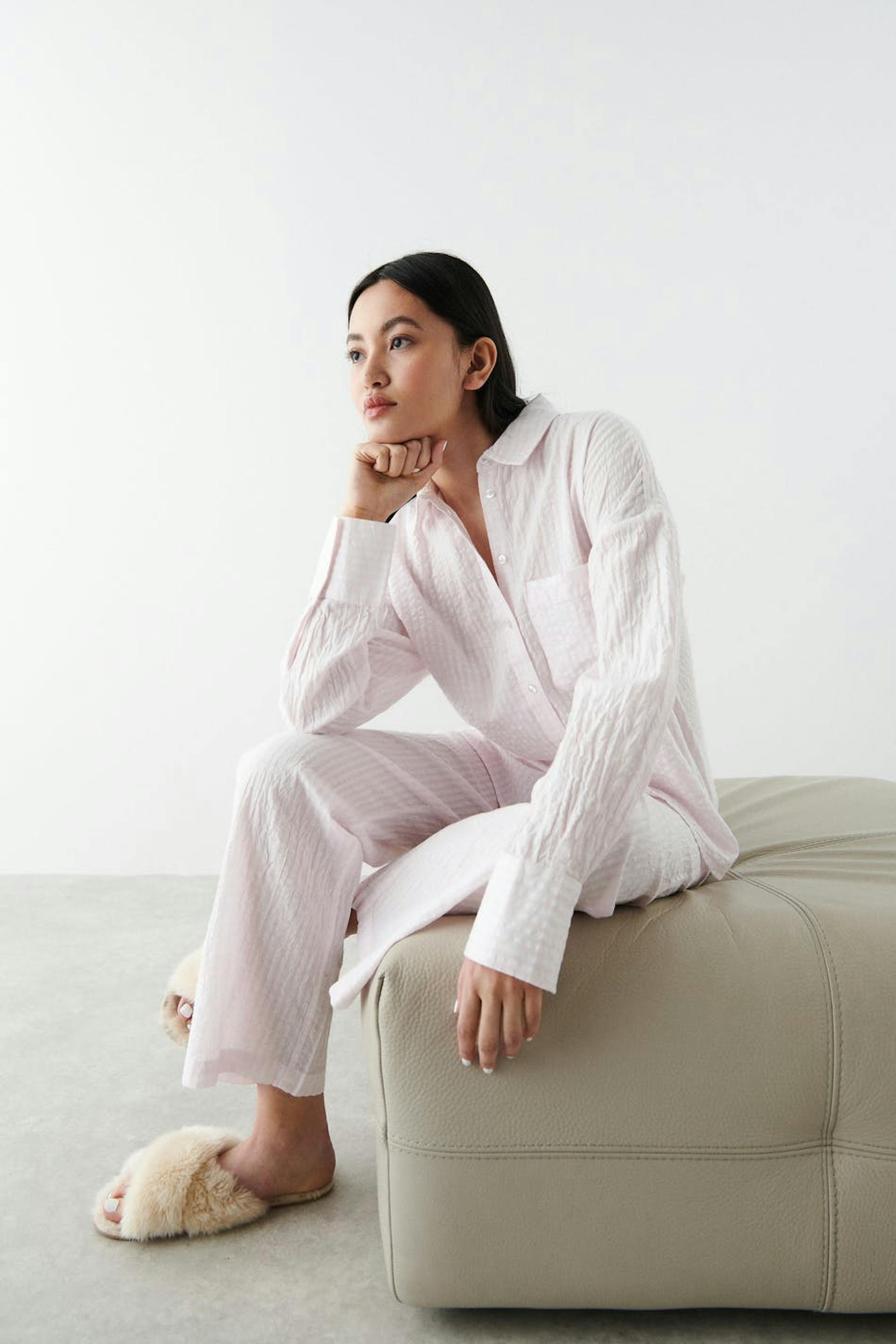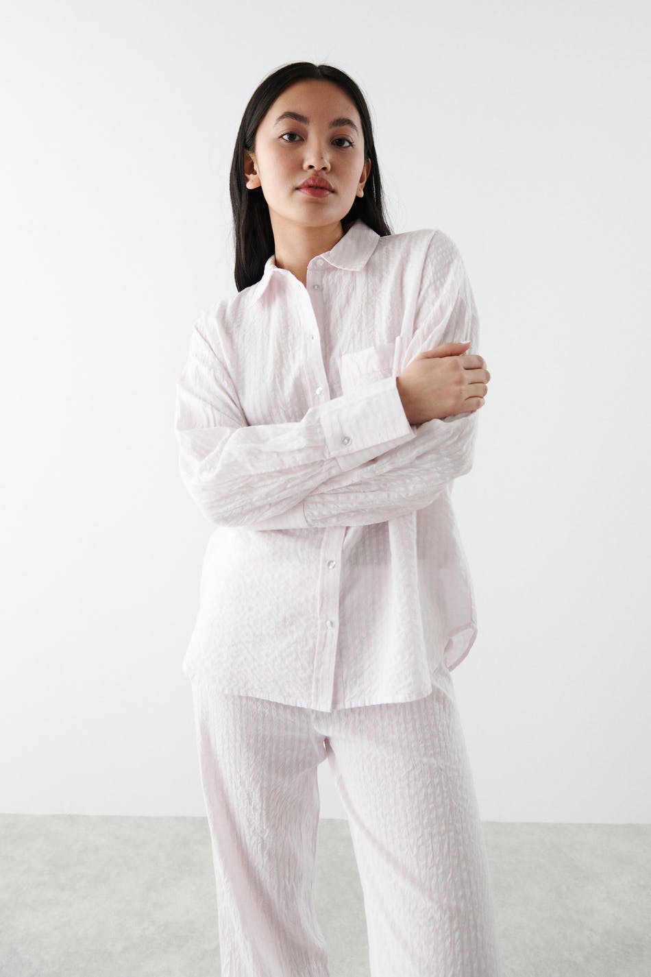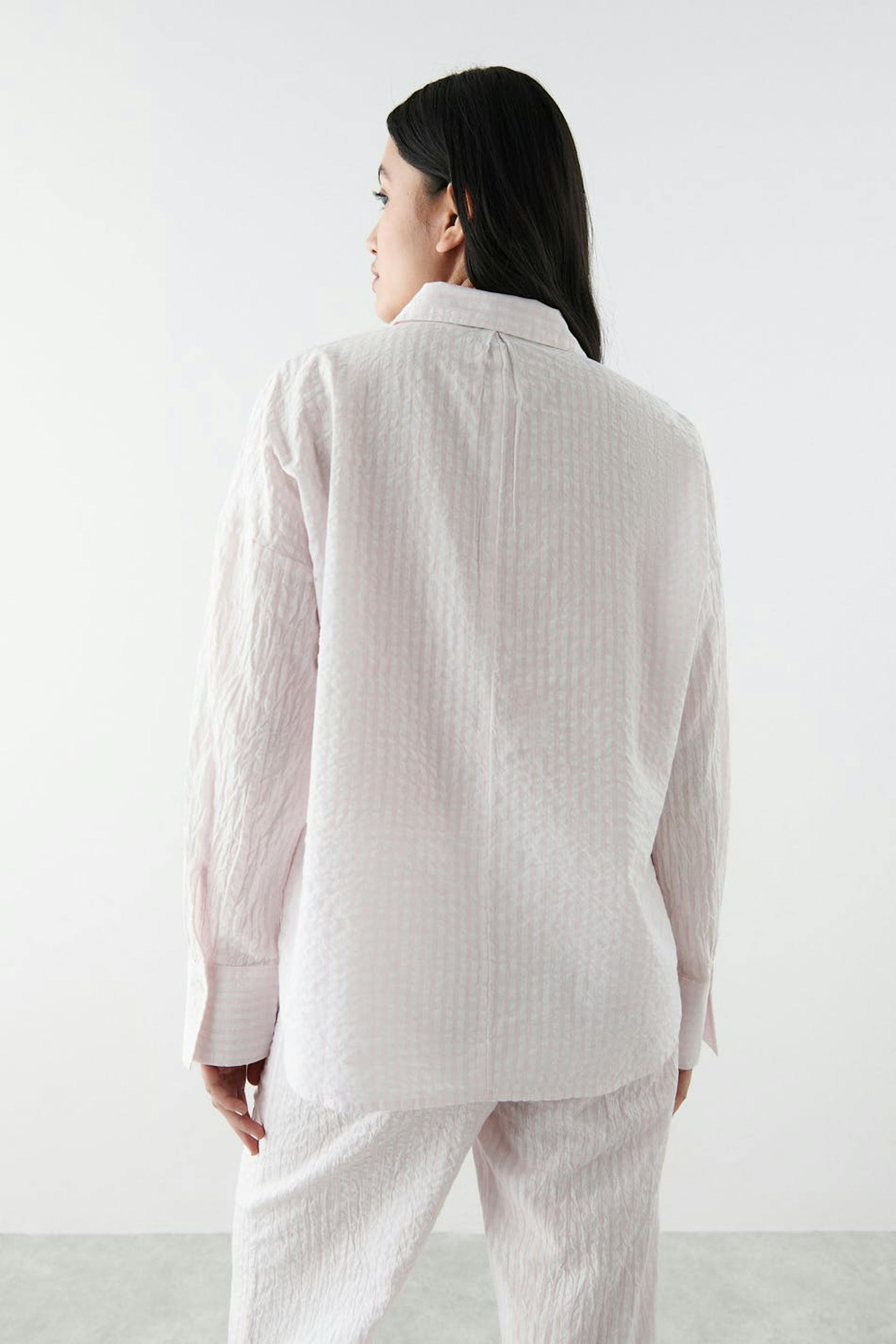 Lång pyjamasskjorta i seersucker-kvalitet med oversize fit. Skjortan är rosa och har knappstängning fram. Den har en bröstficka och manschetter med knäppning.