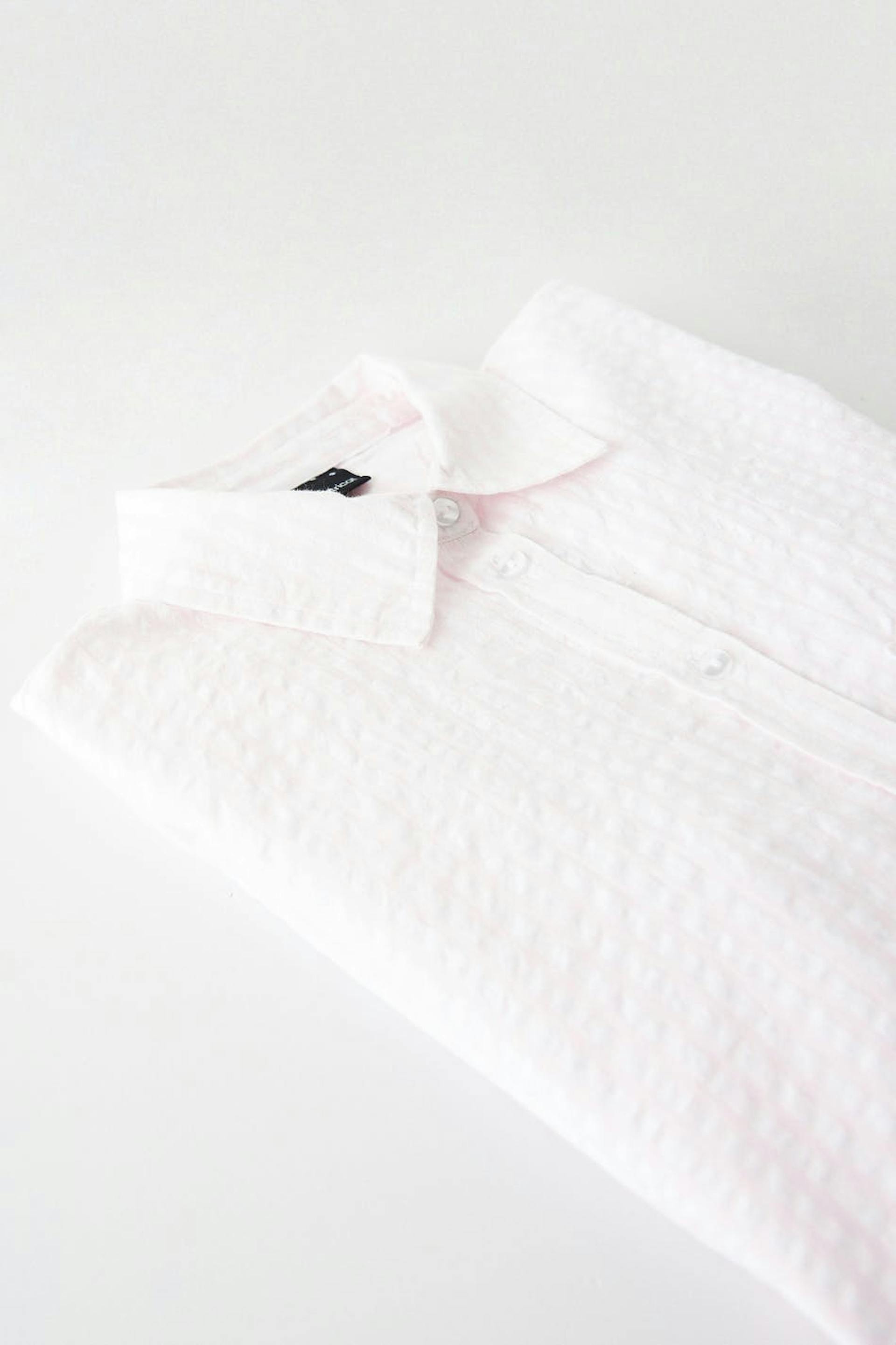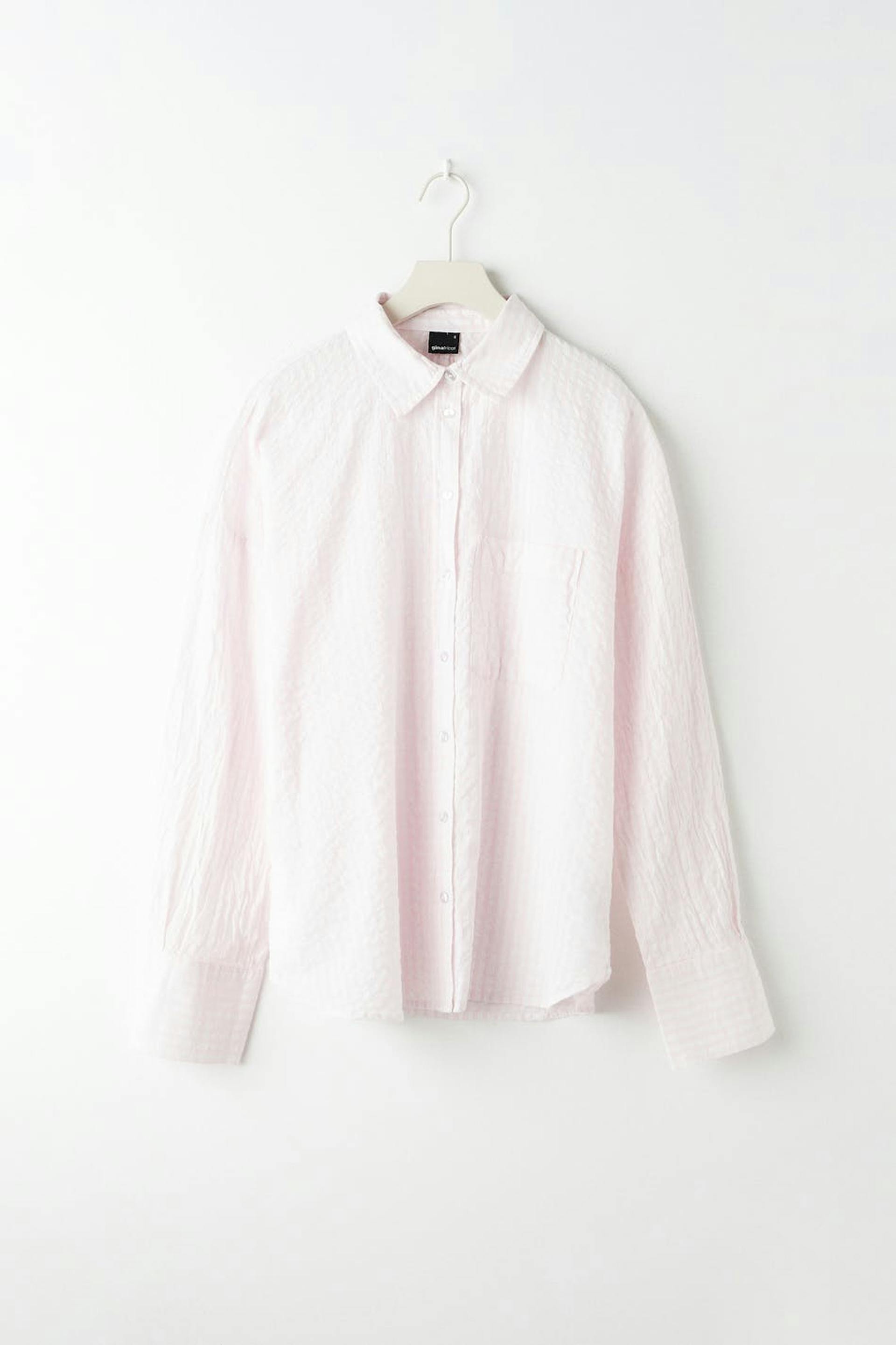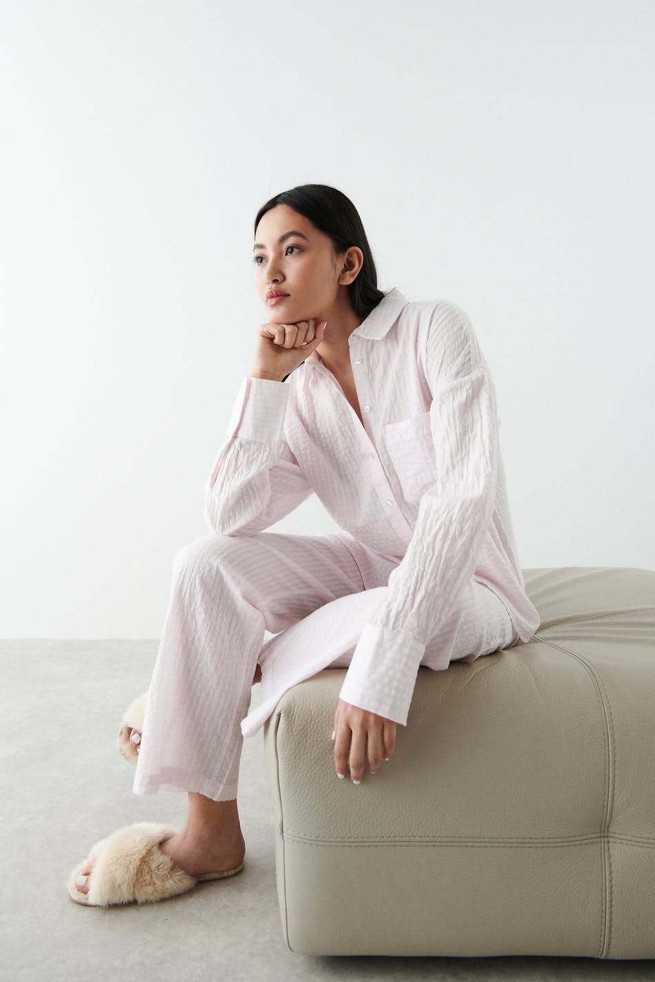 Lång pyjamasskjorta i seersucker-kvalitet med oversize fit. Skjortan är rosa och har knappstängning fram. Den har en bröstficka och manschetter med knäppning.