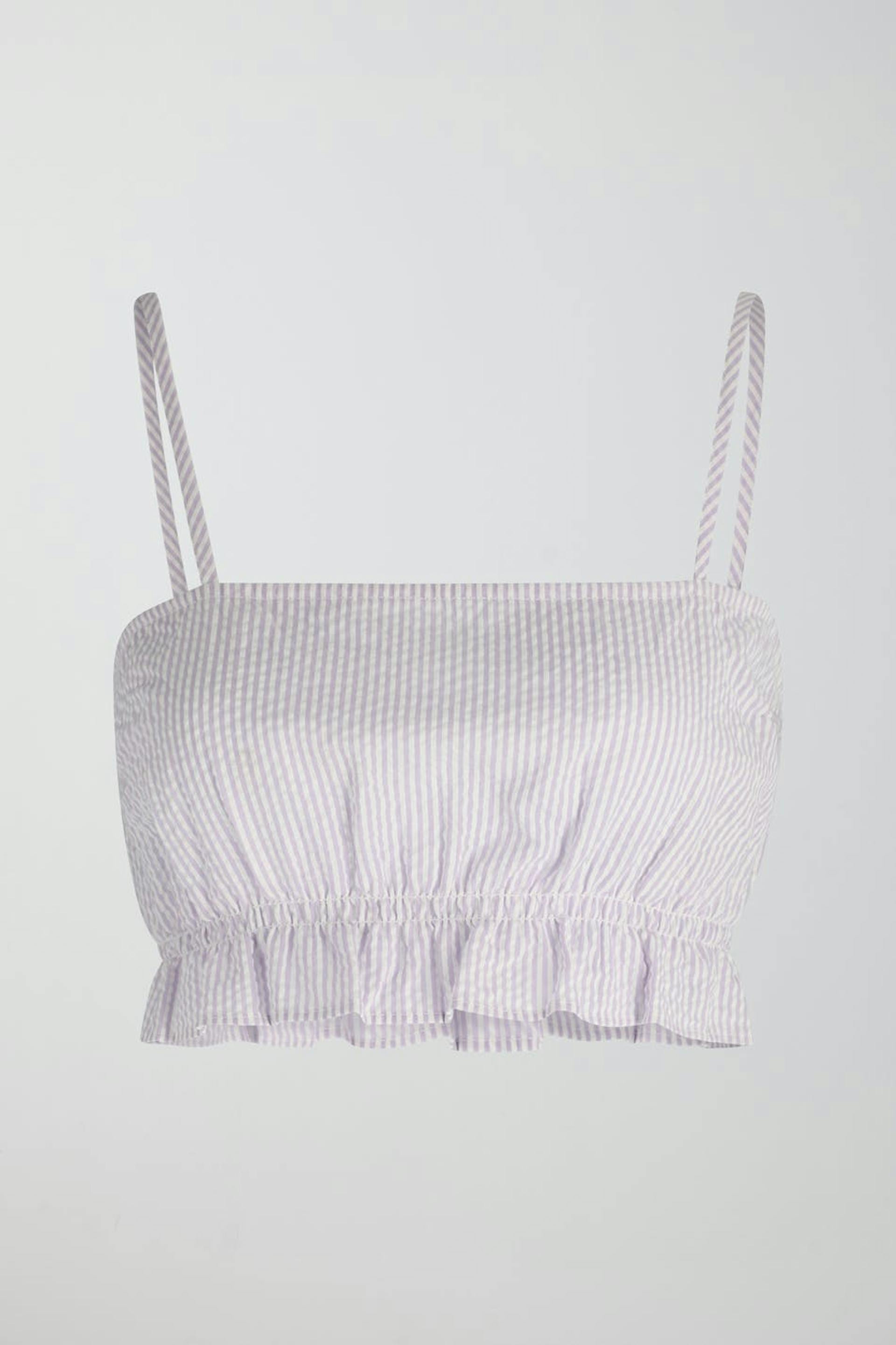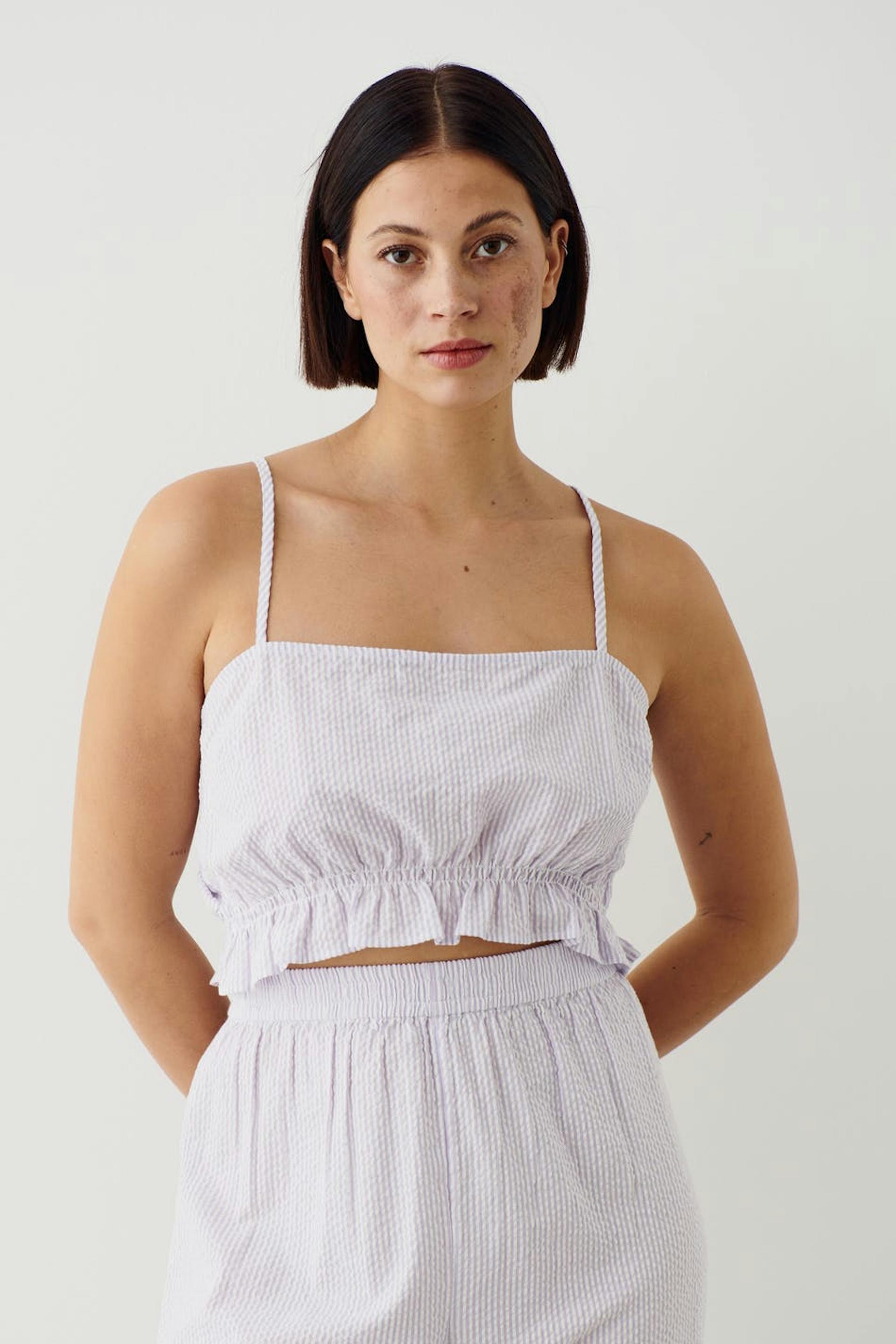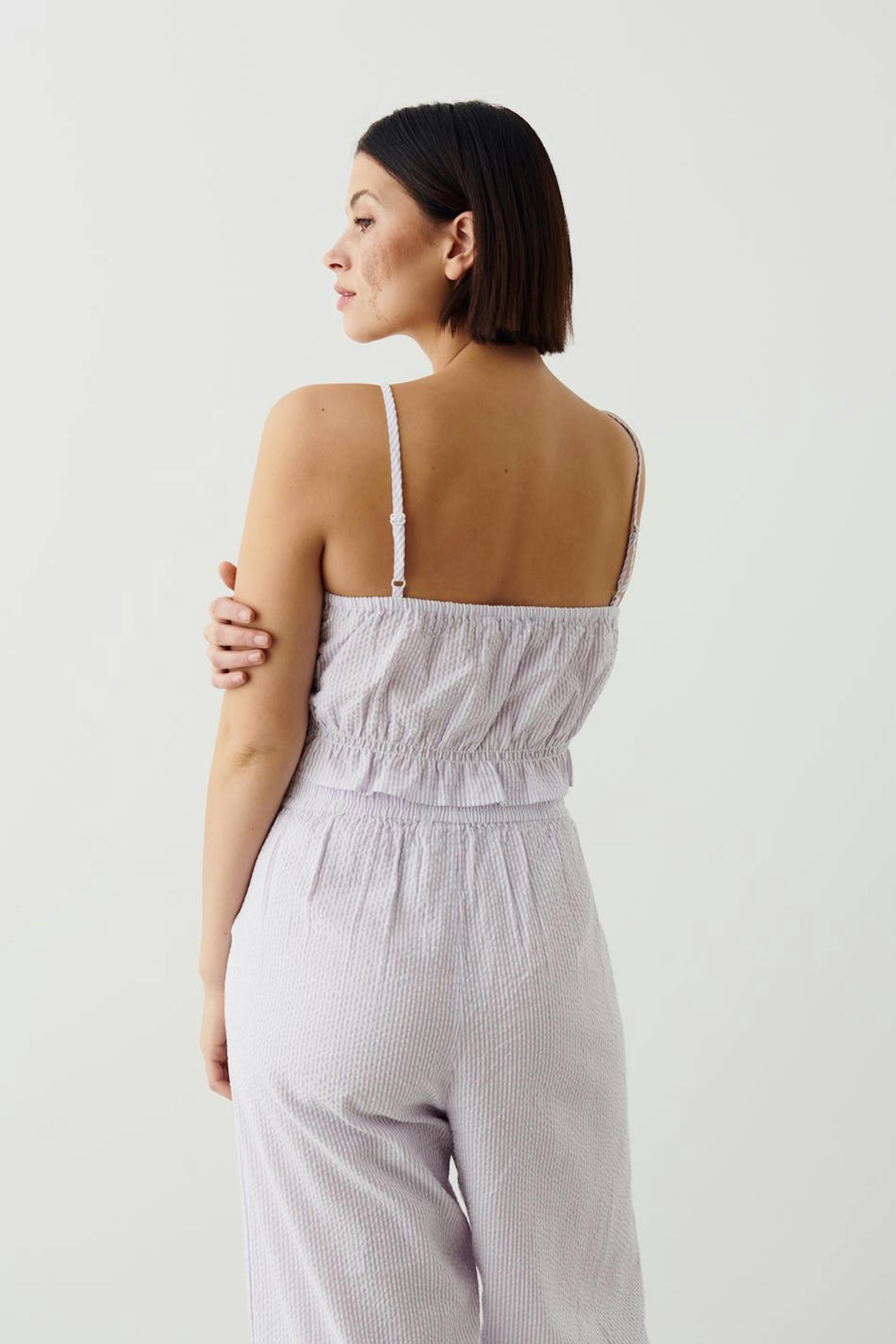 Randig pyjamastopp i bäckebölja med volanger i nederkant. Toppen är lila och har resår under bysten. Den har reglerbara axelband och en croppad längd.