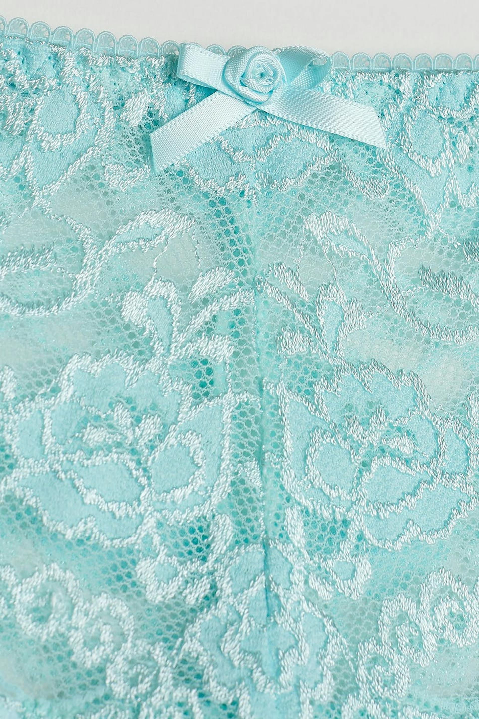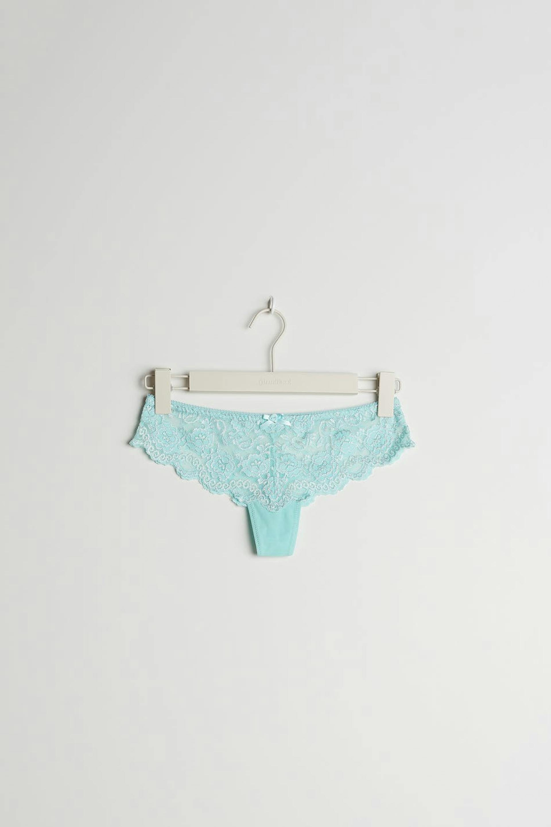 Trosor med en foder i bomull i grenen. Trosorna är turkosa. De är gjorda av spets.