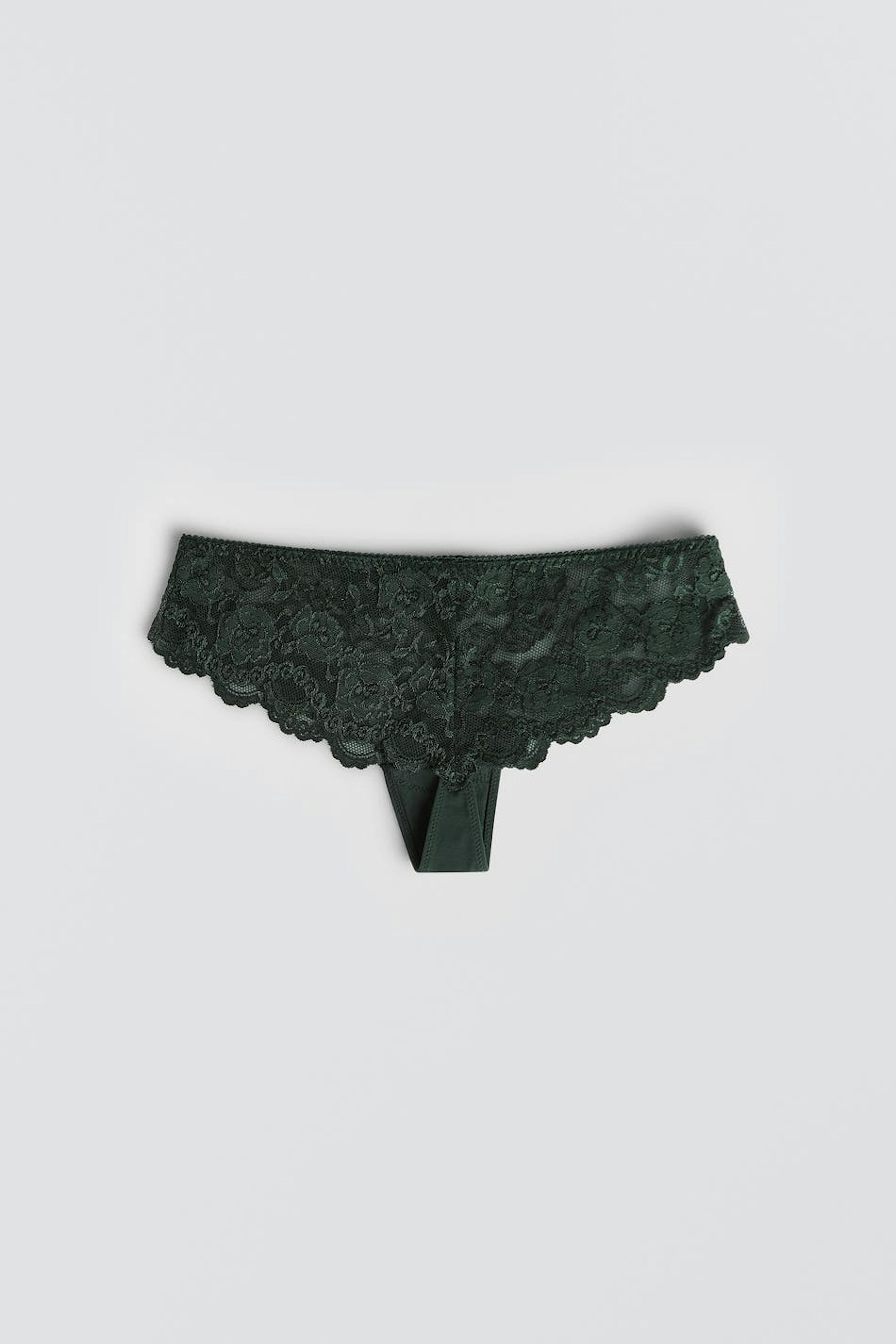 Trosa med en foder i bomull i grenen. Trosan är grön. Den är gjord av spets.