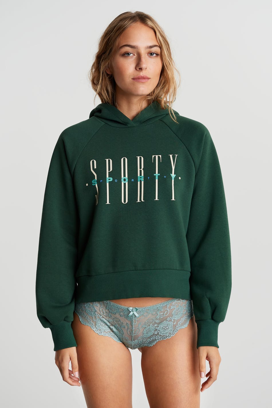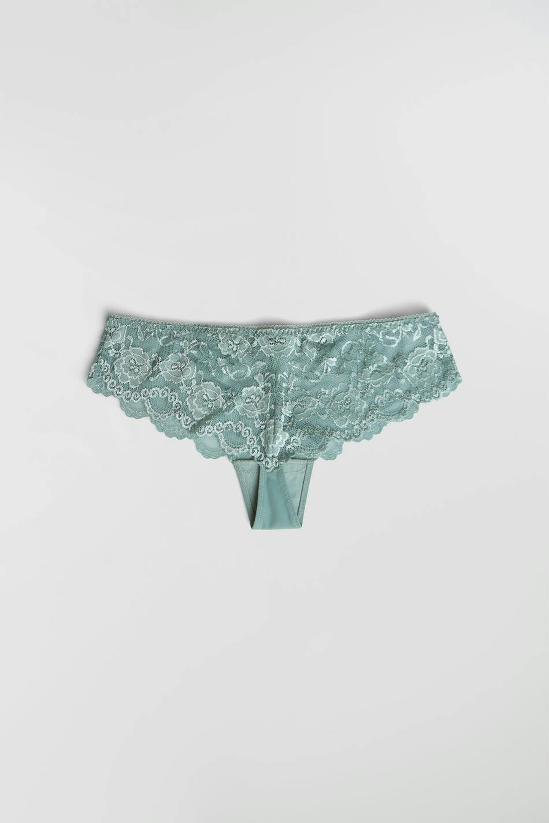 Trosa med en foder i bomull i grenen. Trosan är grön. Den är gjord av spets.