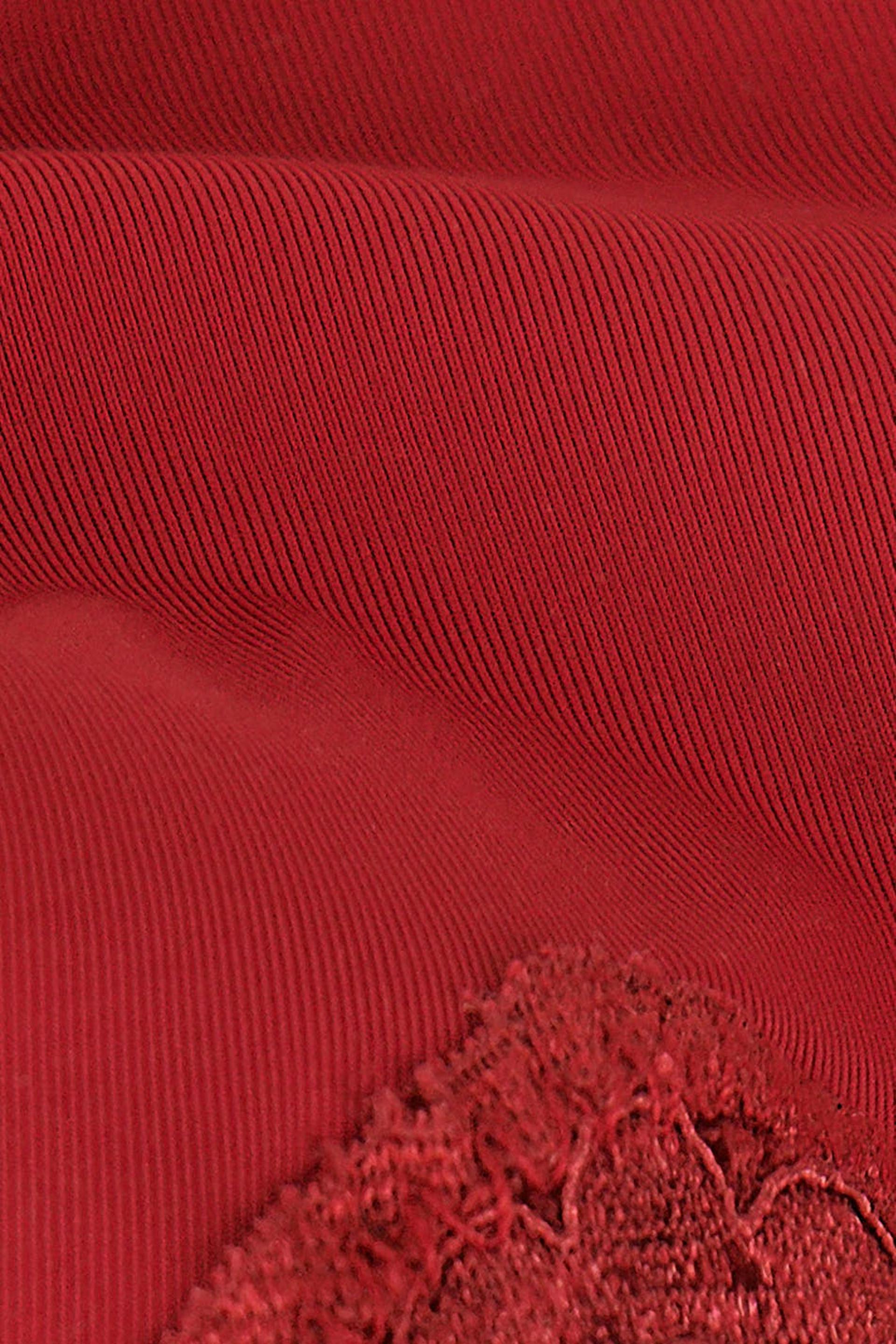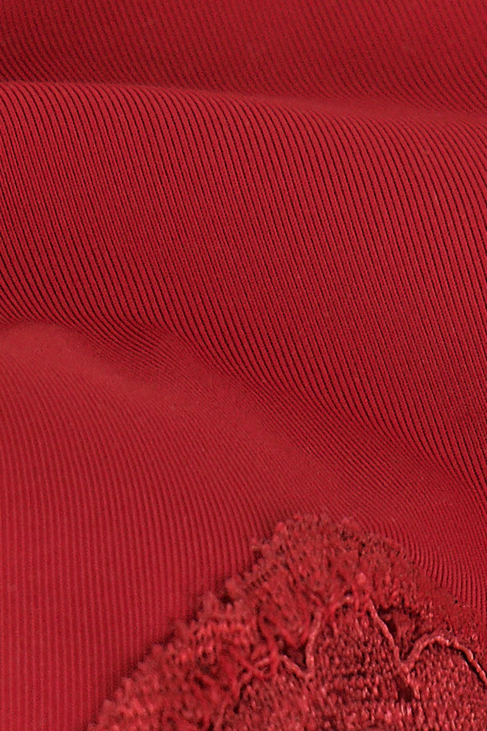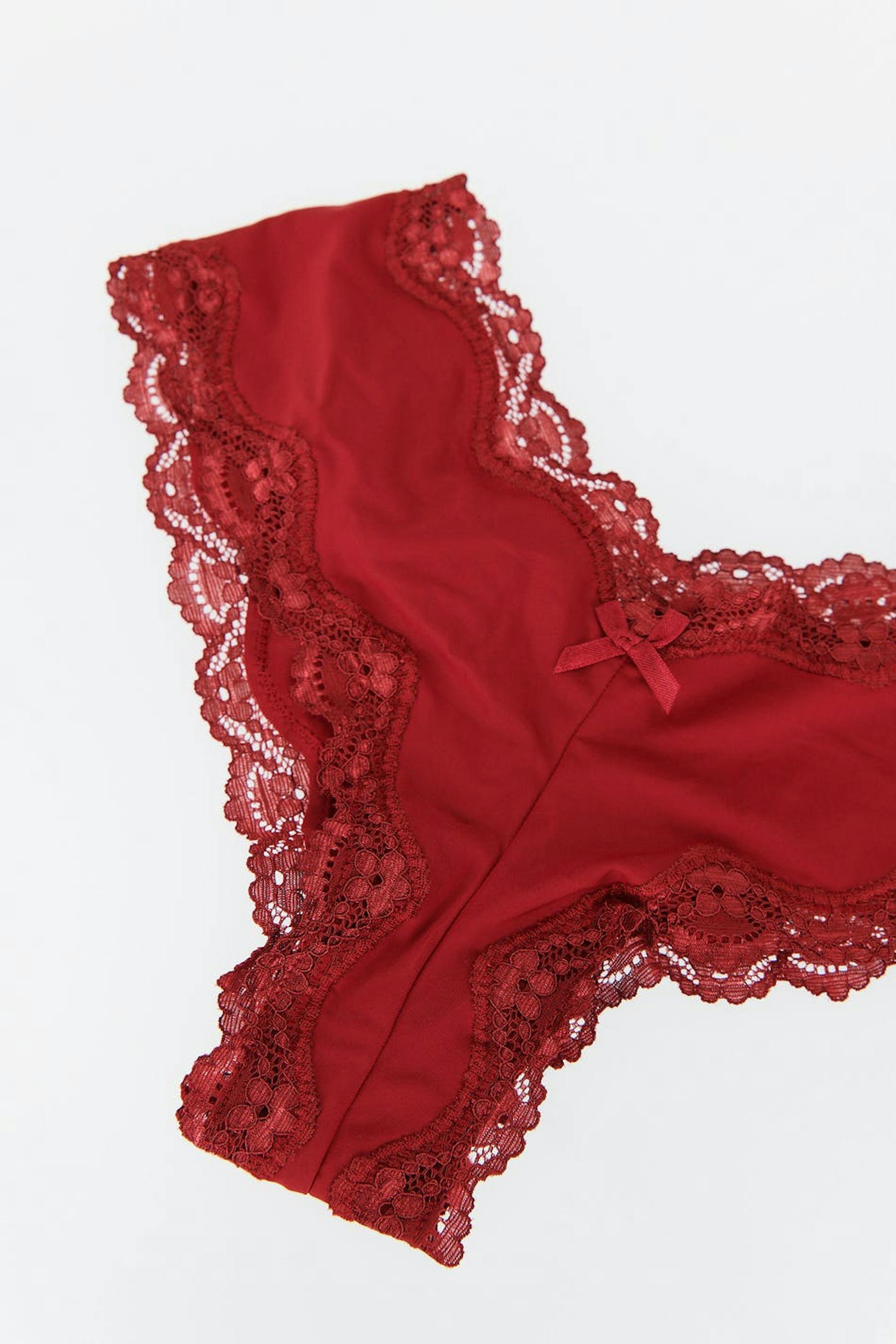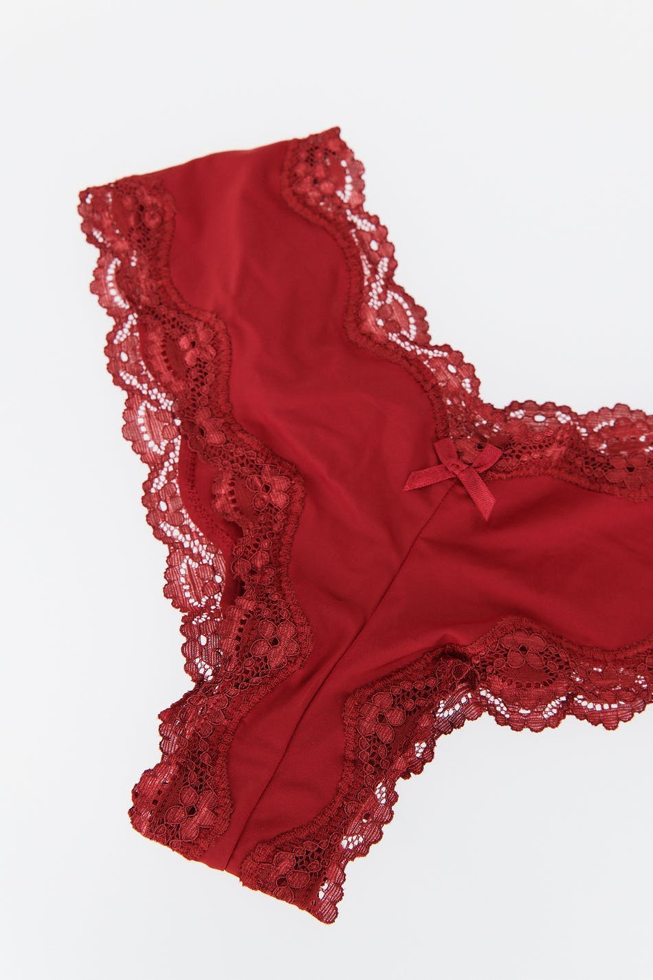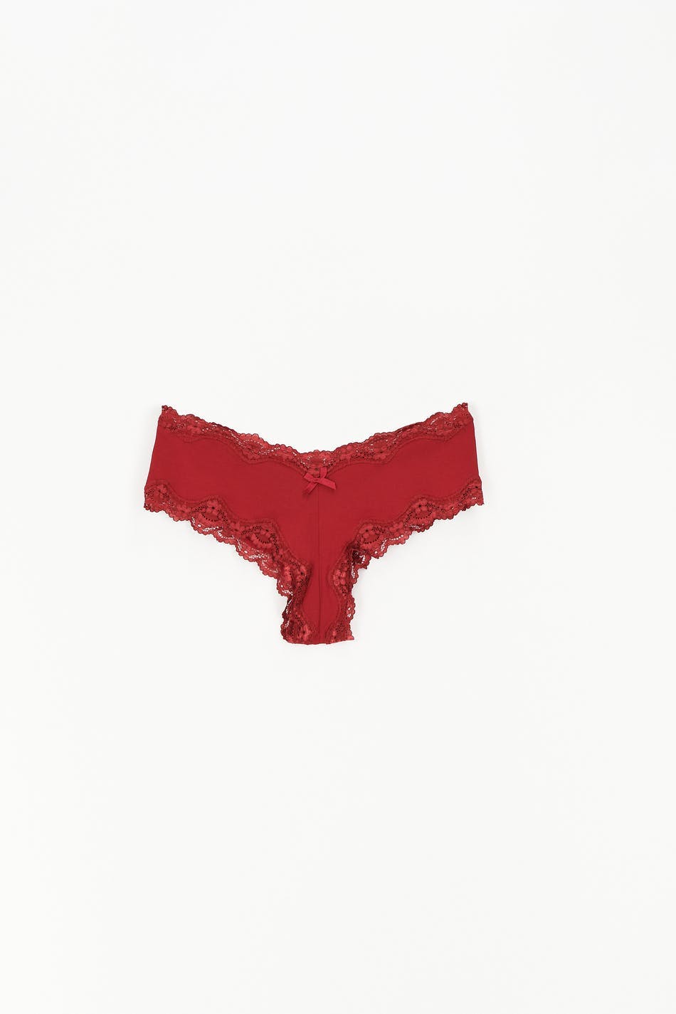 Mjuka braziliantrosor i microfiber med spetskanter. Braziliantrosorna är röda och har en liten rosett framtill.