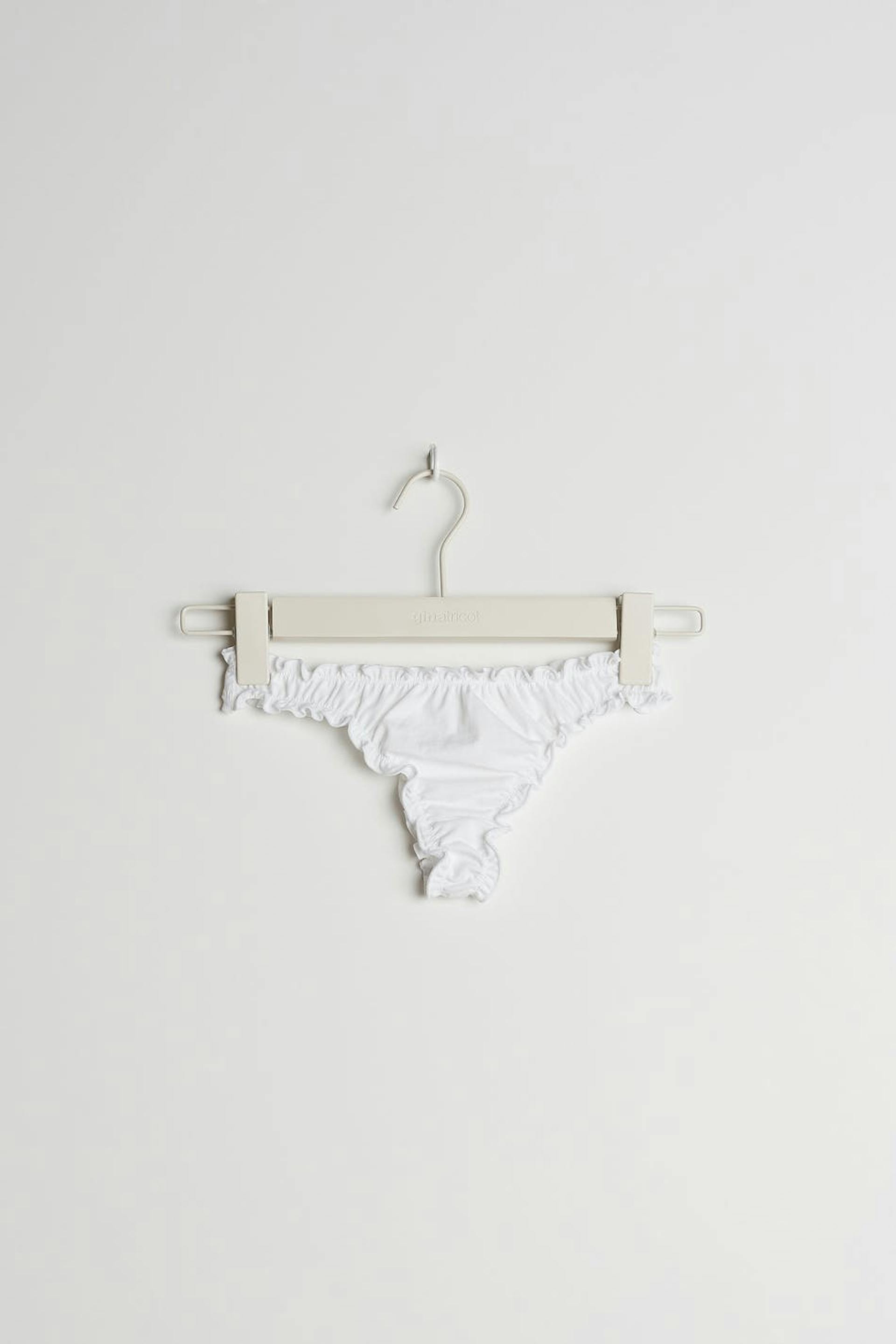 Stringtrosor med en volang vid linningen och vid benöppningarna. Stringtrosorna är vita och har en foder i bomull i grenen.