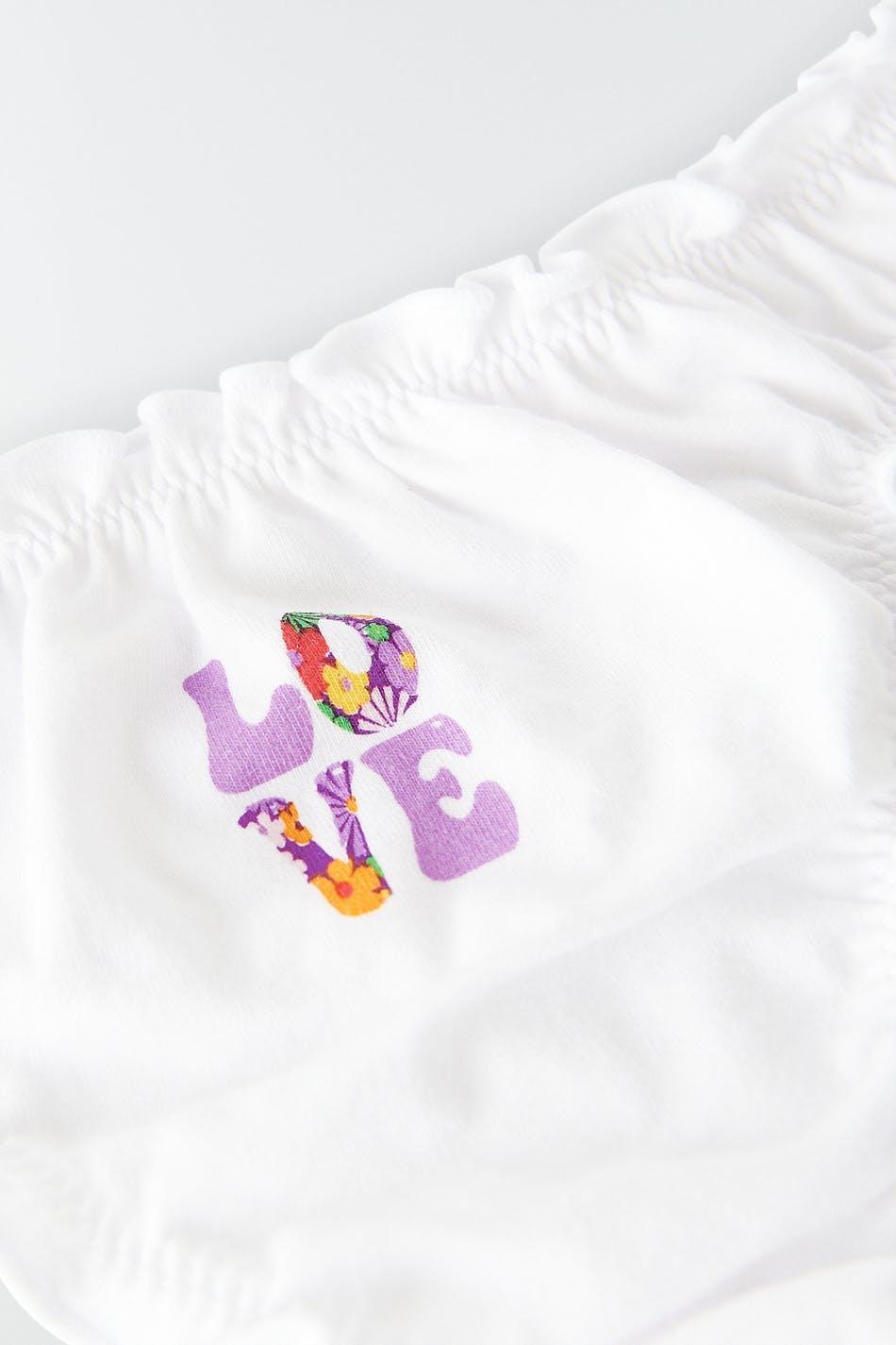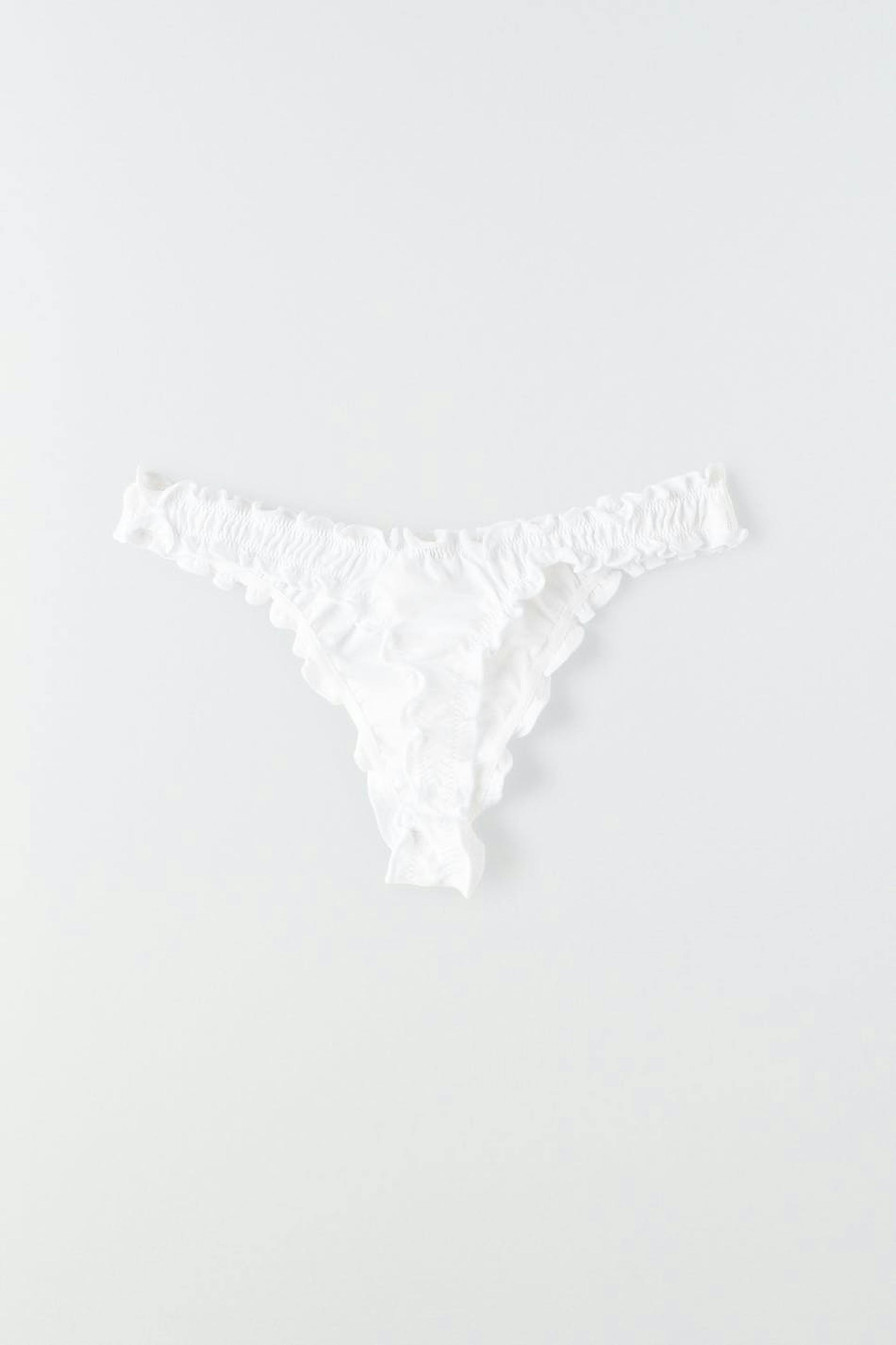 Stringtrosor i bomull med tryck framtill. Stringtrosorna är vita och har volangkanter. De har en fodrad gren.