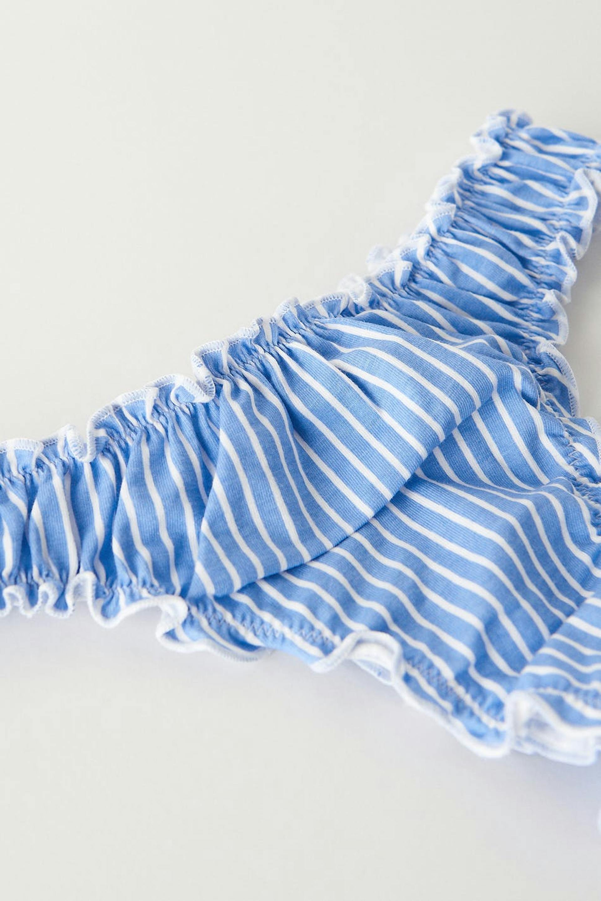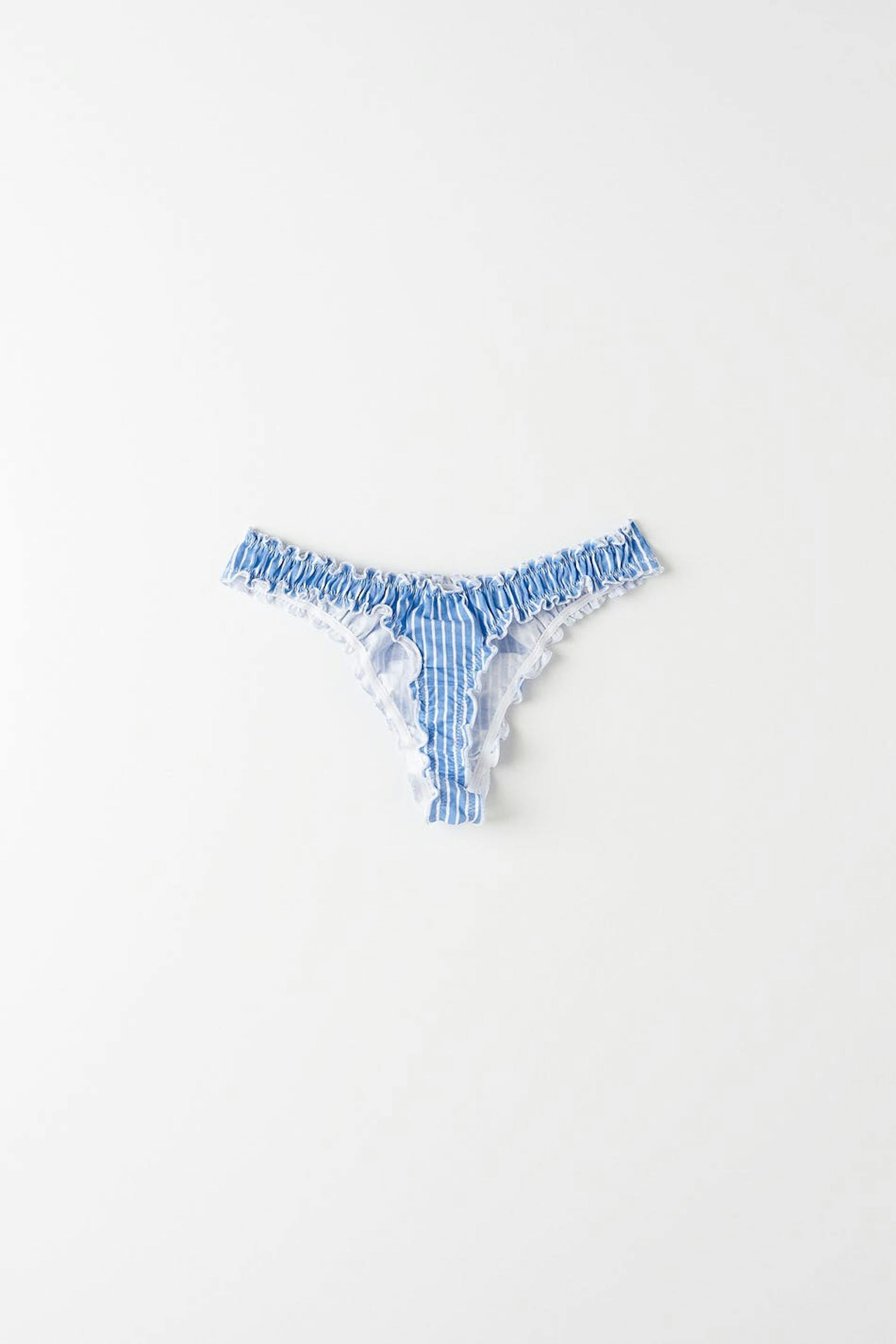 Randiga stringtrosor med volangkanter. Stringtrosorna är blåa och har en fodrad gren i bomull.