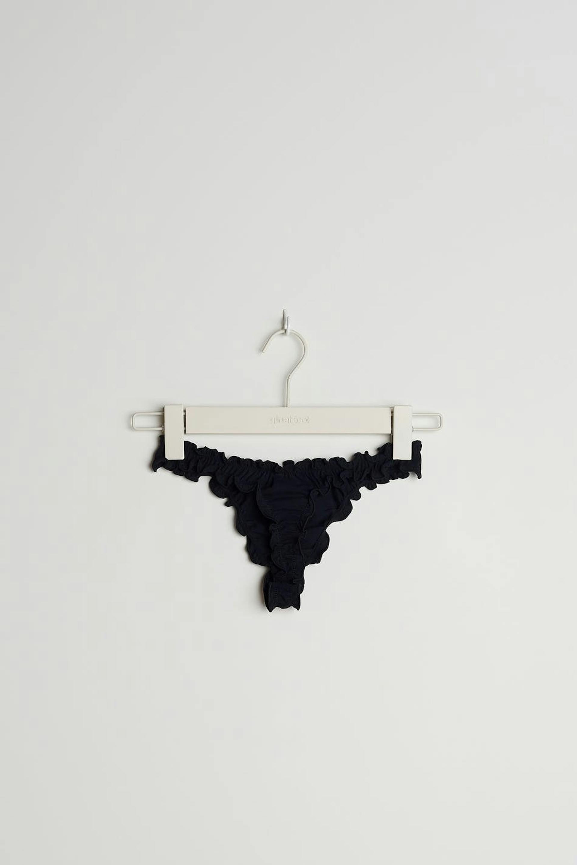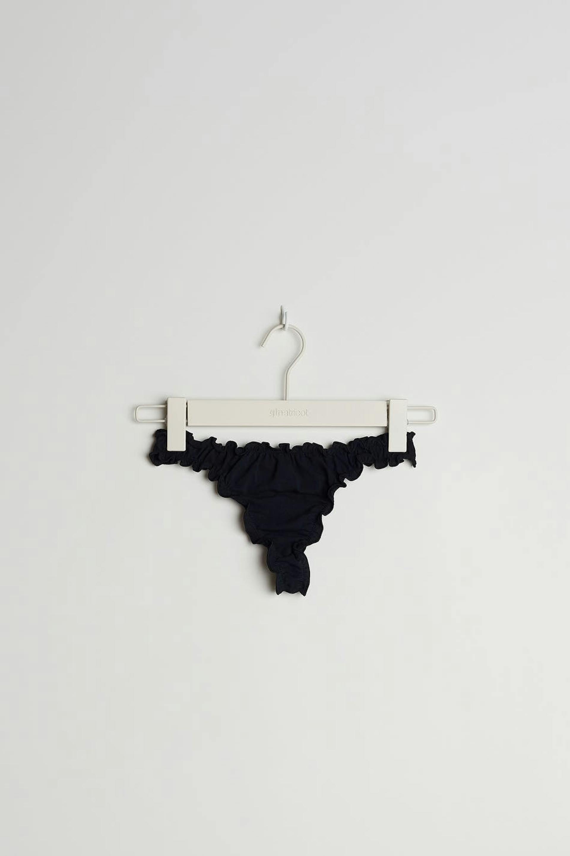 Stringtrosor med en volang vid linningen och vid benöppningarna. Stringtrosorna är svarta och har ett foder i bomull i grenen.