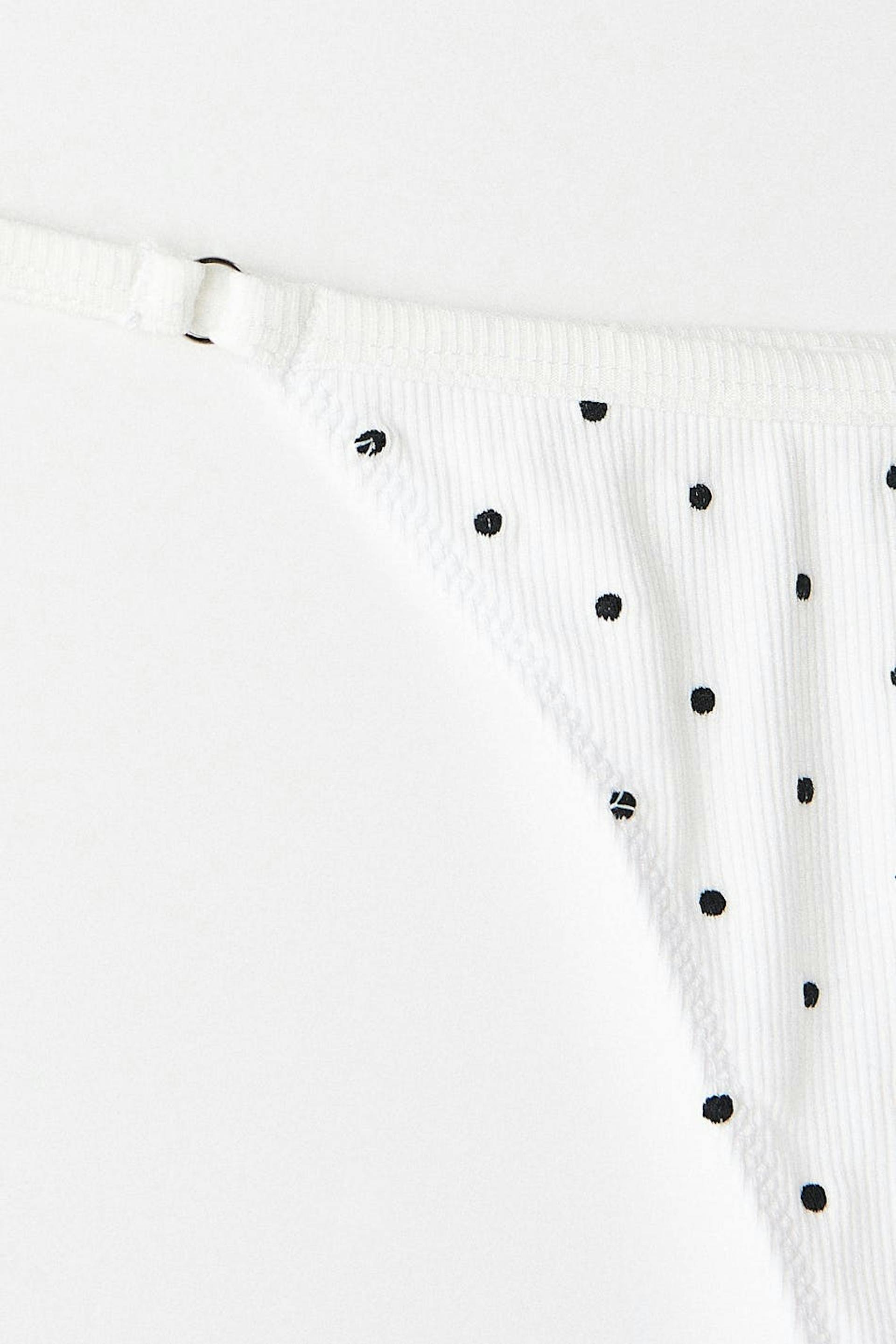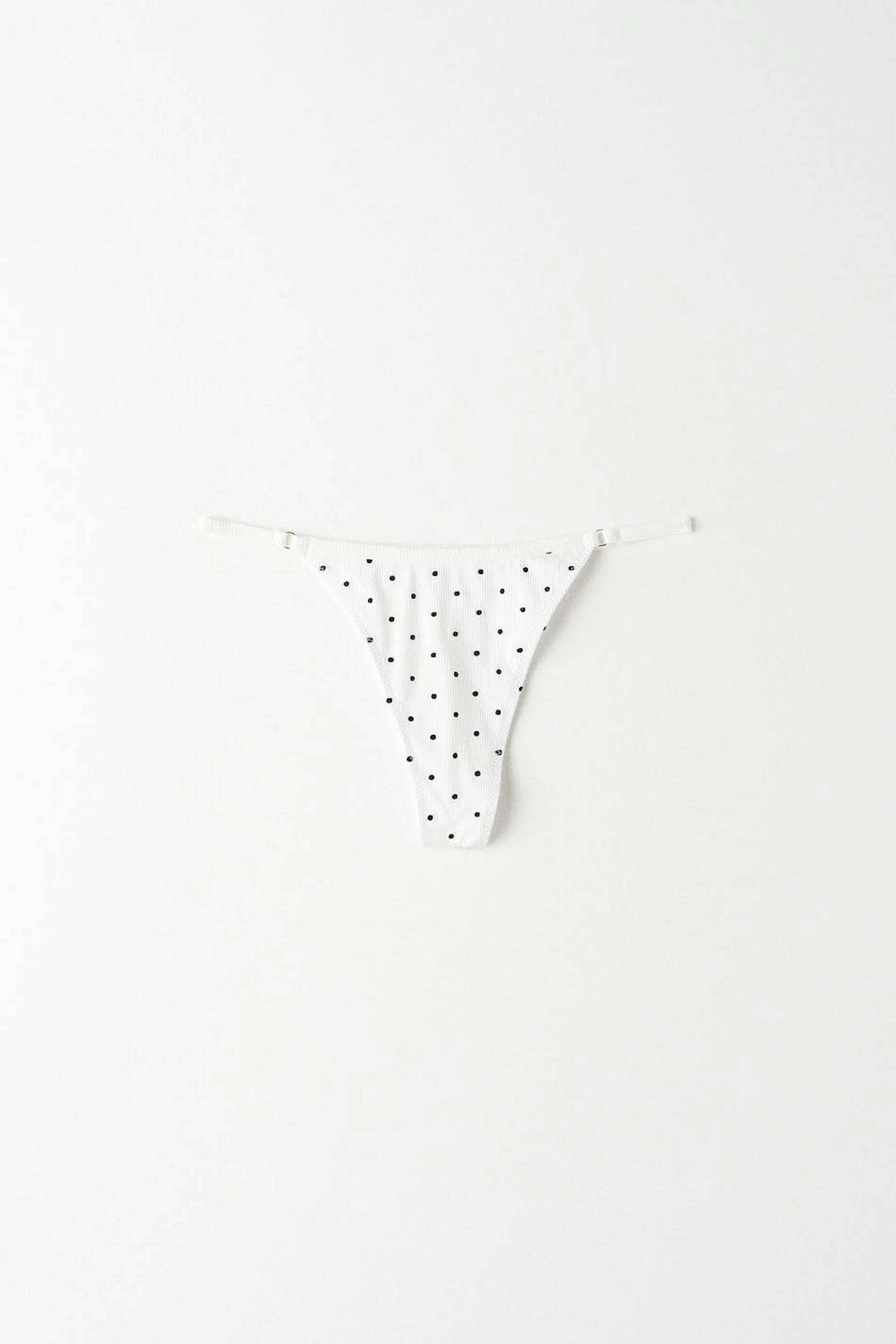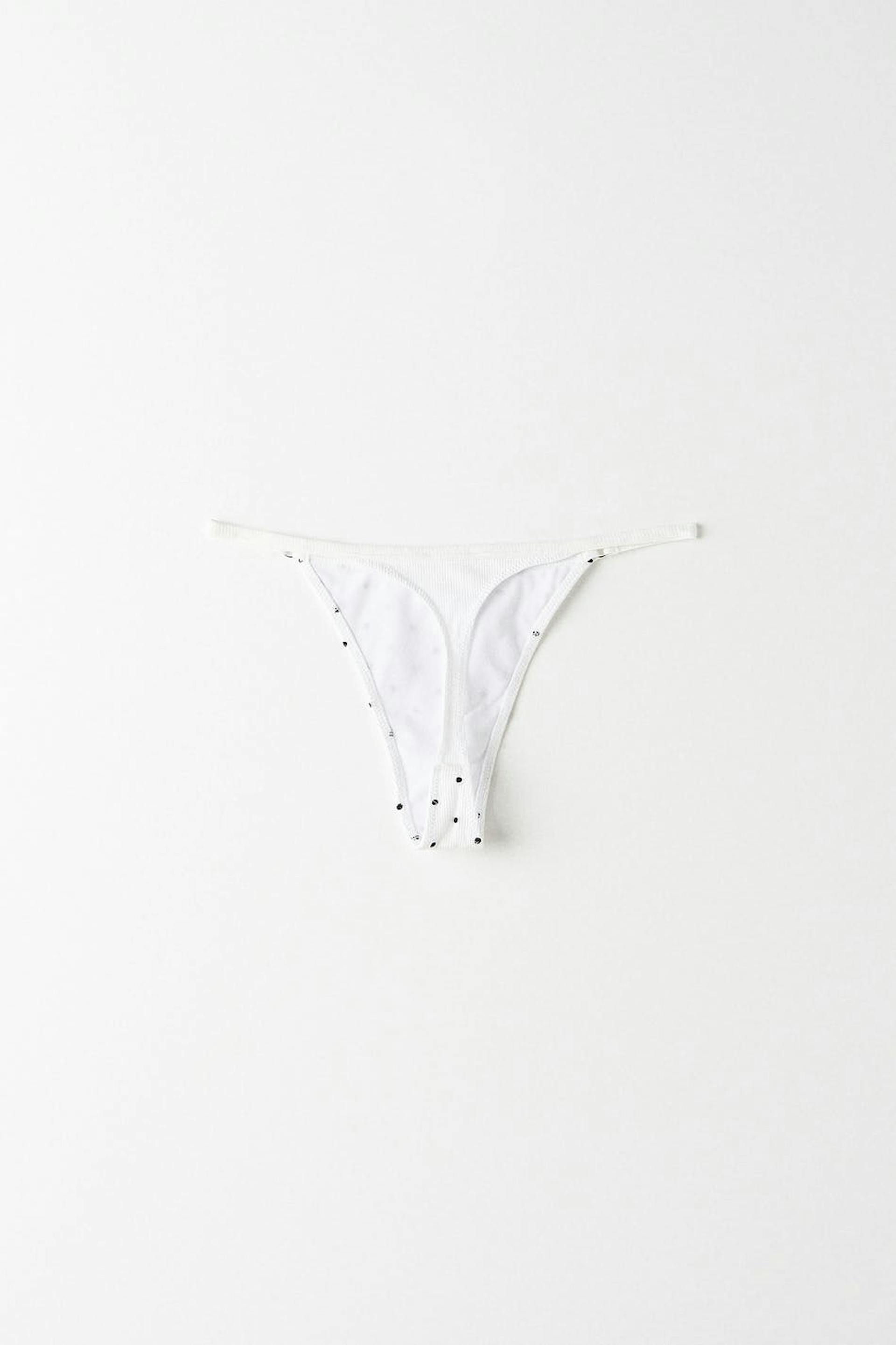 Prickiga stringtrosor med en ribbad kvalitet. Stringtrosorna är vita och har tunna band med metallringar. De har en fodrad gren i bomull.