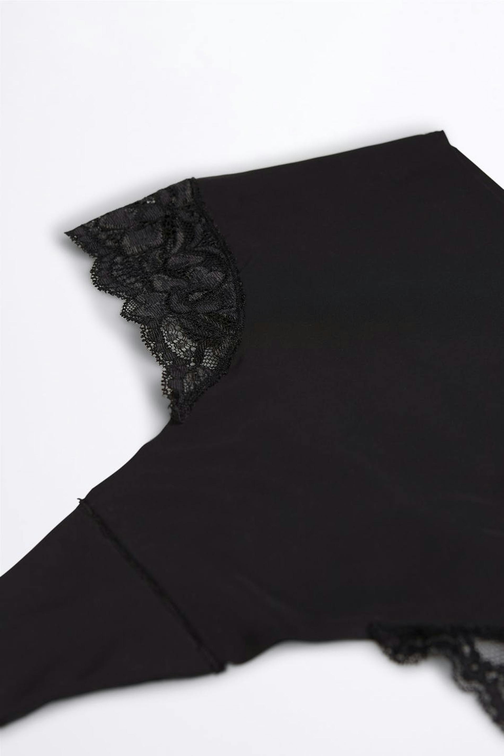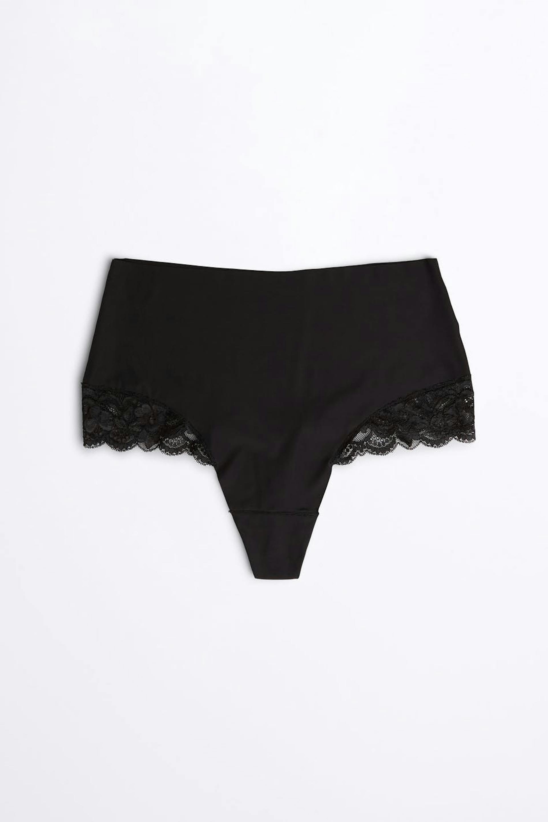 Stringtrosor med en hög midja. Stringtrosorna är svarta och har ett foder i bomull i grenen. De är gjorda av mikrofiber och har paneler i spets på sidorna.