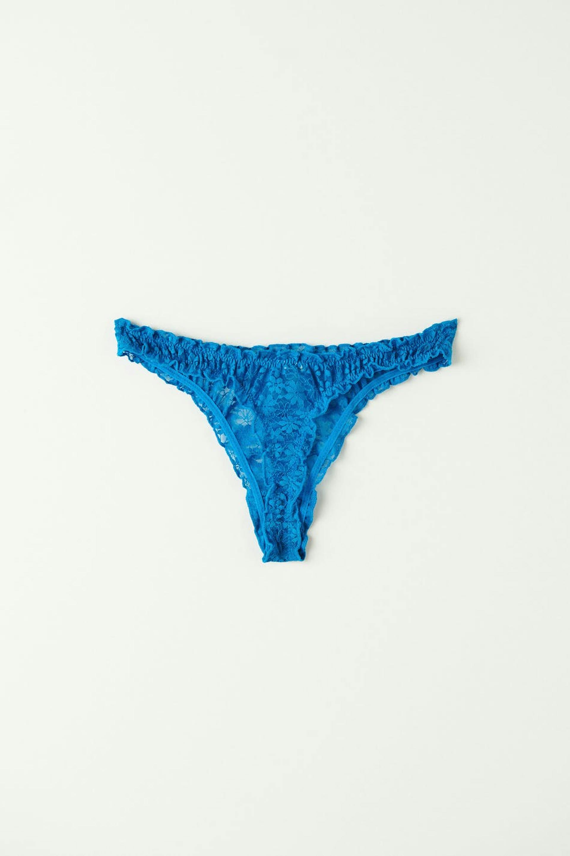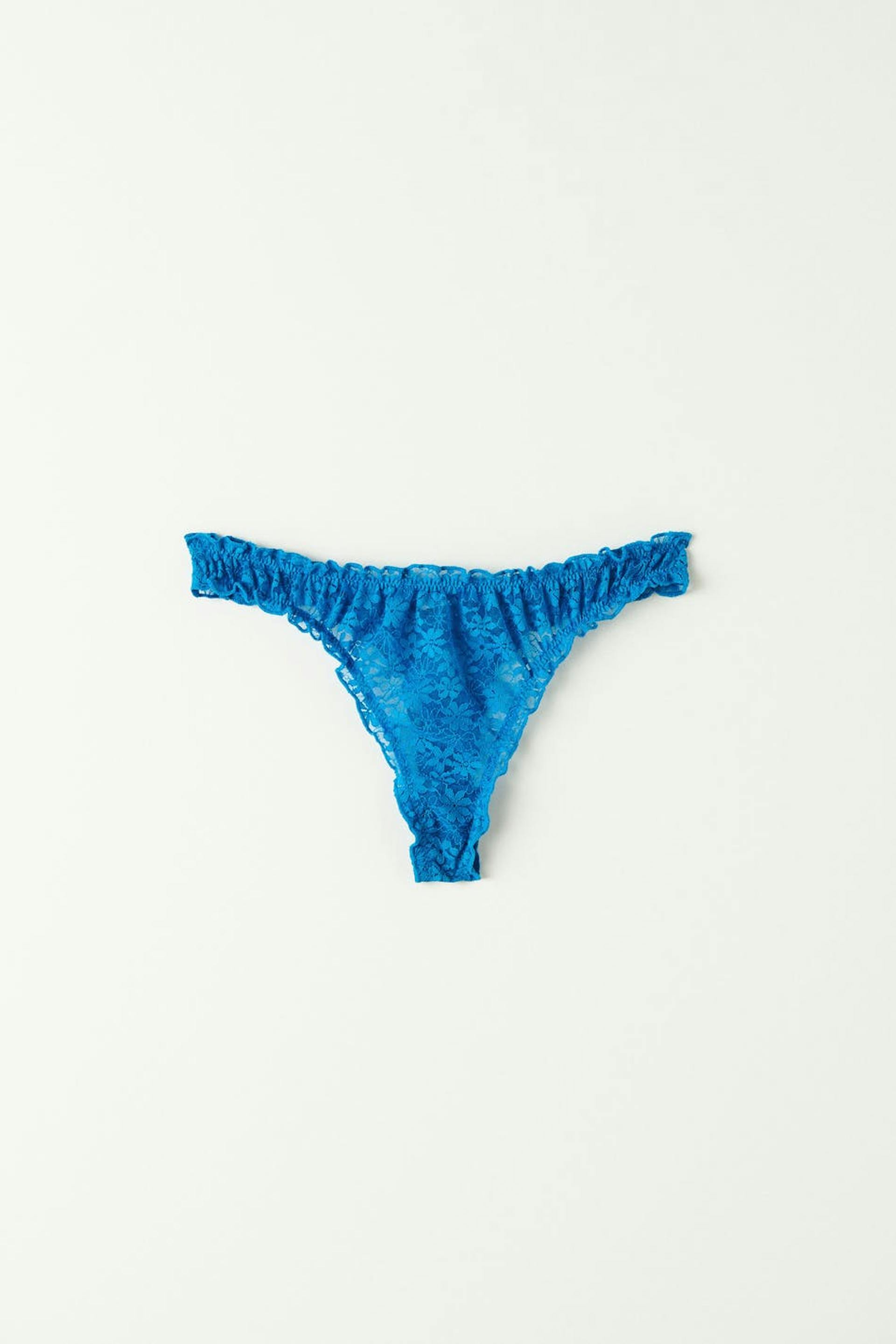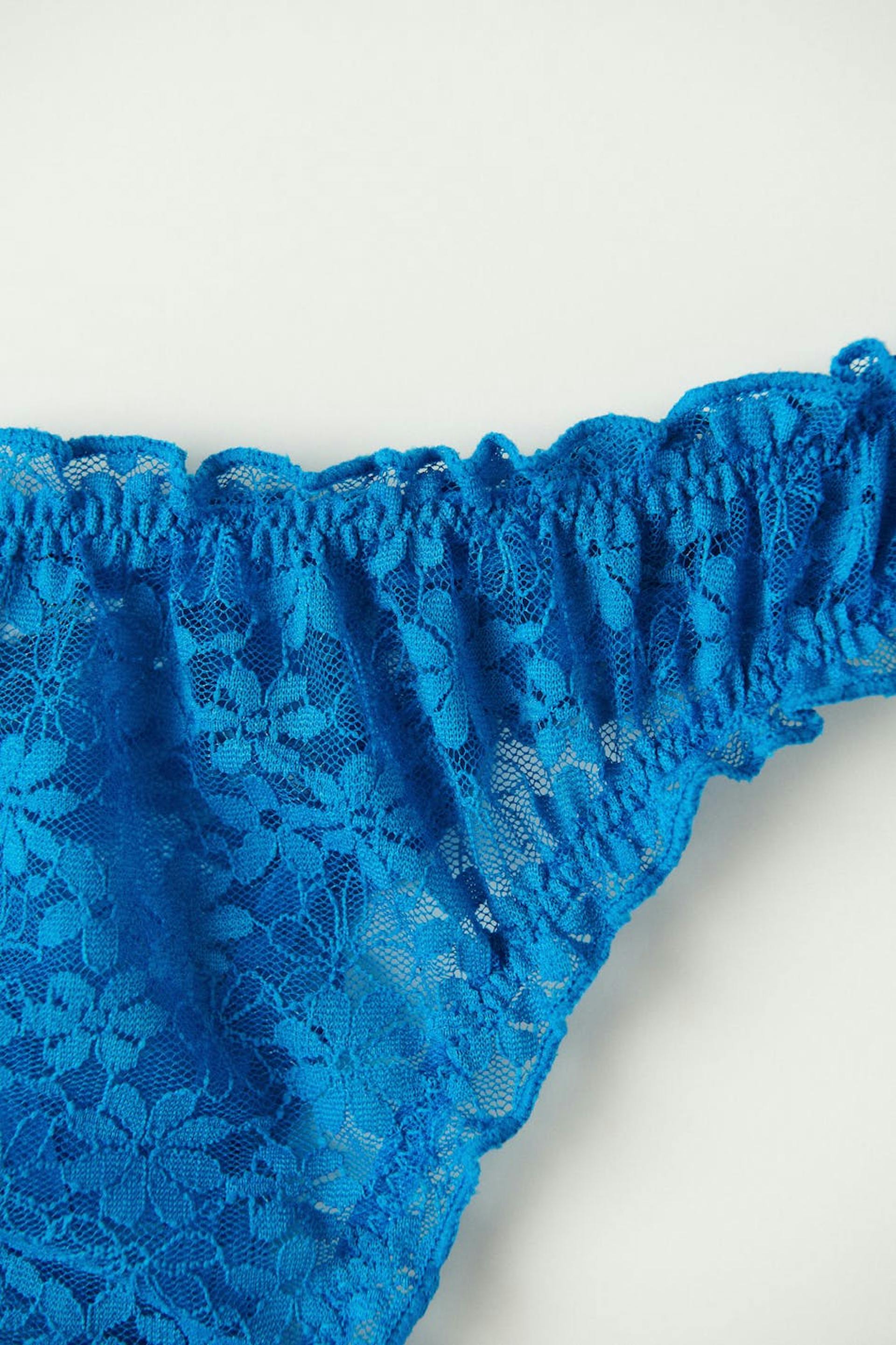 Stringtrosor i spets med volangkanter. Stringtrosorna är blåa och har fodrad gren i bomull.