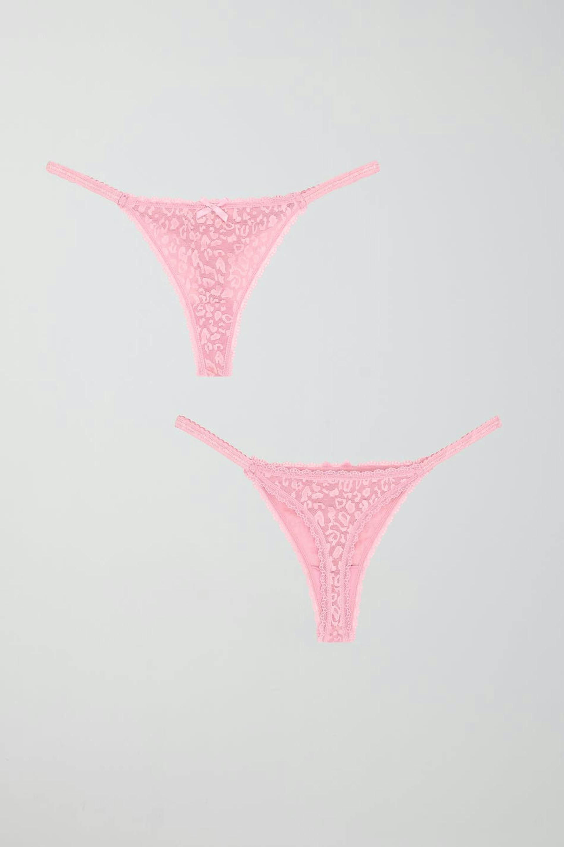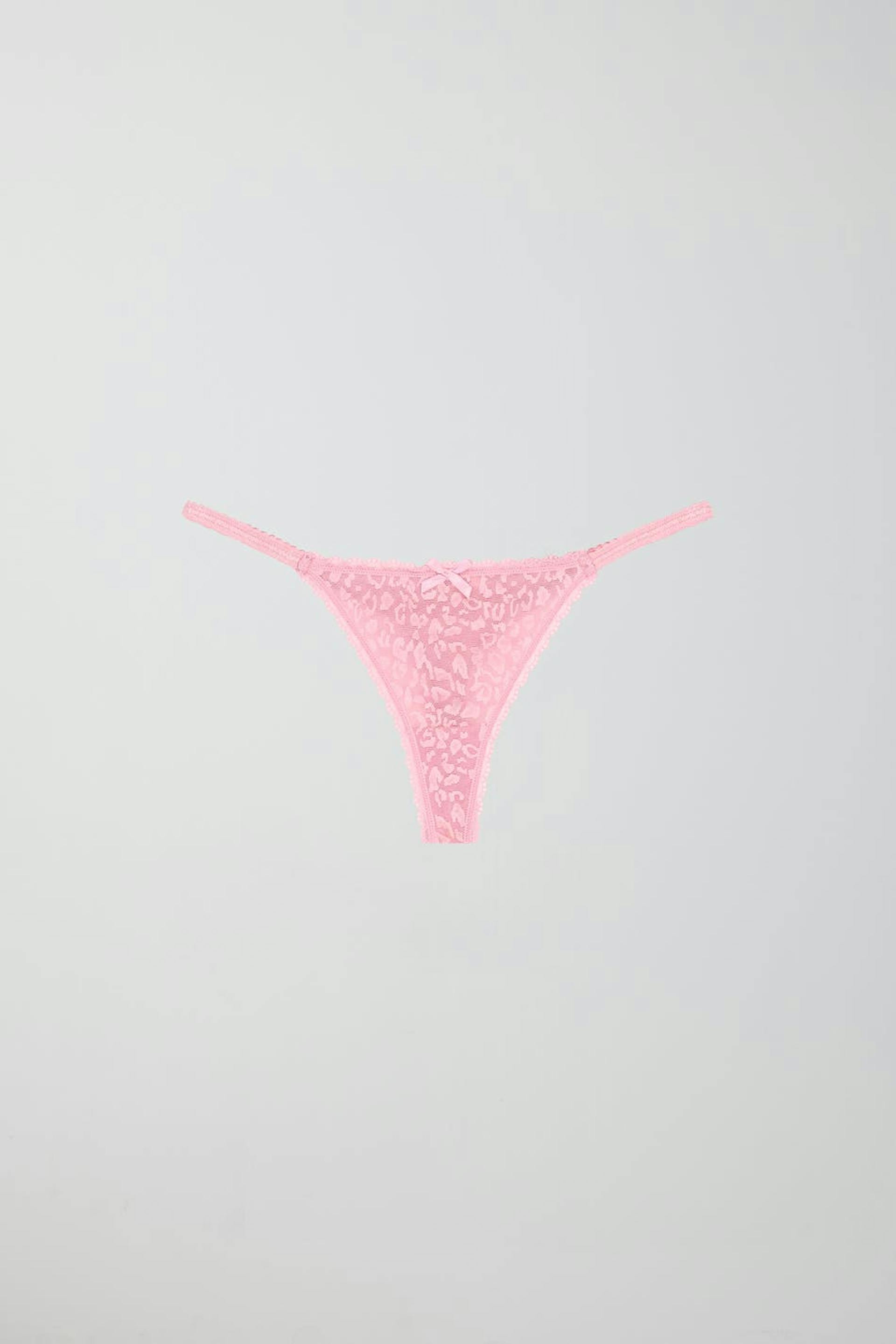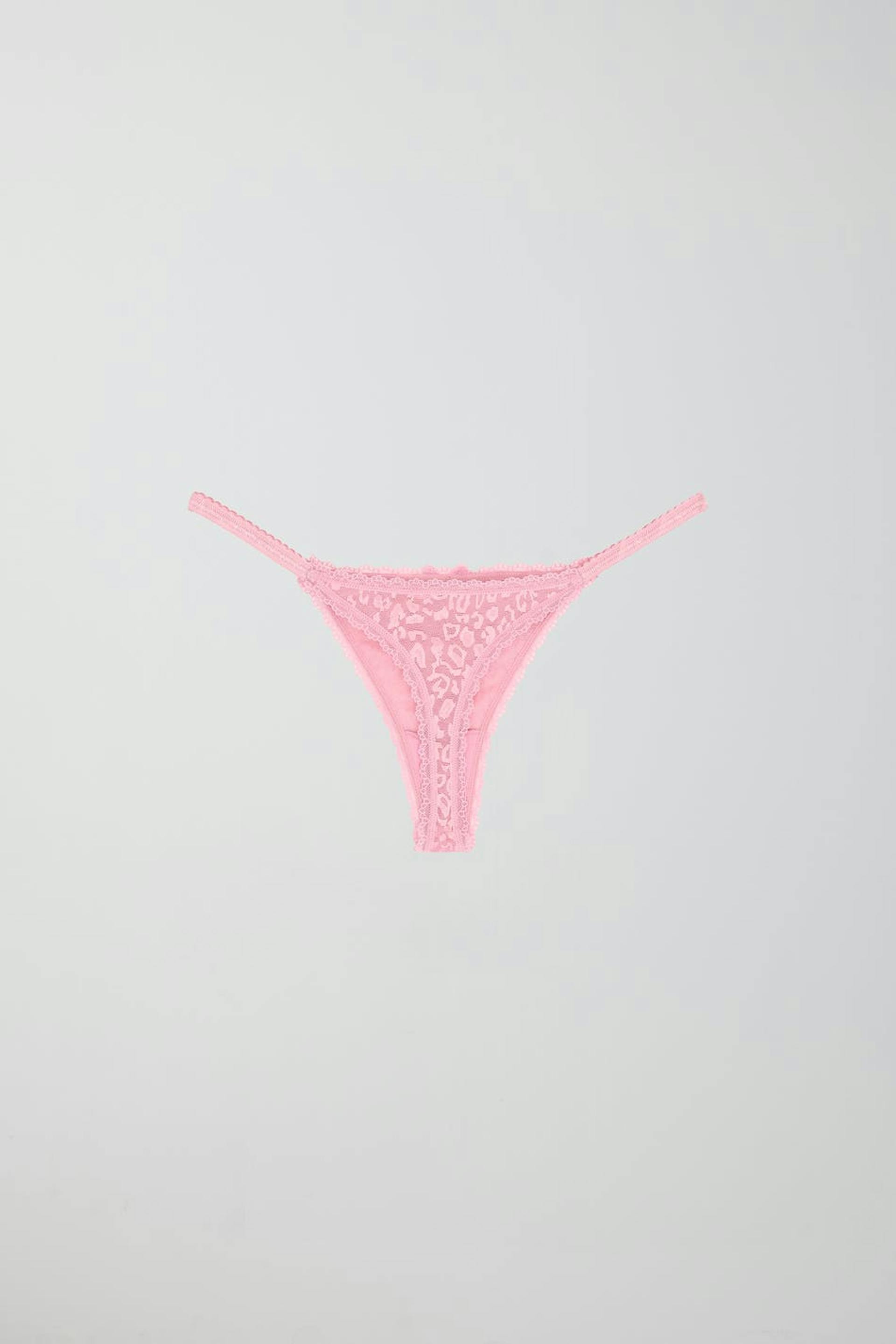Trosa med spetskant. Trosan är rosa och har en rosettdetalj framtill. Den har en fodrad gren.