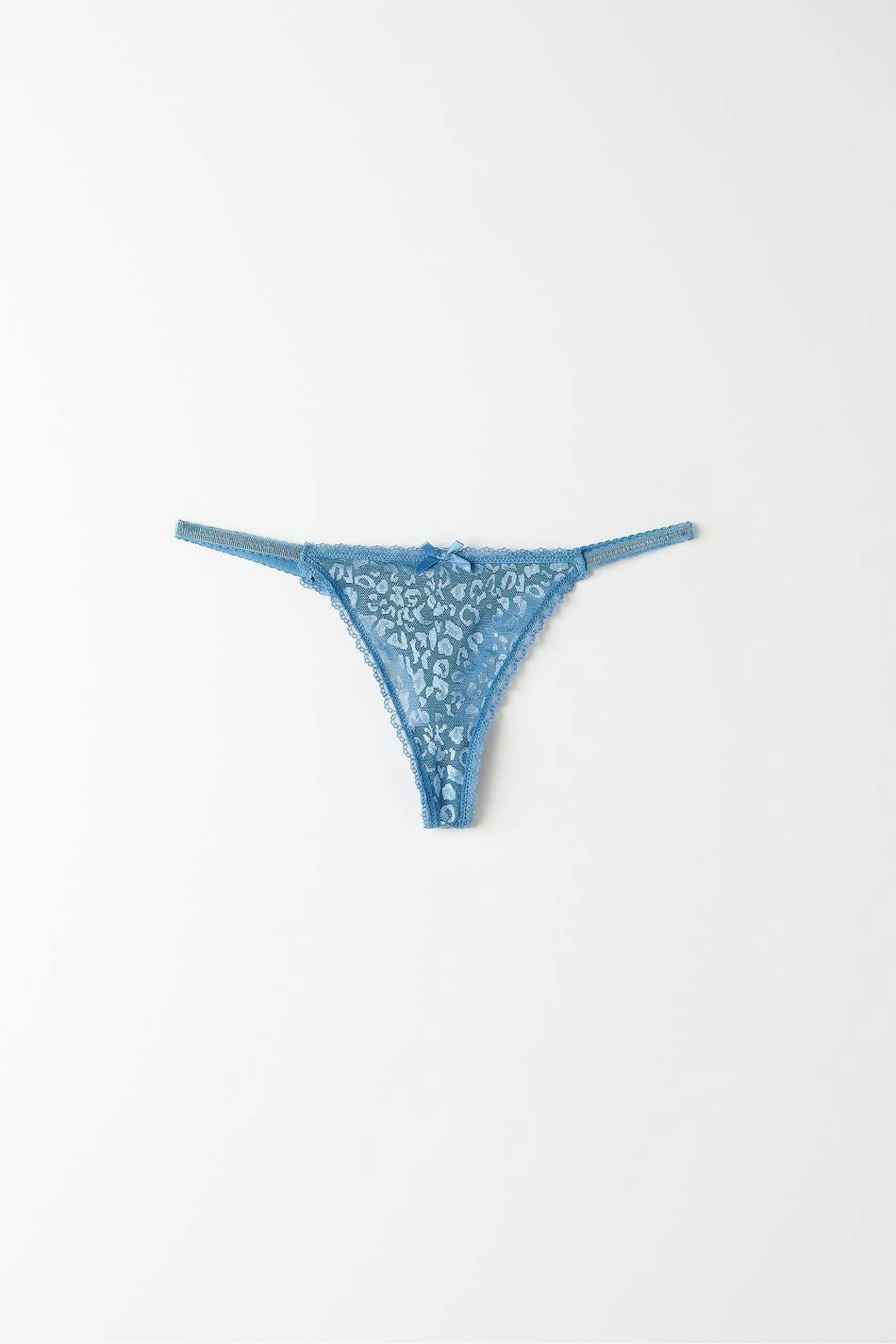 Mönstrade stringtrosor med spetskanter. Stringtrosorna är blåa och har en fodrad gren. De har en rosett fram och smala resårband i sidorna.