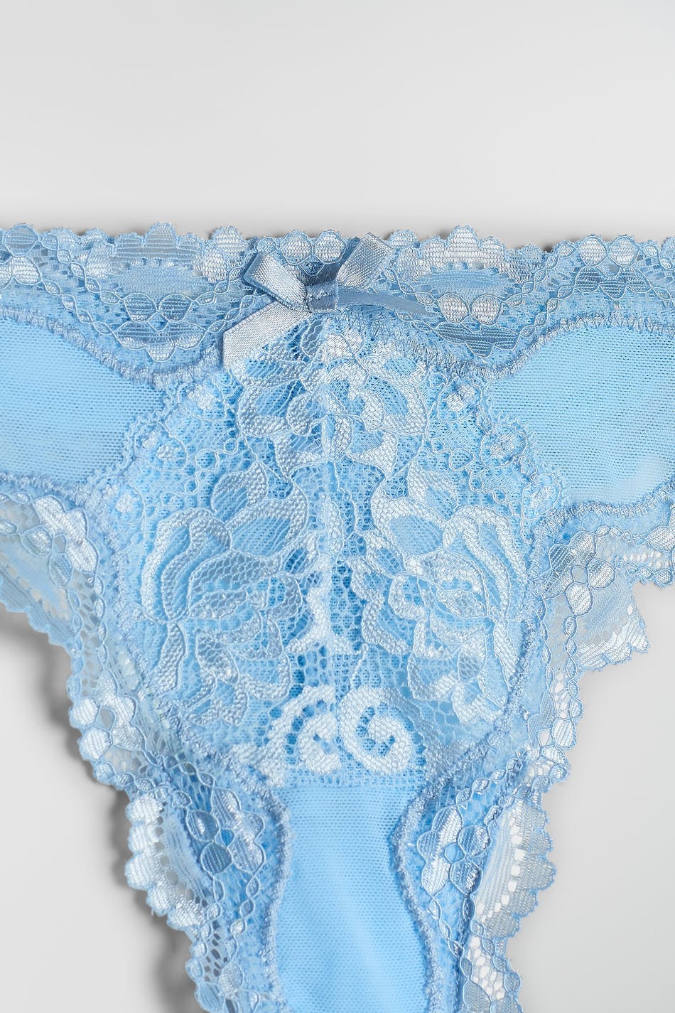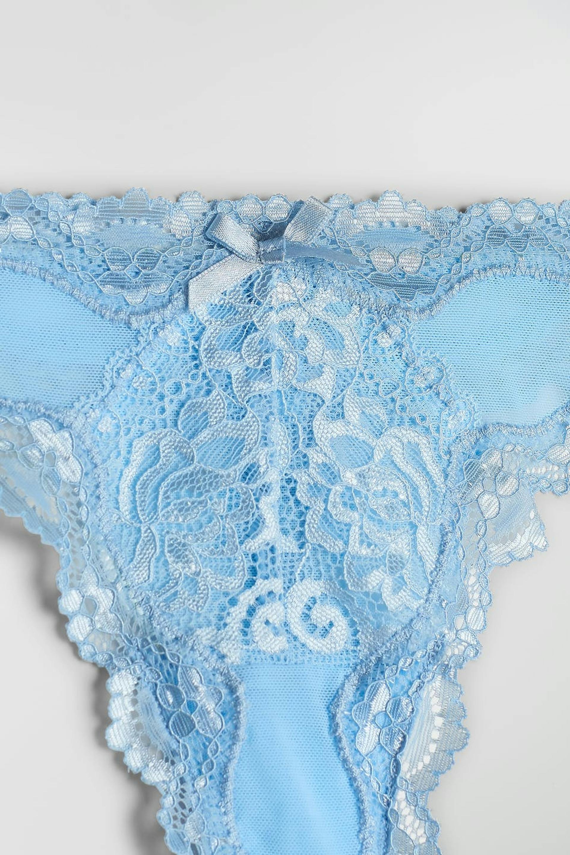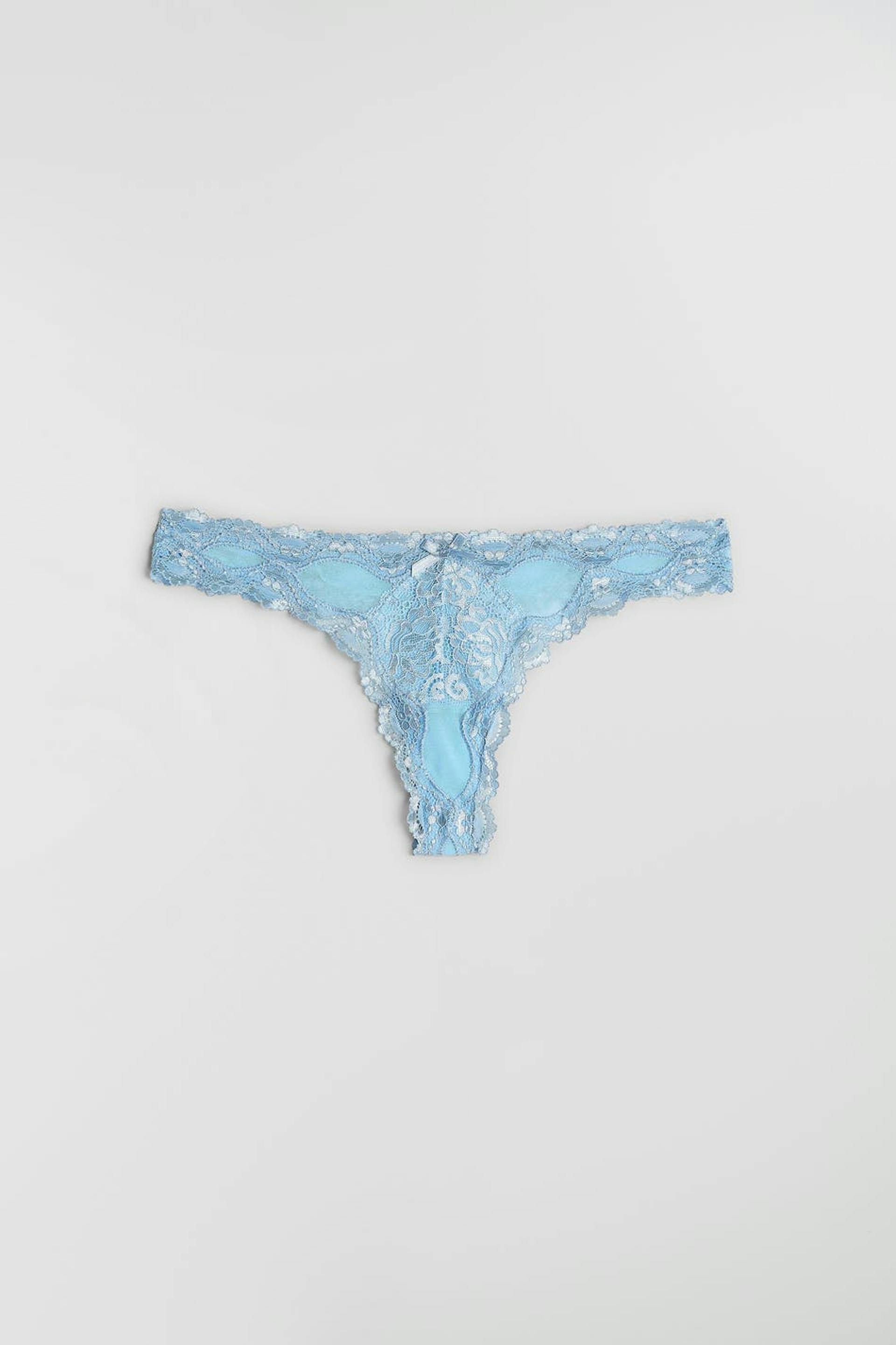 Trosa med en string-modell. Trosan är blå och har ett spetstyg framtill och på kanten.