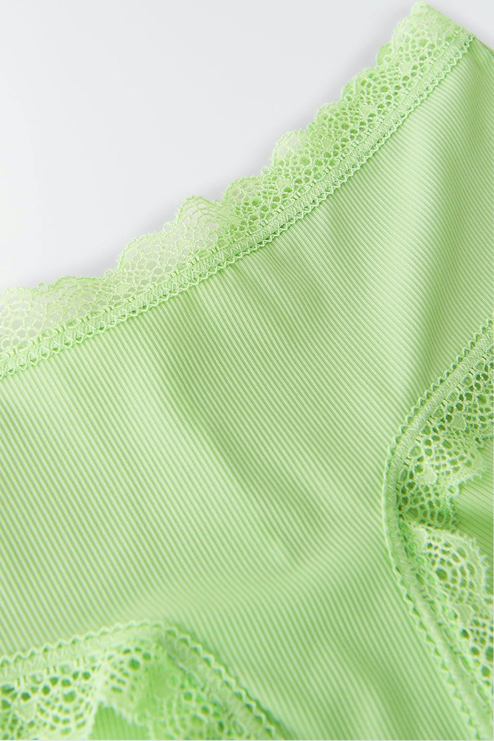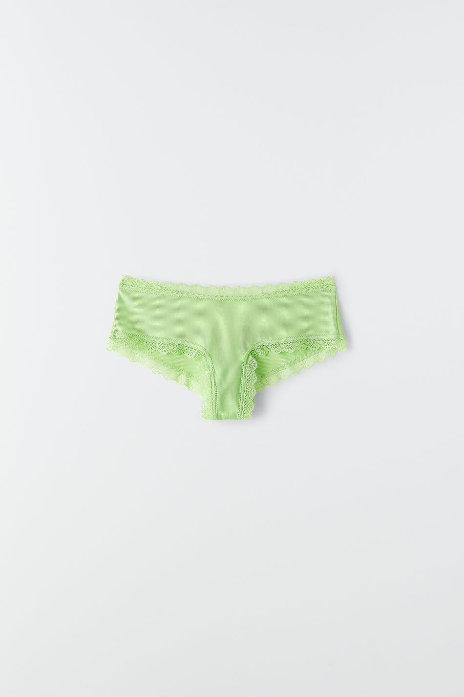 Mjuka braziliantrosor med spetskanter. Braziliantrosorna är gröna och har en ribbad kvalitet i mikrofiber.