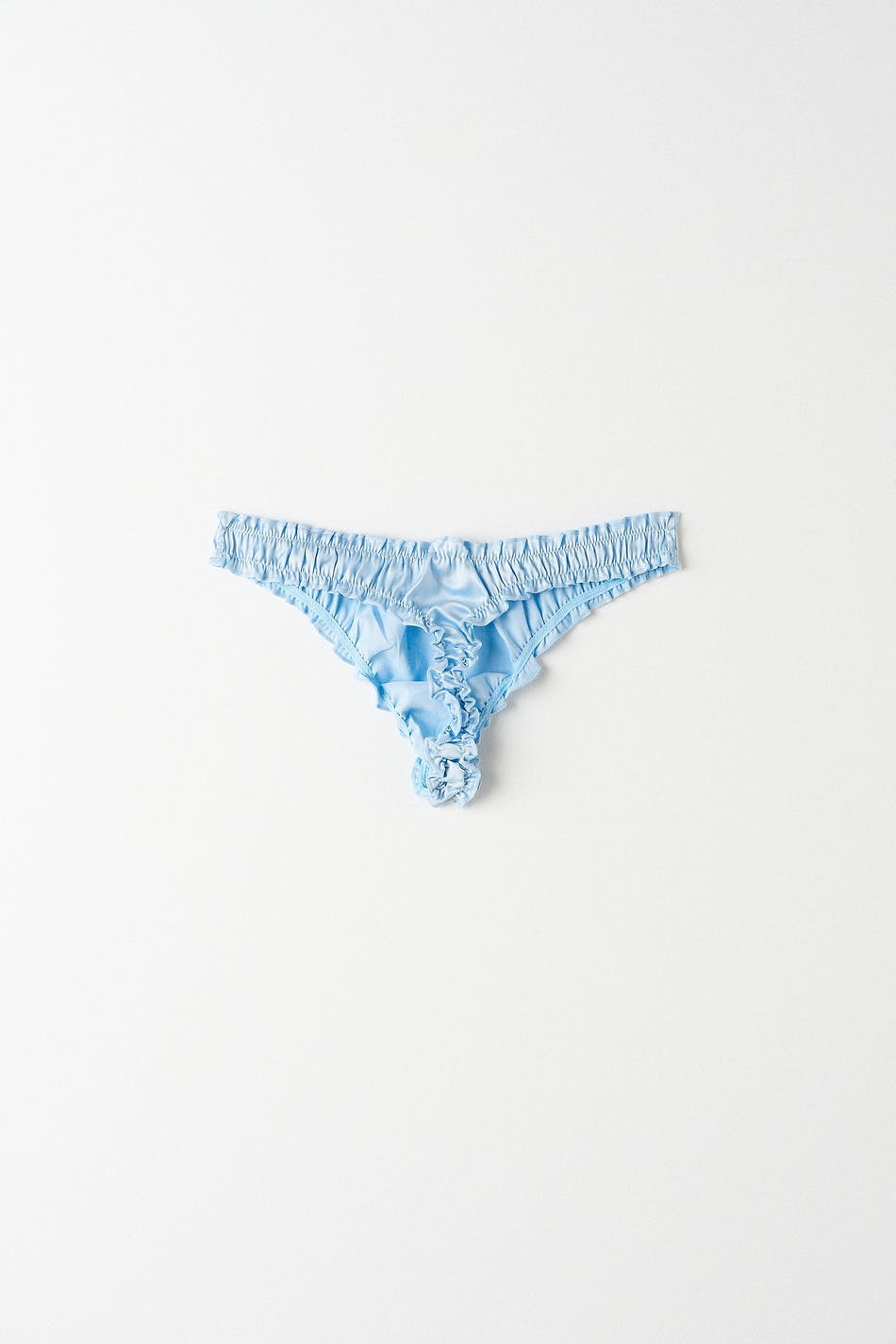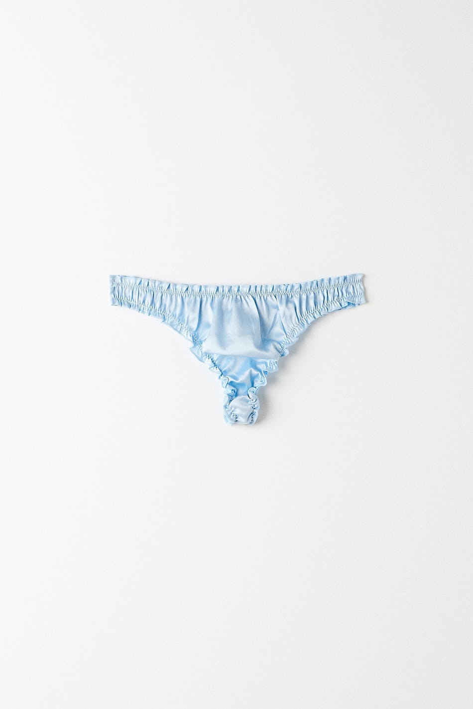 Stringtrosor i satin med volangkanter. Stringtrosorna är blåa och har en fodrad gren i bomull.
