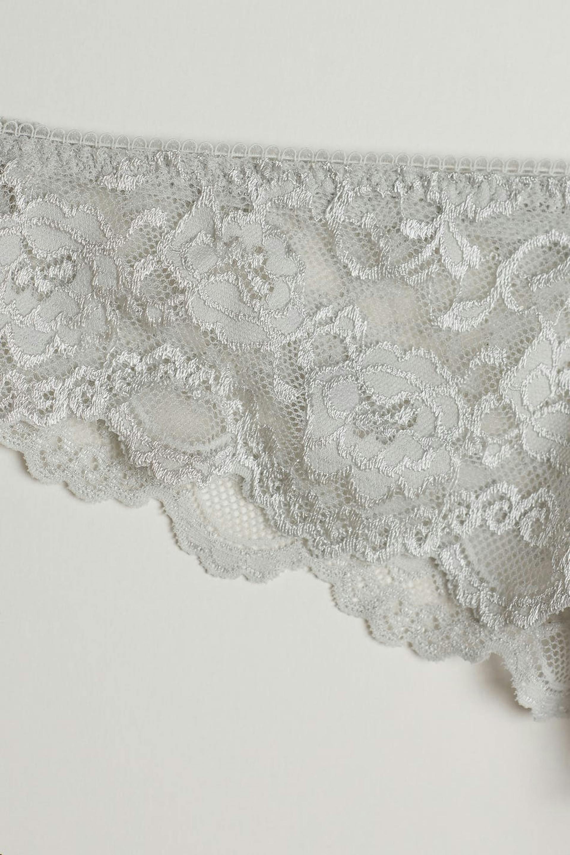 Stringtrosor med ett foder i bomull i grenen. Stringtrosorna är gråa. De är gjorda av spets.