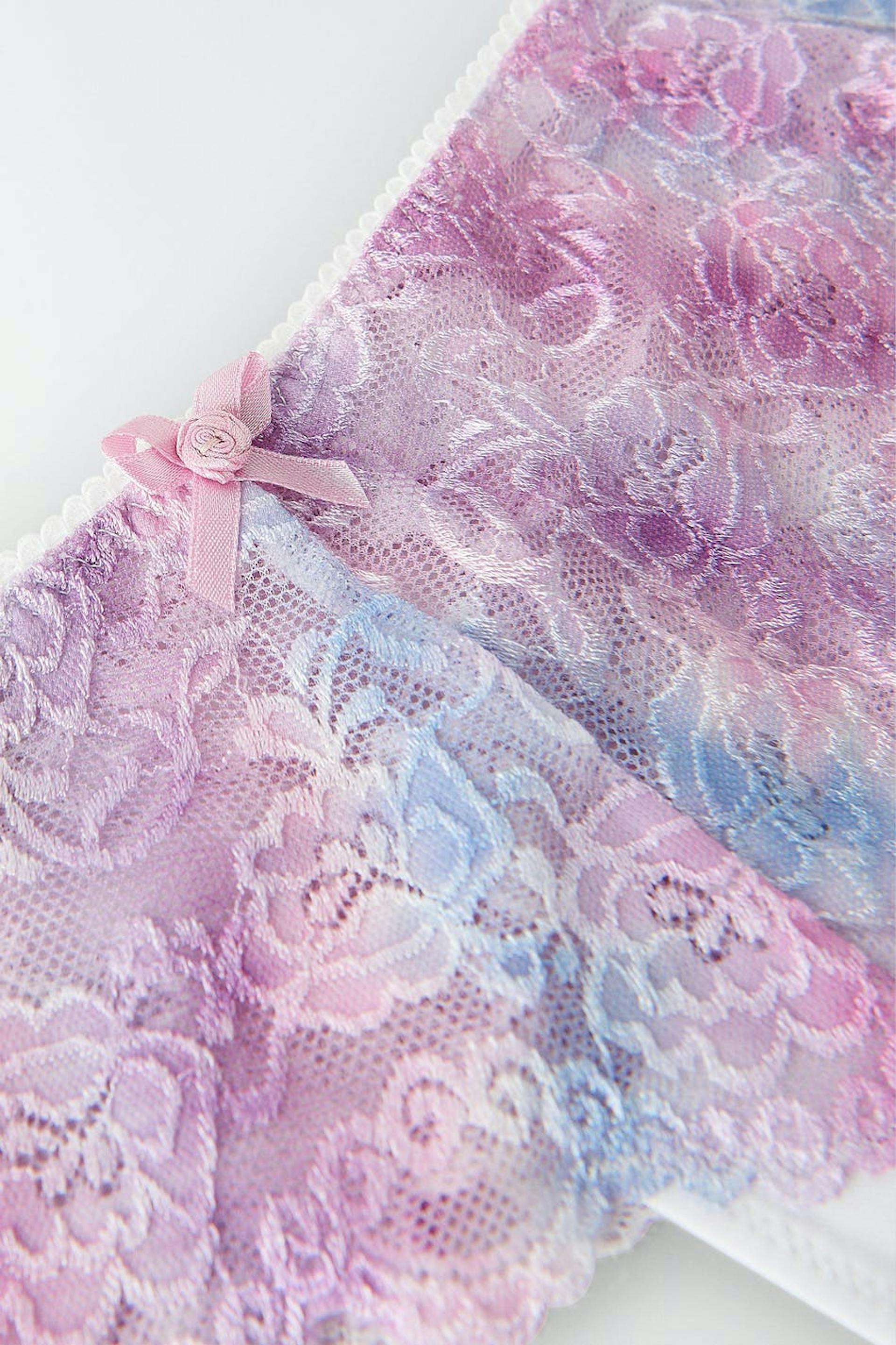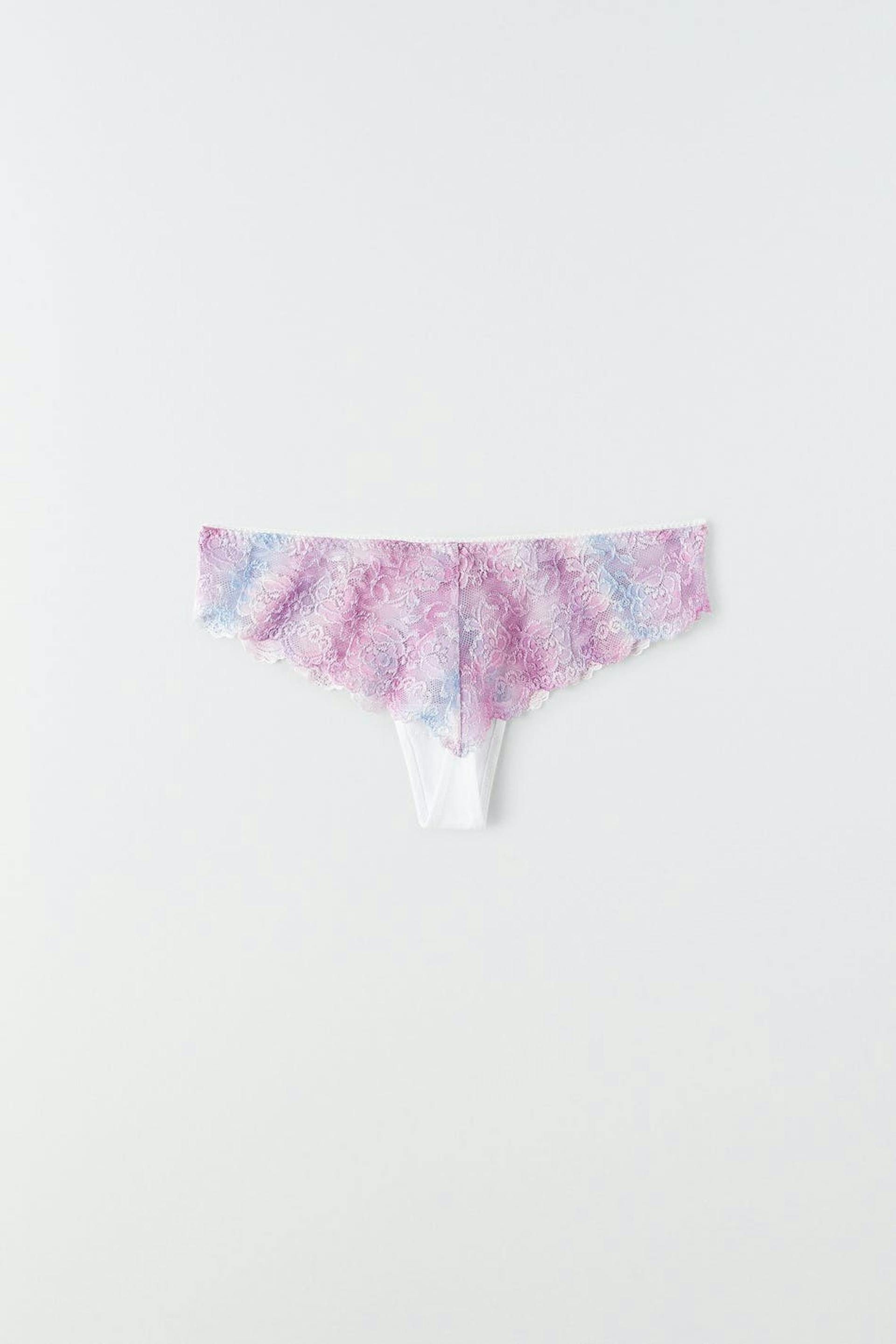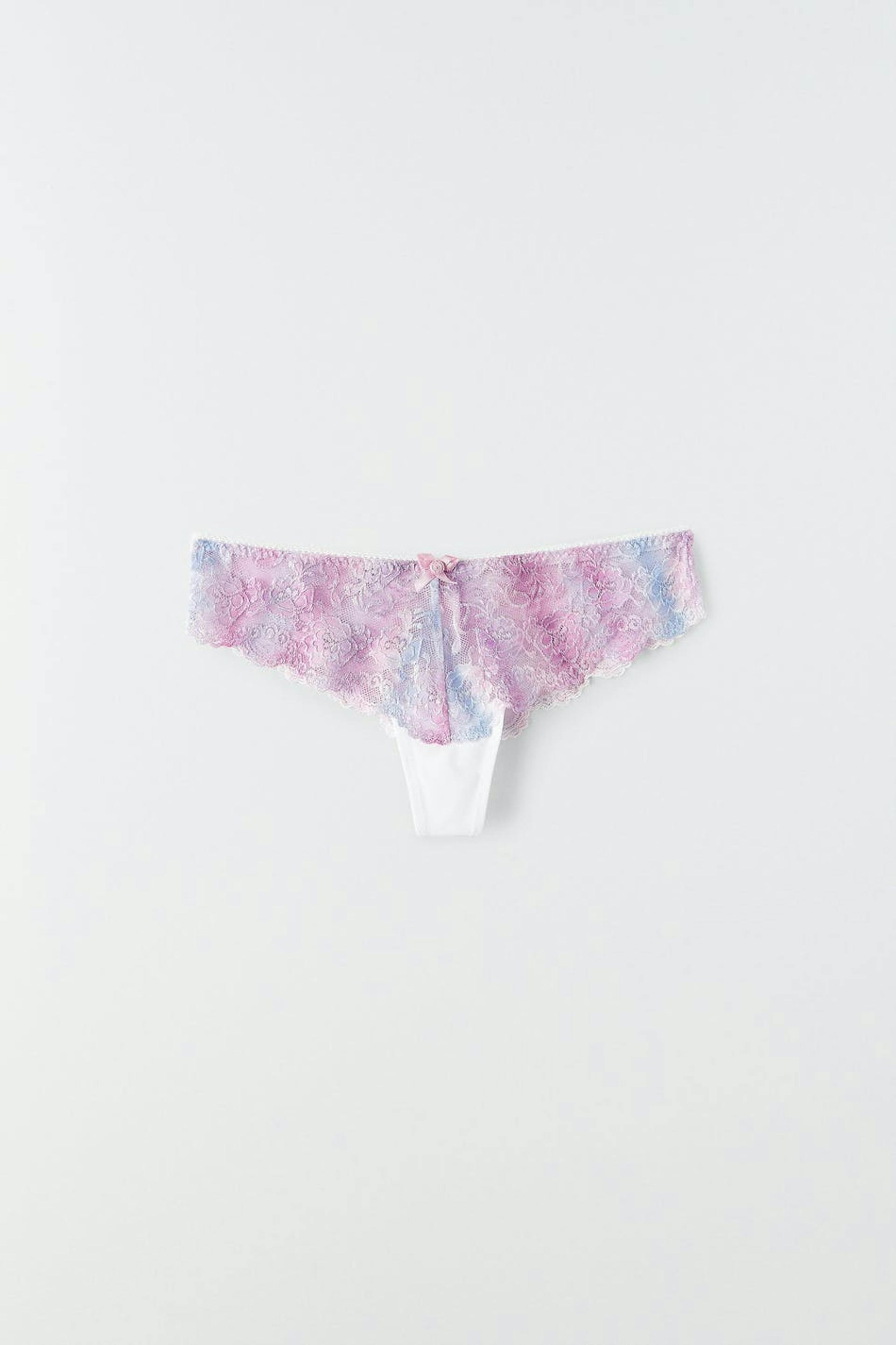 Trosa i spets med fodrad gren. Trosan är lila och har en rosettdetalj framtill.