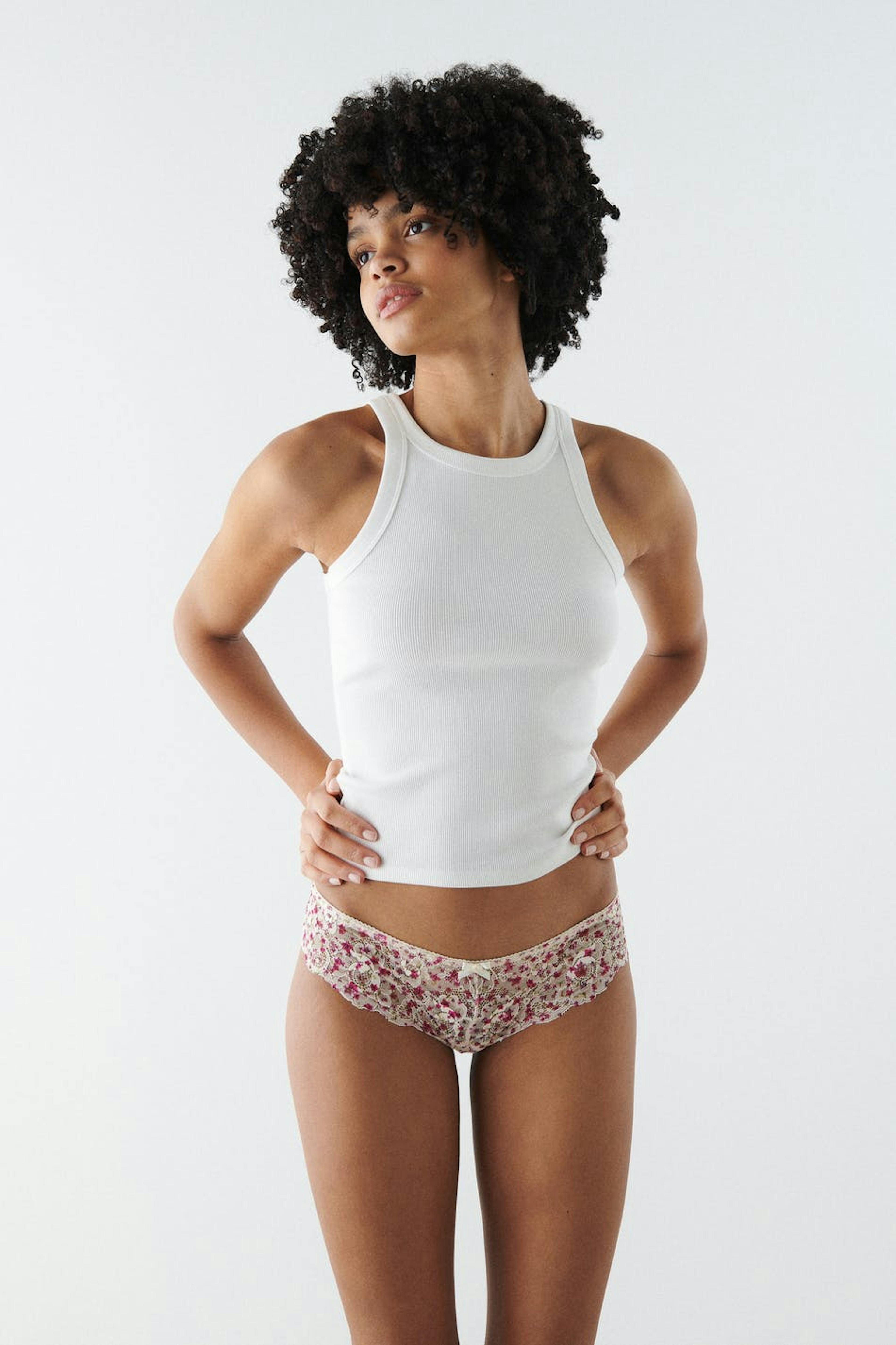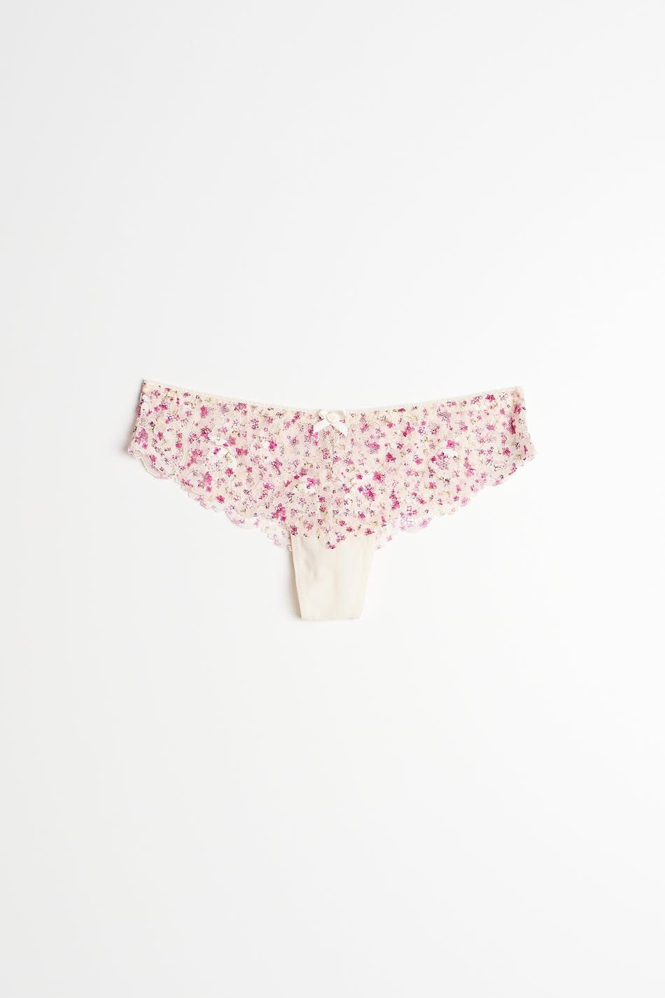 Stringtrosor i spets med fodrad gren. Stringtrosorna är rosa och har ett blommigt mönster.