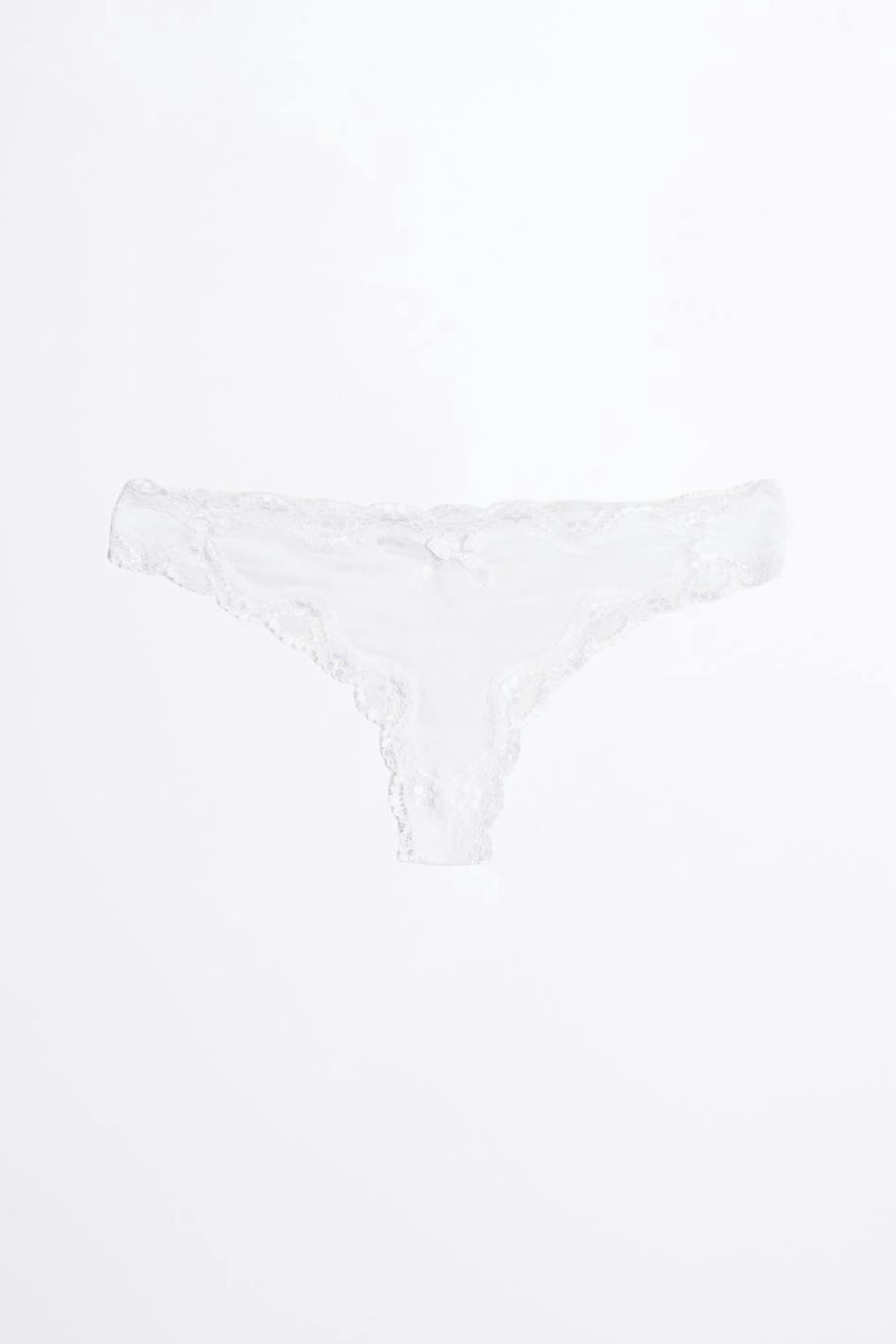 Mjuk stringtrosa med kanter i spets. Stringtrosan är vit och har en dekorativ rosett framtill.