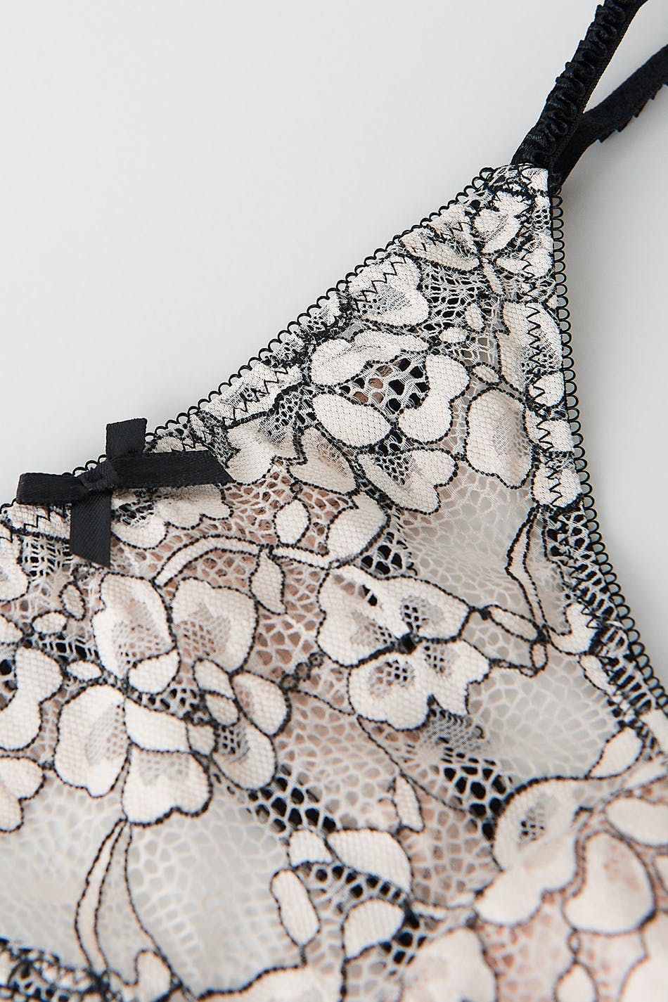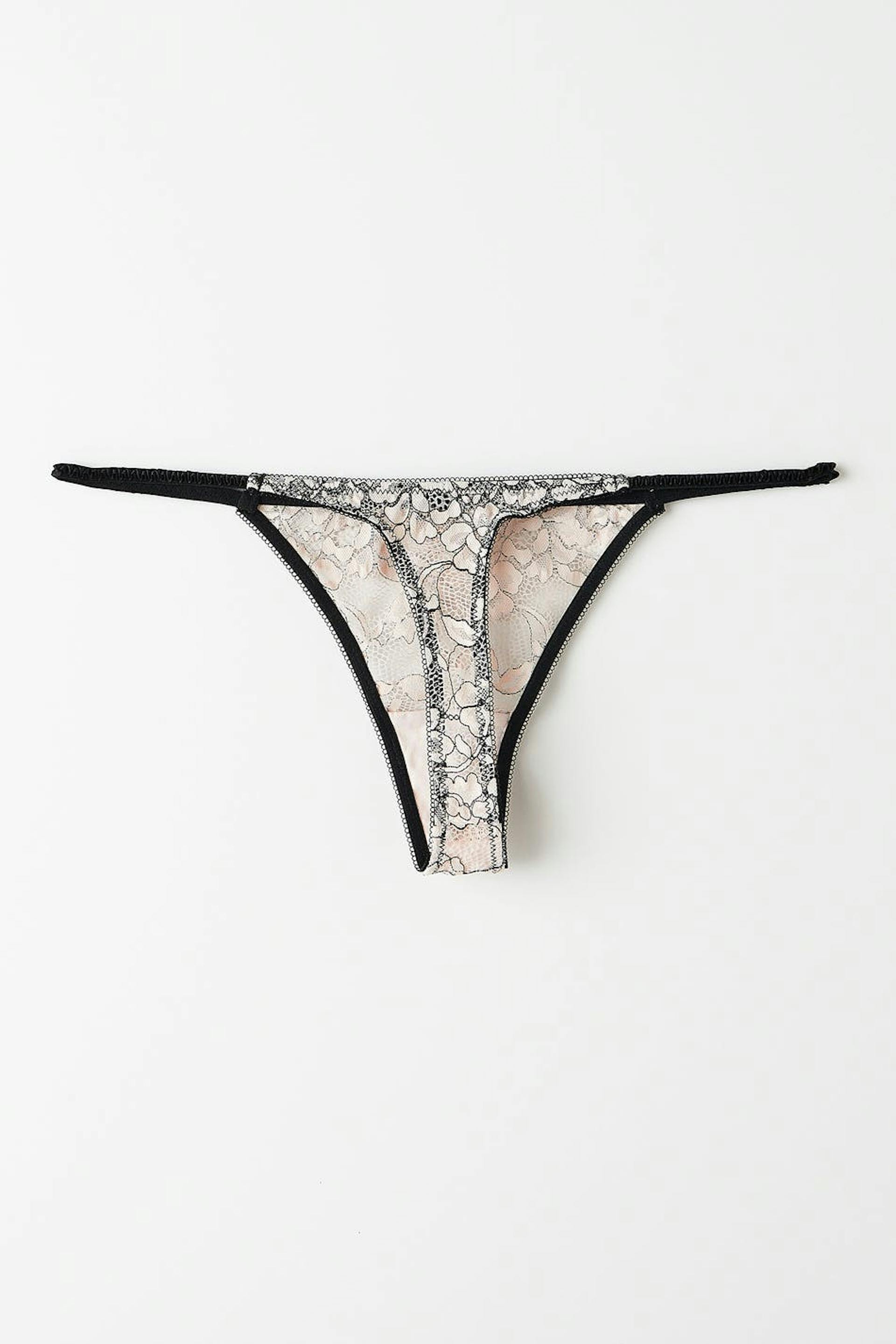 Stringtrosor i spets med tunna resårband i sidorna. Stringtrosorna är beigea och har en fodrad gren i bomull.