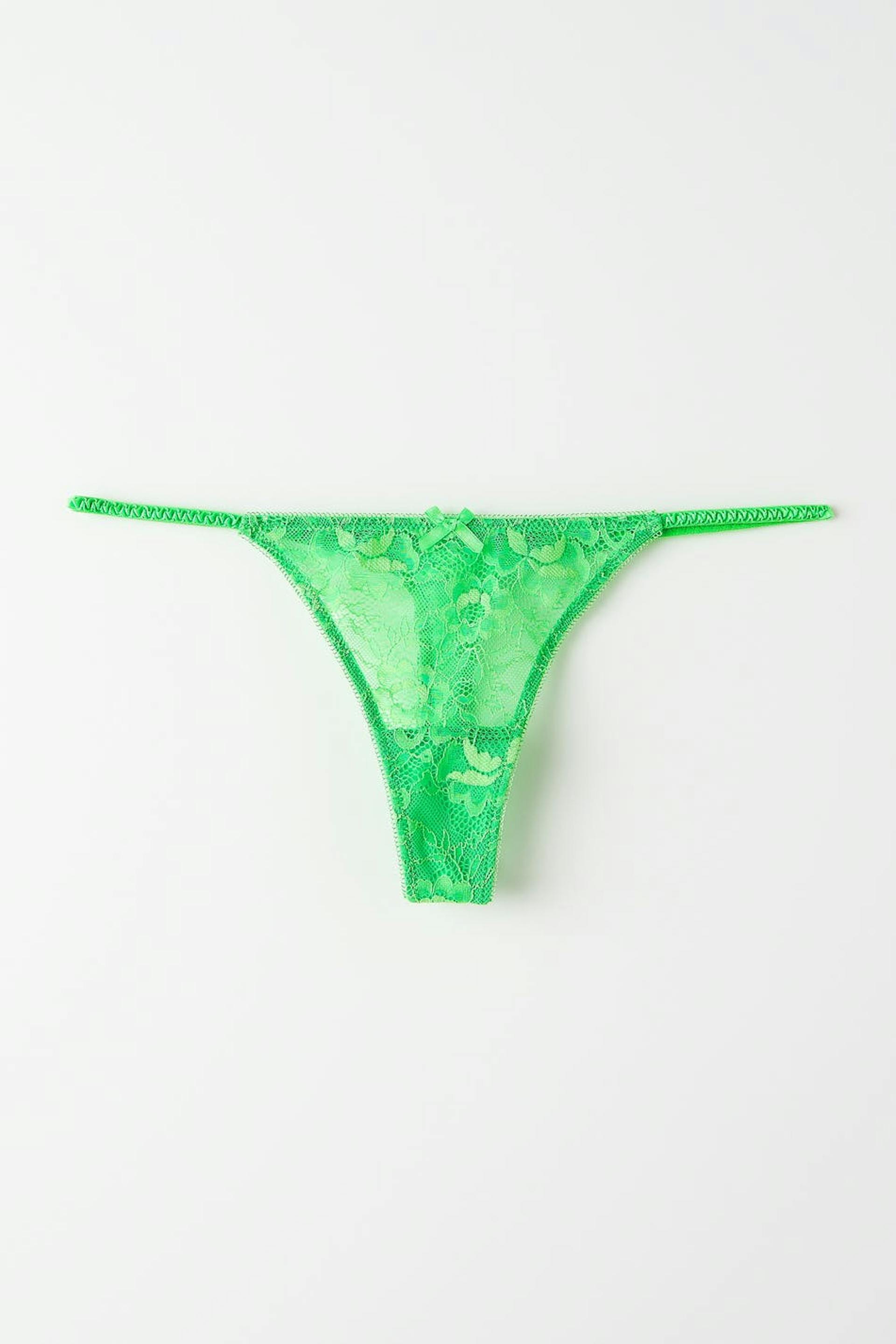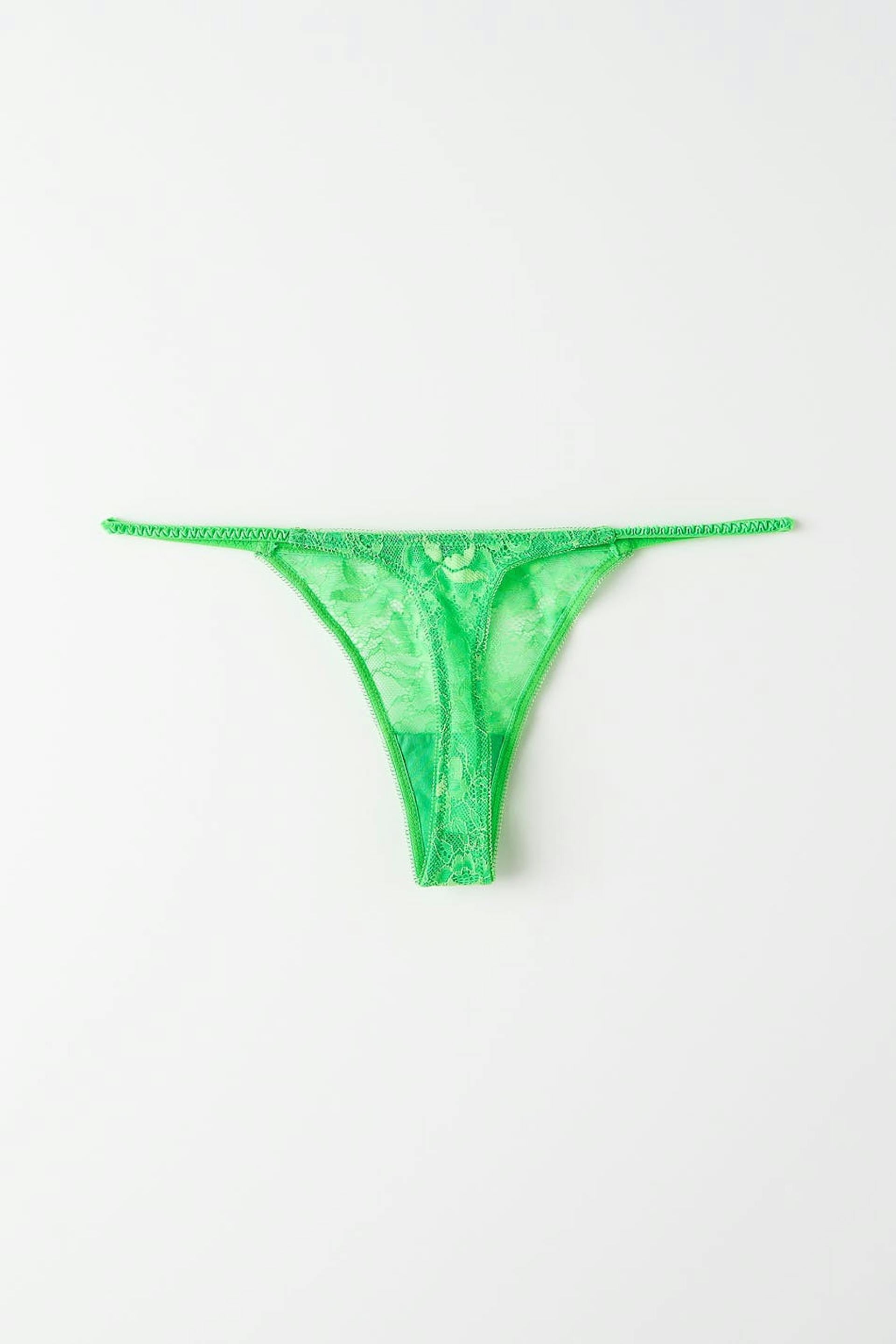 Stringtrosor i spets med tunna resårband i sidorna. Stringtrosorna är gröna och har en fodrad gren i bomull.
