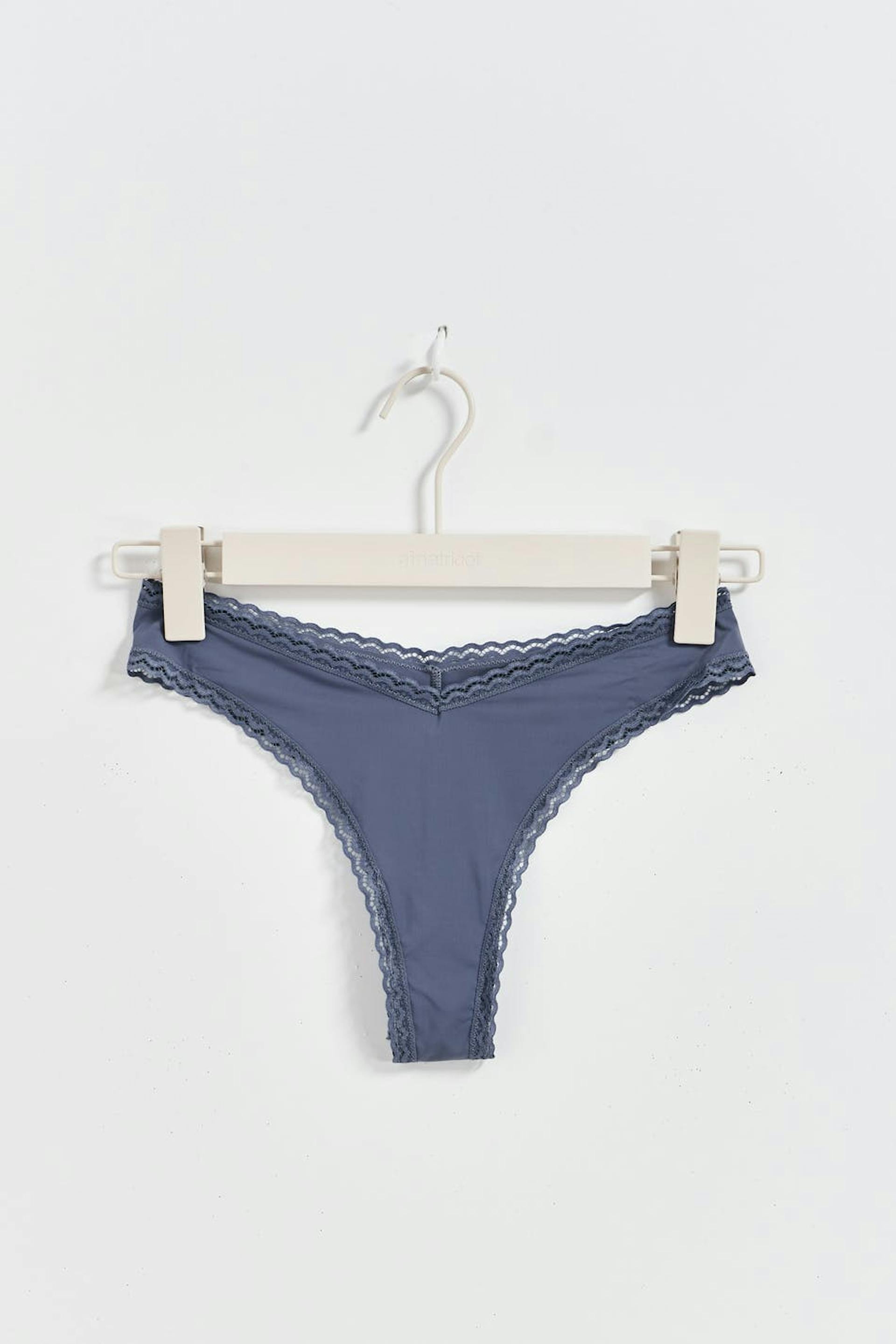 Stringtrosor i microfiber med spetskanter. Stringtrosorna är gråa och har fodrad gren.