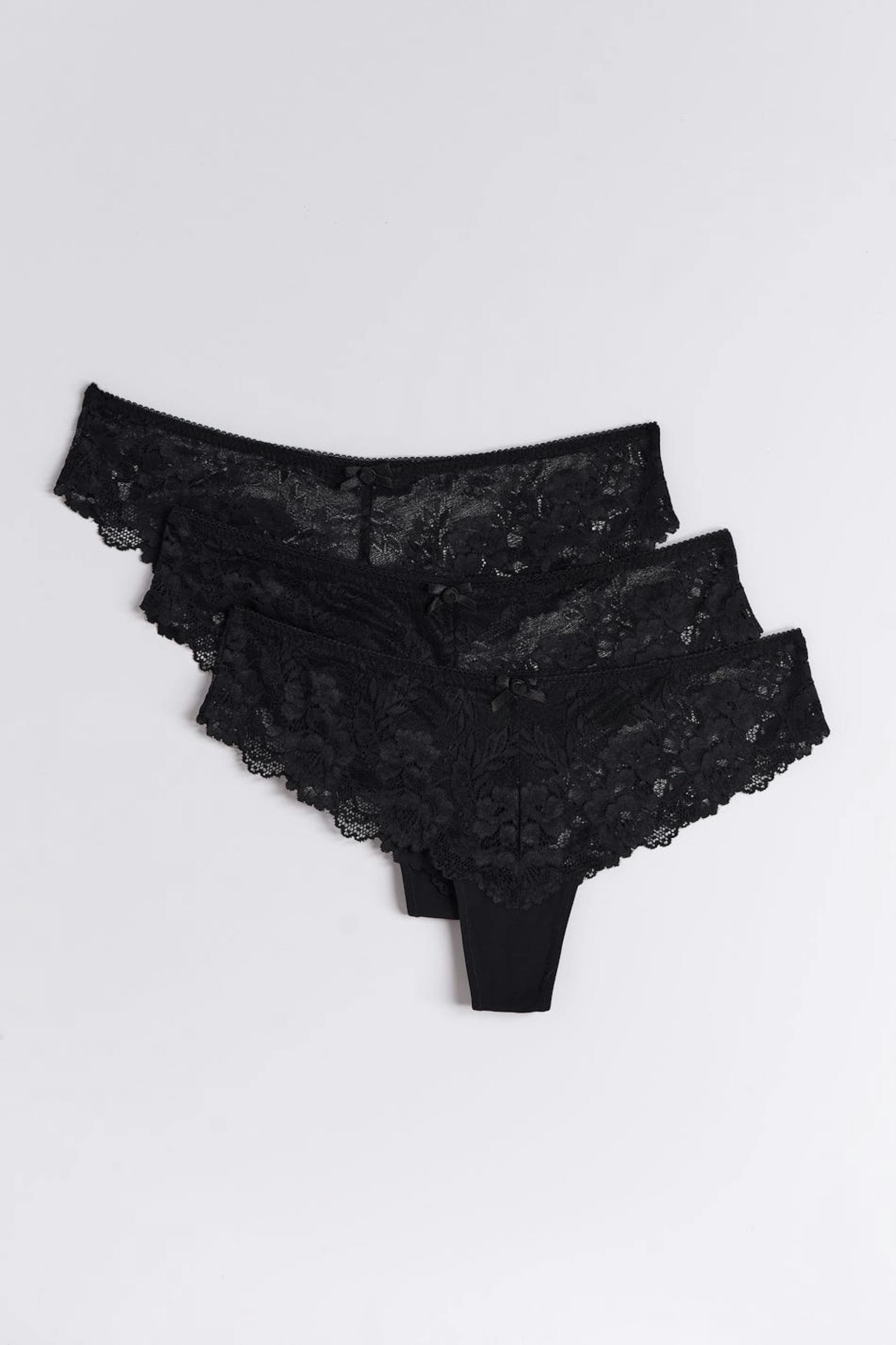 Stringtrosor i spets med fodrad gren. Stringtrosorna är svarta.