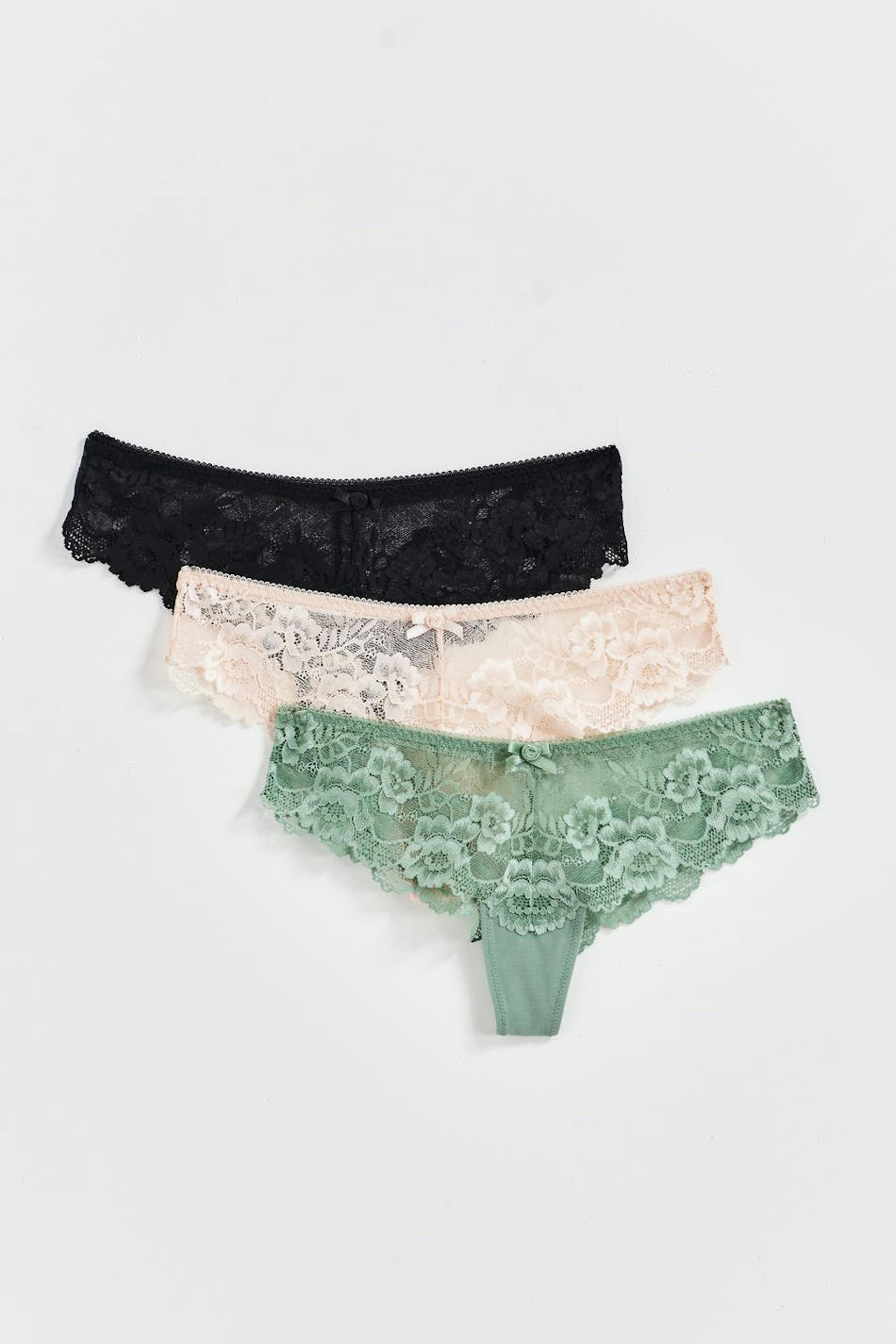 Stringtrosor i spets med fodrad gren. Stringtrosorna är gröna, svarta och rosa. De har rosettdetalj framtill.