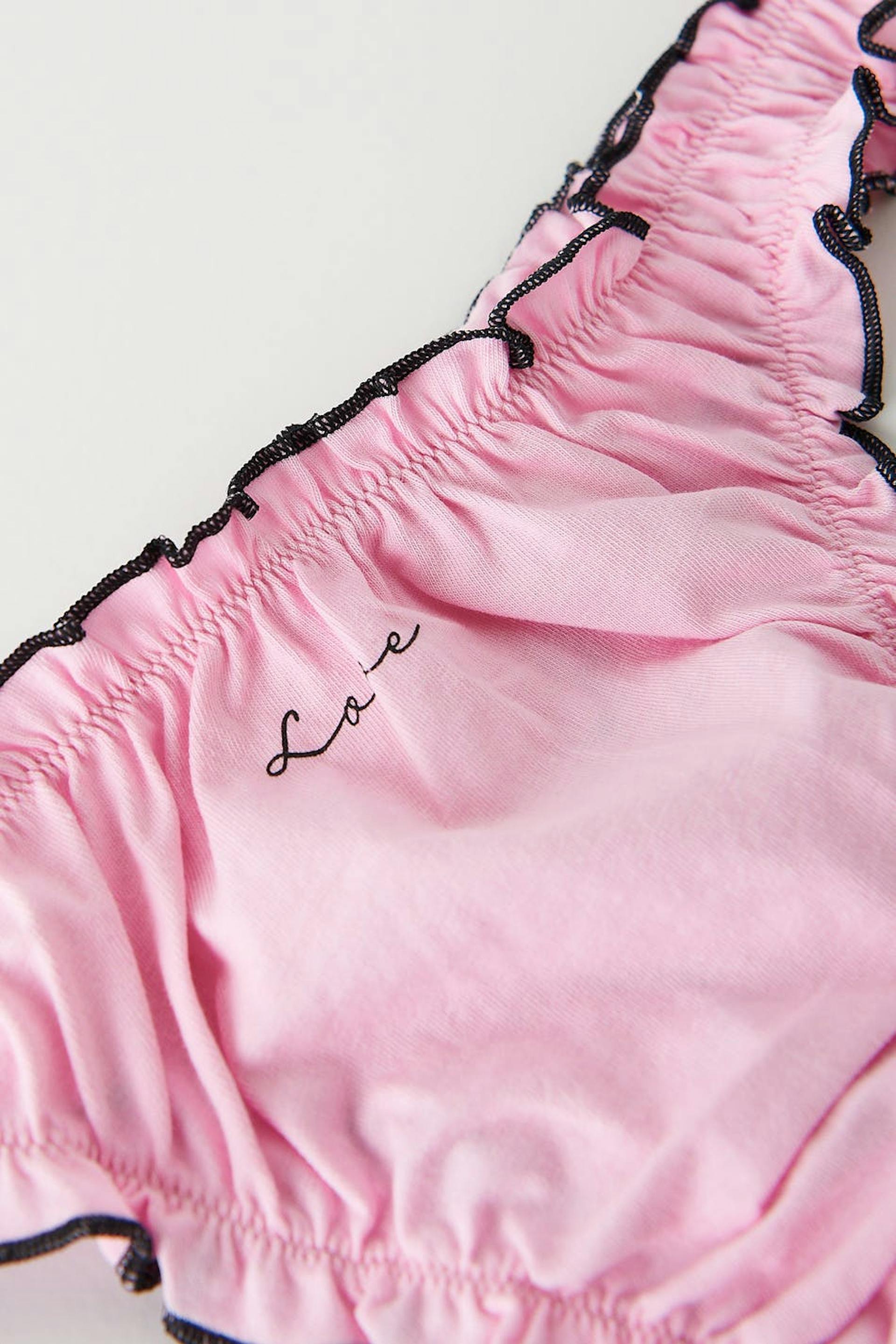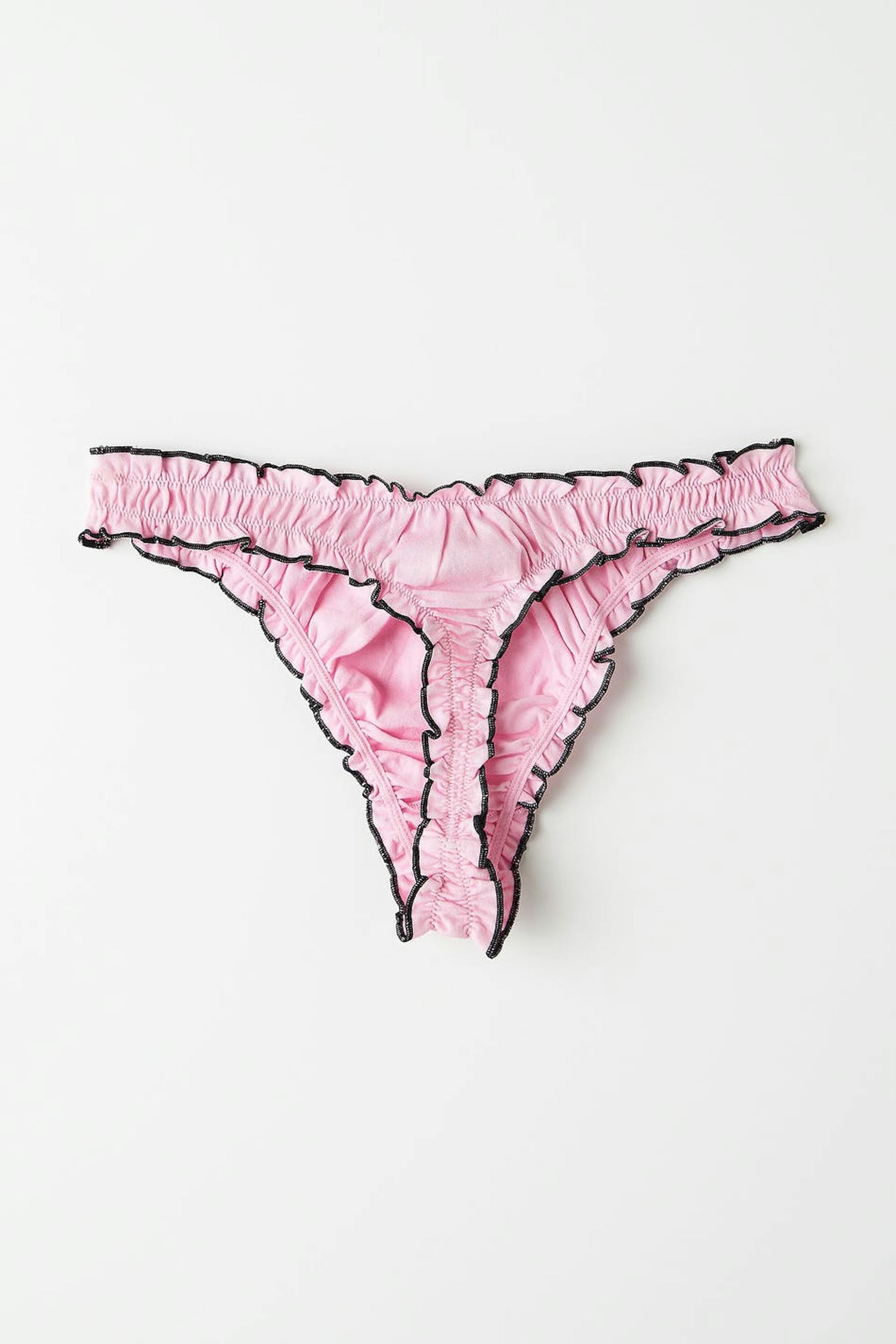 Stringtrosor i bomull med volangkanter. Stringtrosorna är rosa och har en fodrad gren.