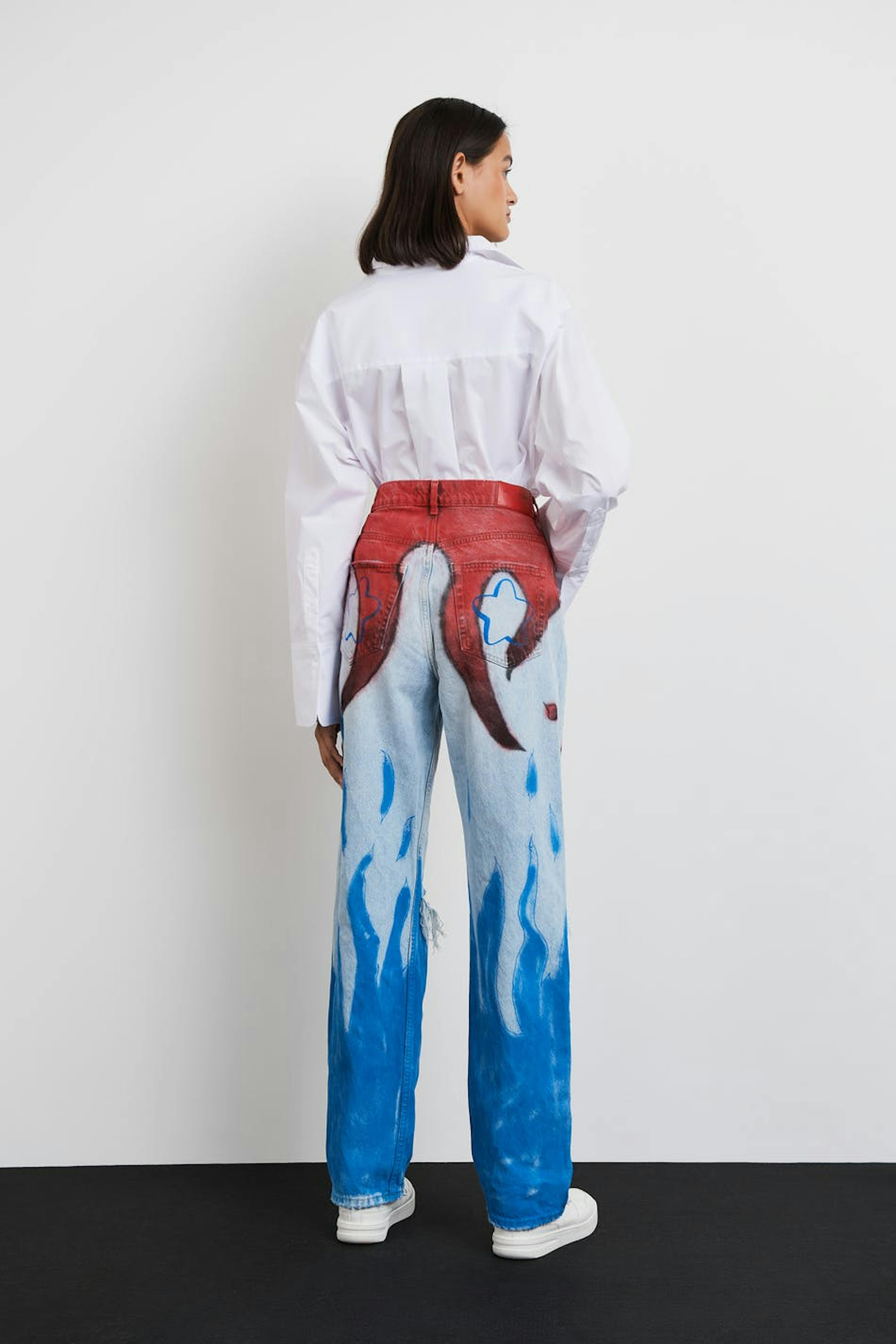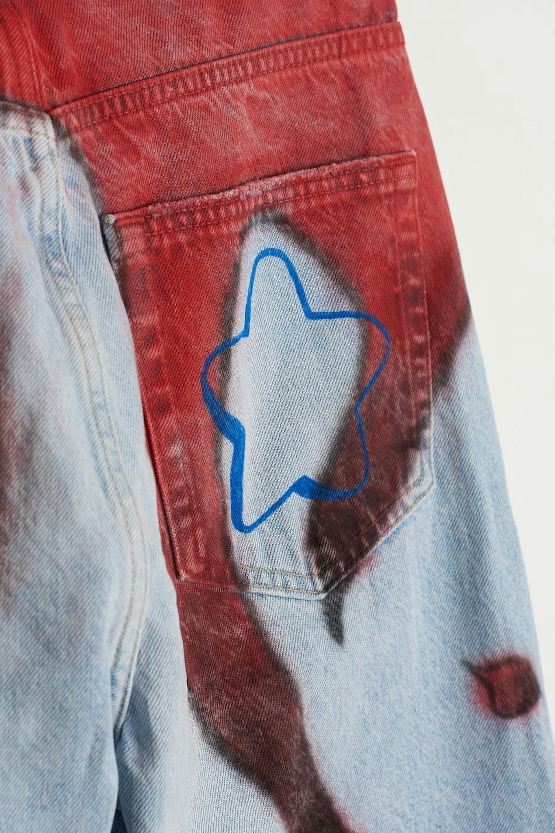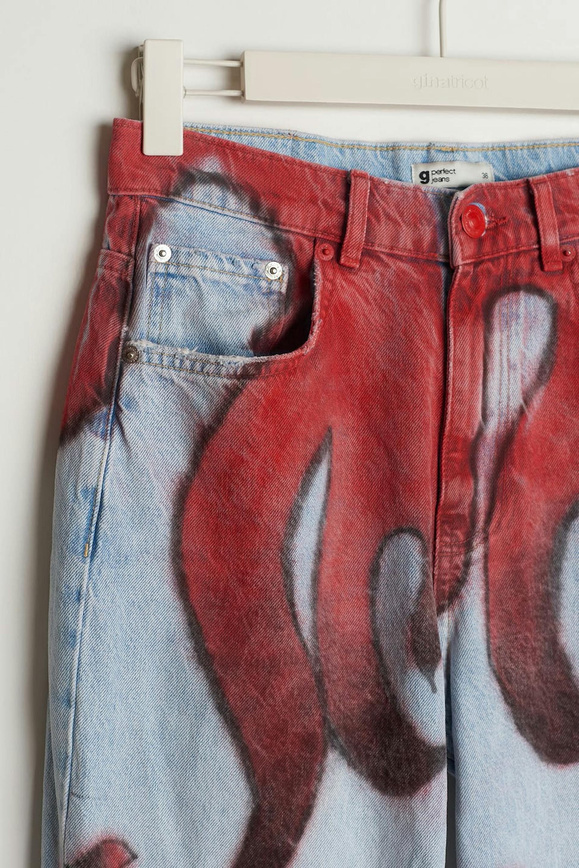 Handmålade jeans av vår lokala designer Axel Backlund i Borås. Jeansen är blåa och utan stretch och har ett rött mönster. De är gjorda av denim och har slitningar på knäna, en 90-talsinspirerad passform, en hög midja och fickor fram och bak. Färg och mönster kan variera, vilket gör varje plagg helt unikt.