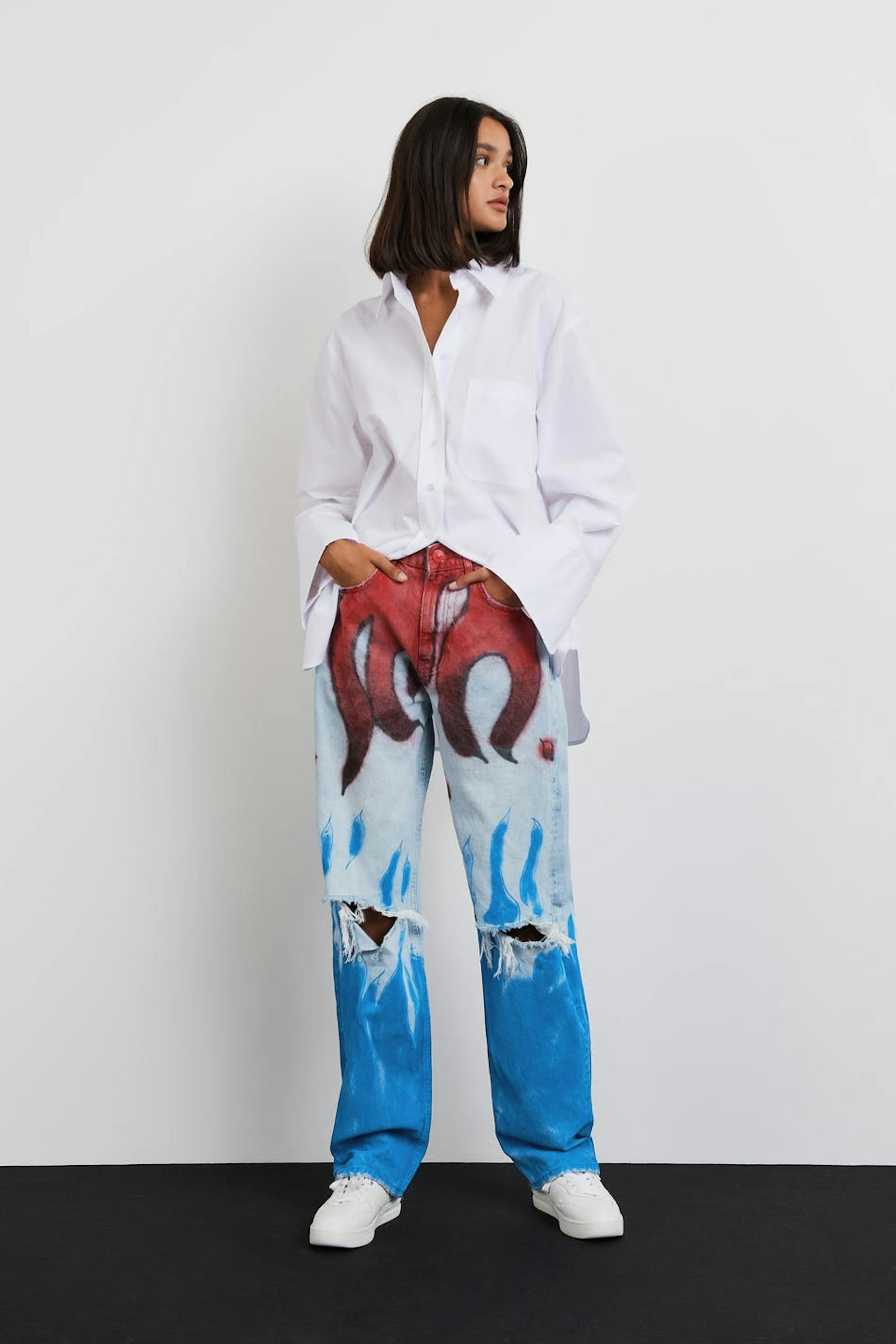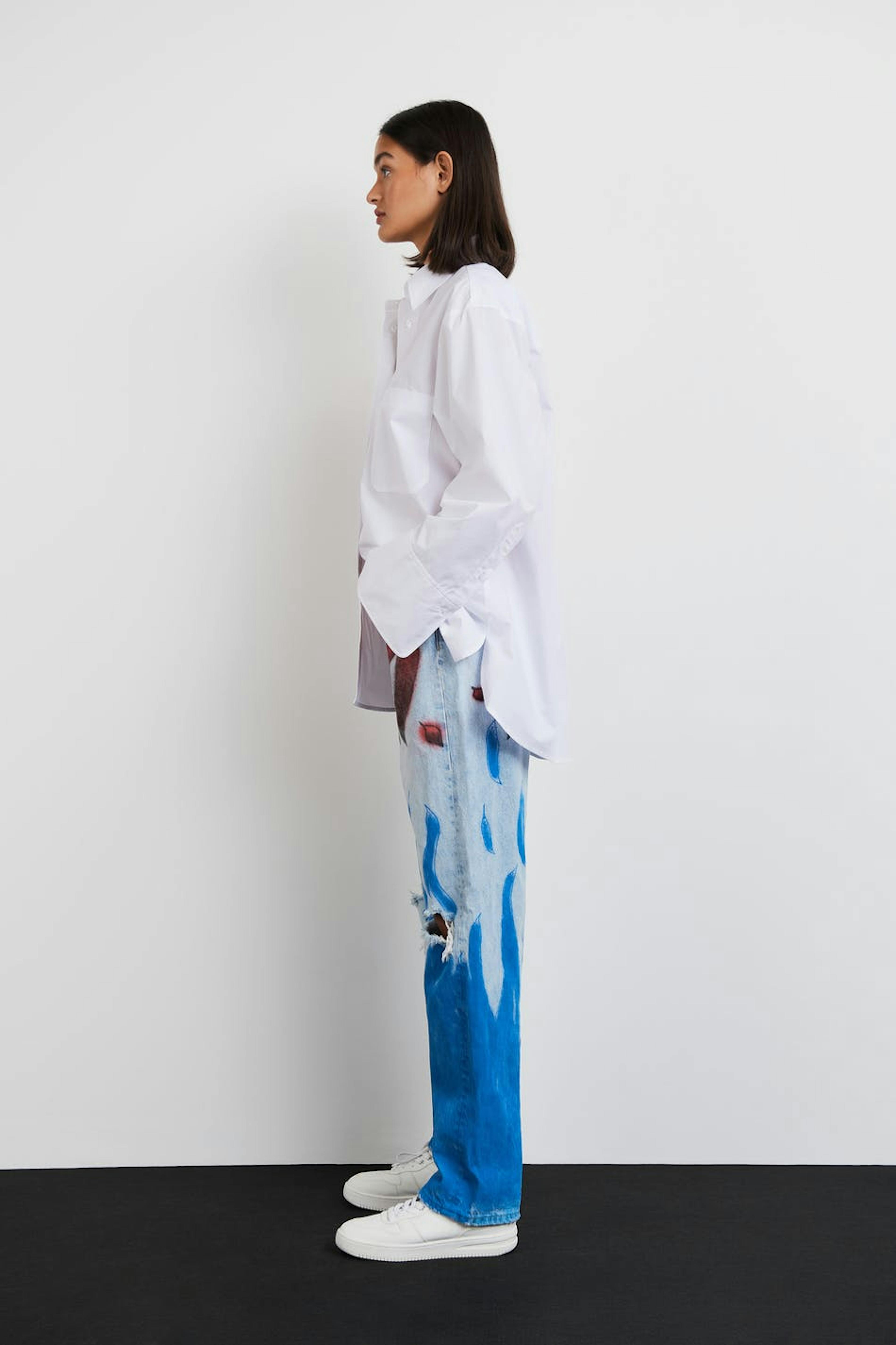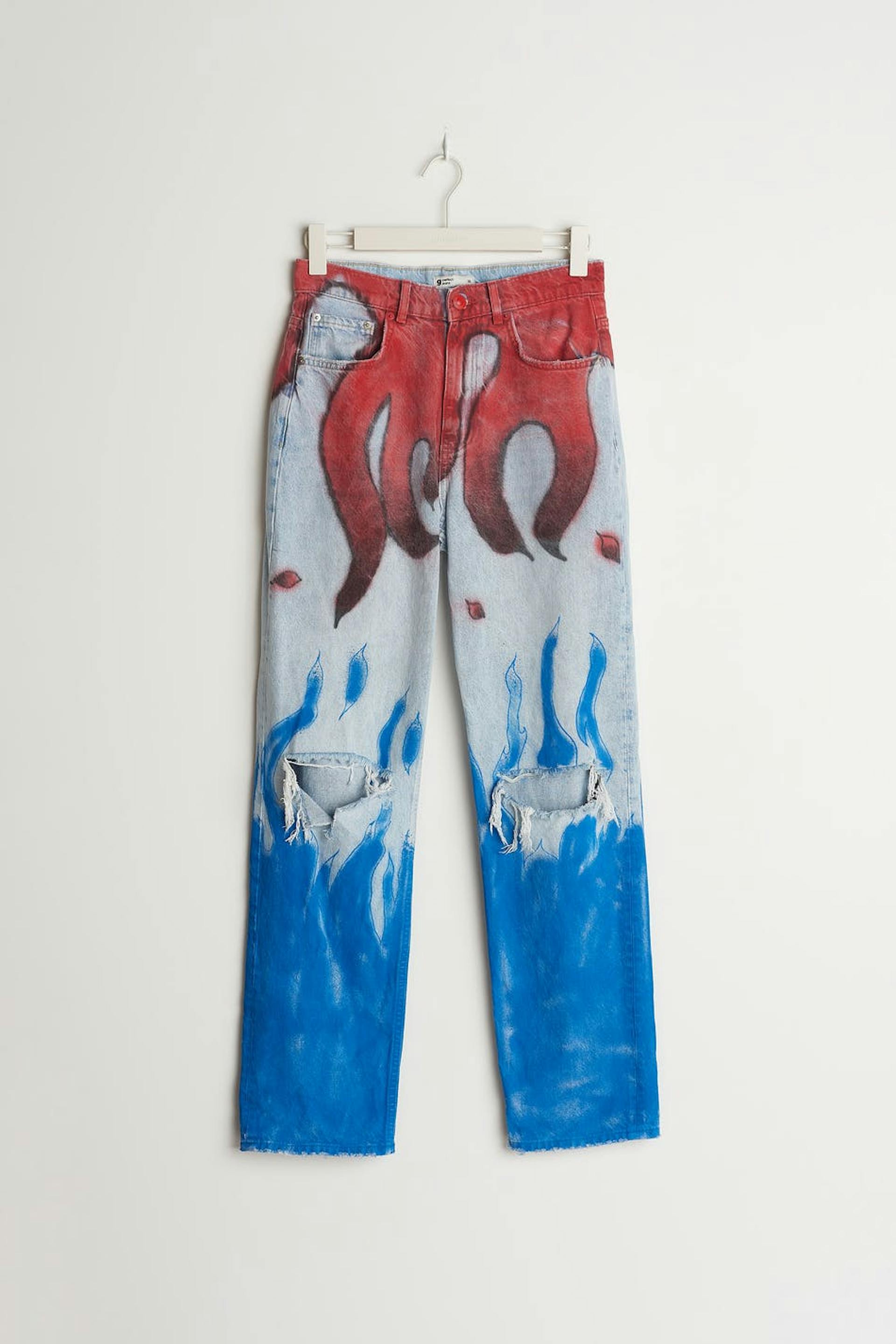 Handmålade jeans av vår lokala designer Axel Backlund i Borås. Jeansen är blåa och utan stretch och har ett rött mönster. De är gjorda av denim och har slitningar på knäna, en 90-talsinspirerad passform, en hög midja och fickor fram och bak. Färg och mönster kan variera, vilket gör varje plagg helt unikt.