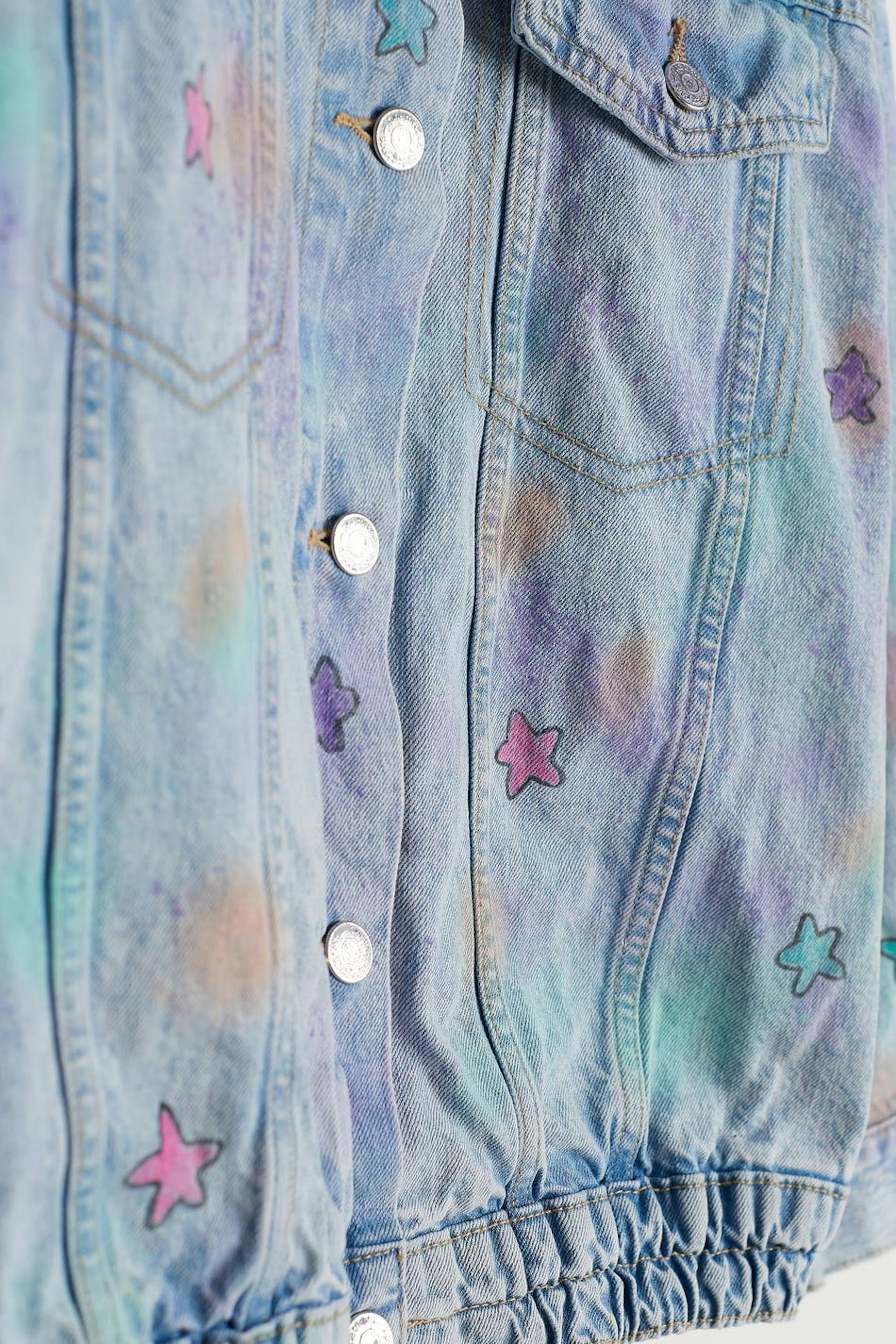 Handmålad jeansjacka av vår lokala designer Axel Backlund i Borås. Jackan är blå och har en oversize fit. Den har en resår på nederfållen, en knappstängning och två bröstfickor framtill.