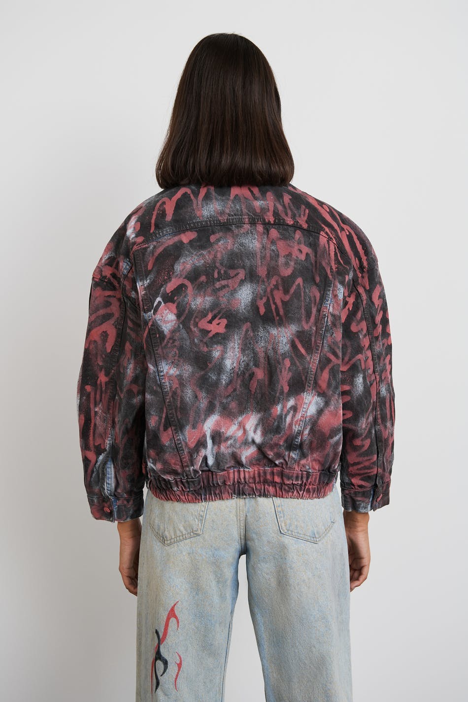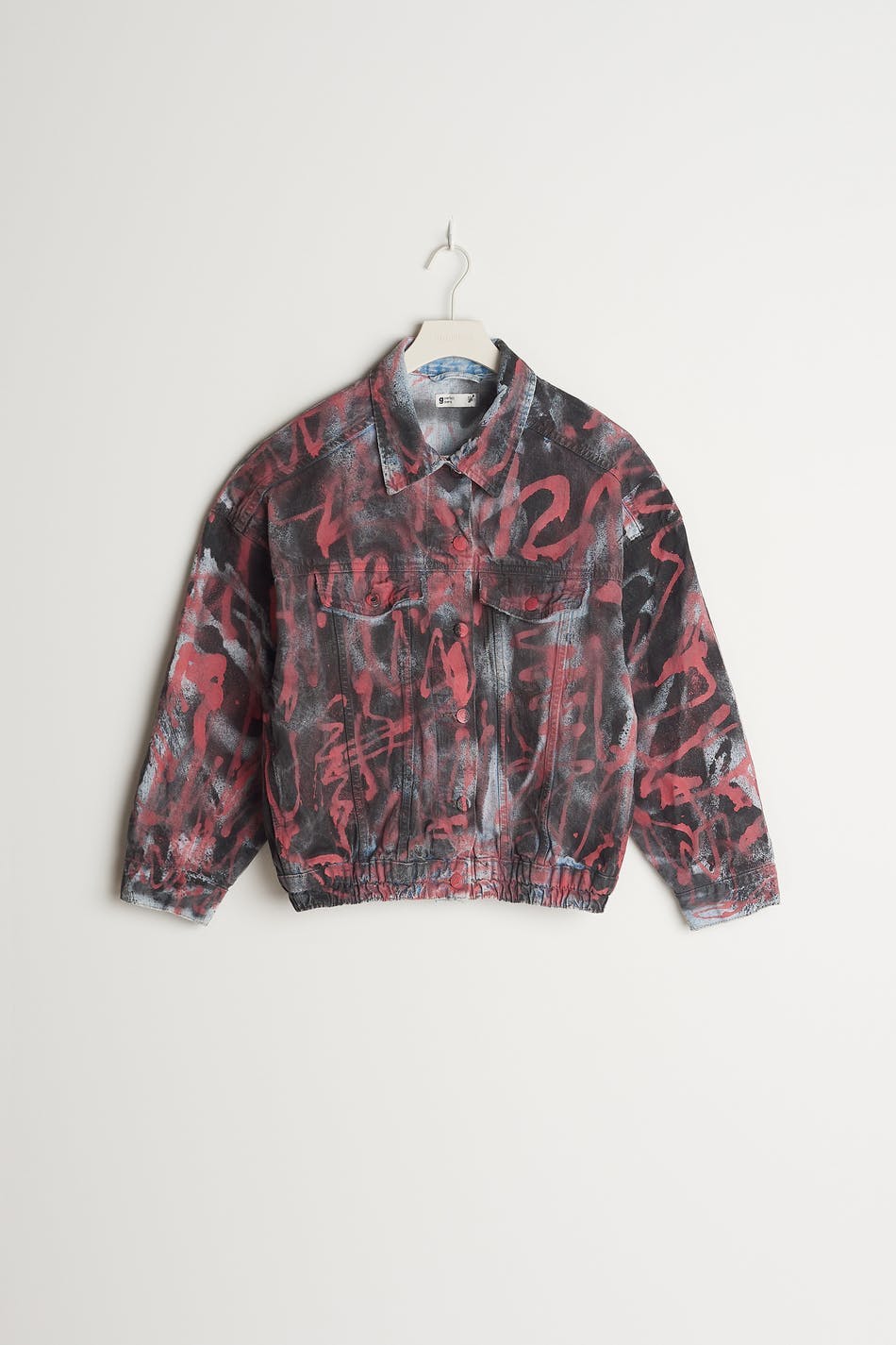 Handmålad jeansjacka av vår lokala designer Axel Backlund. Jackan är svart och har röda detaljer. Den har en oversize fit, en resår på nederfållen, en knappstängning och två bröstfickor framtill. Färg och mönster kan variera, vilket gör varje plagg helt unikt.