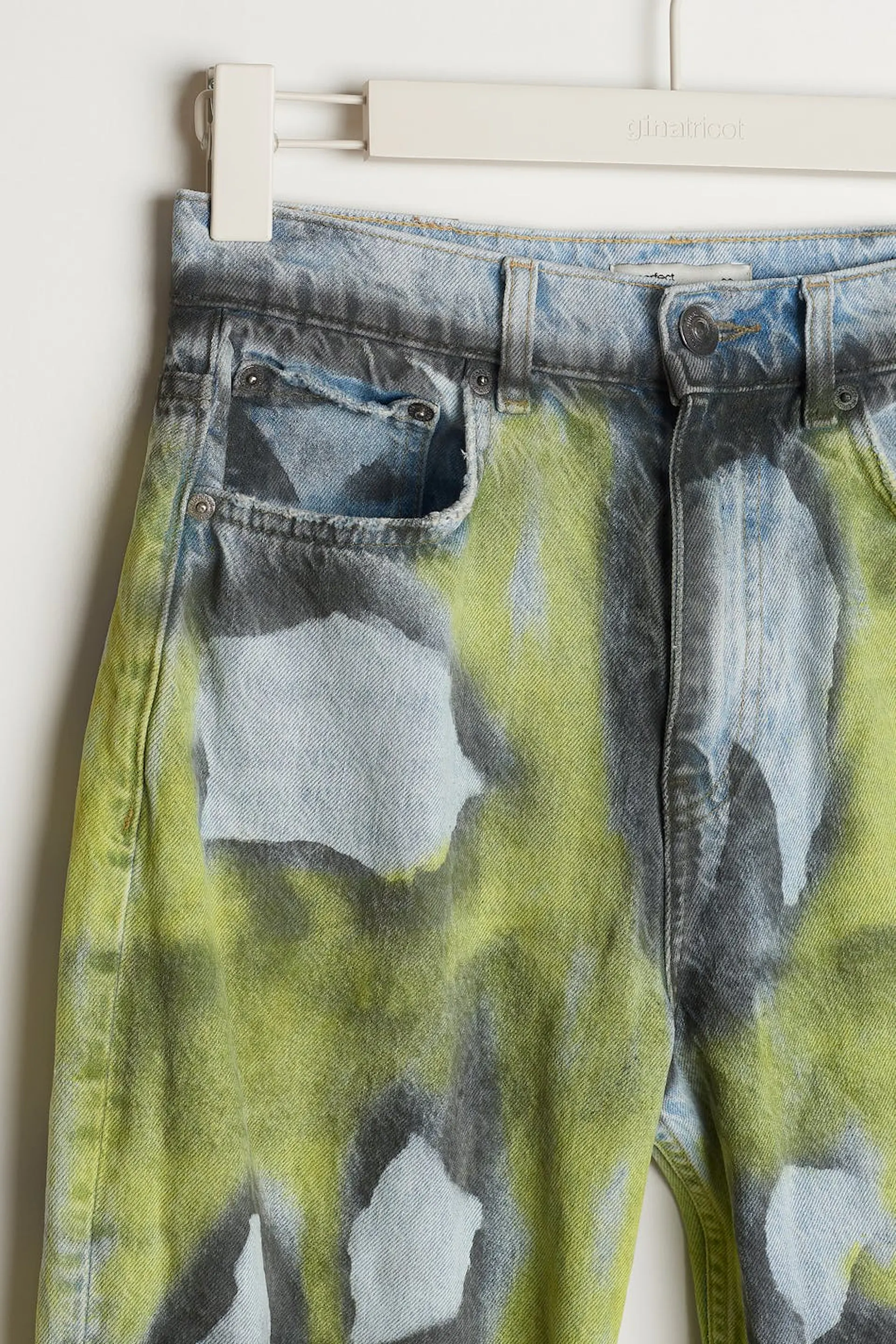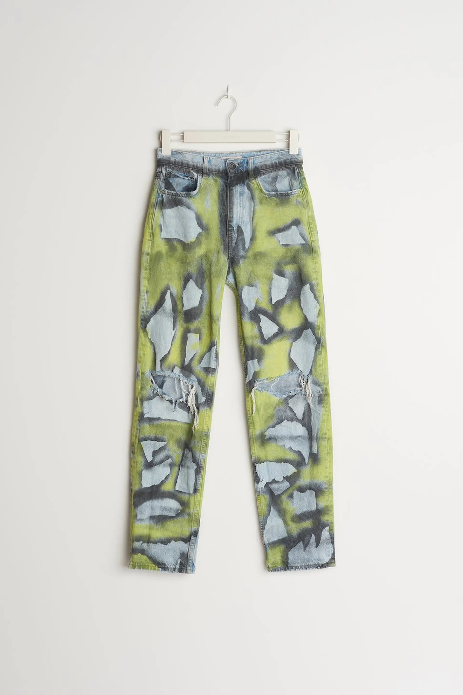 Handmålade jeans av vår lokala designer Axel Backlund. Jeansen är blåa och har ett gult, dekorativt mönster. De är gjorda av denim och har slitningar på knäna, en 90-talsinspirerad passform, en hög midja och fickor fram och bak. Färg och mönster kan variera, vilket gör varje plagg helt unikt.
