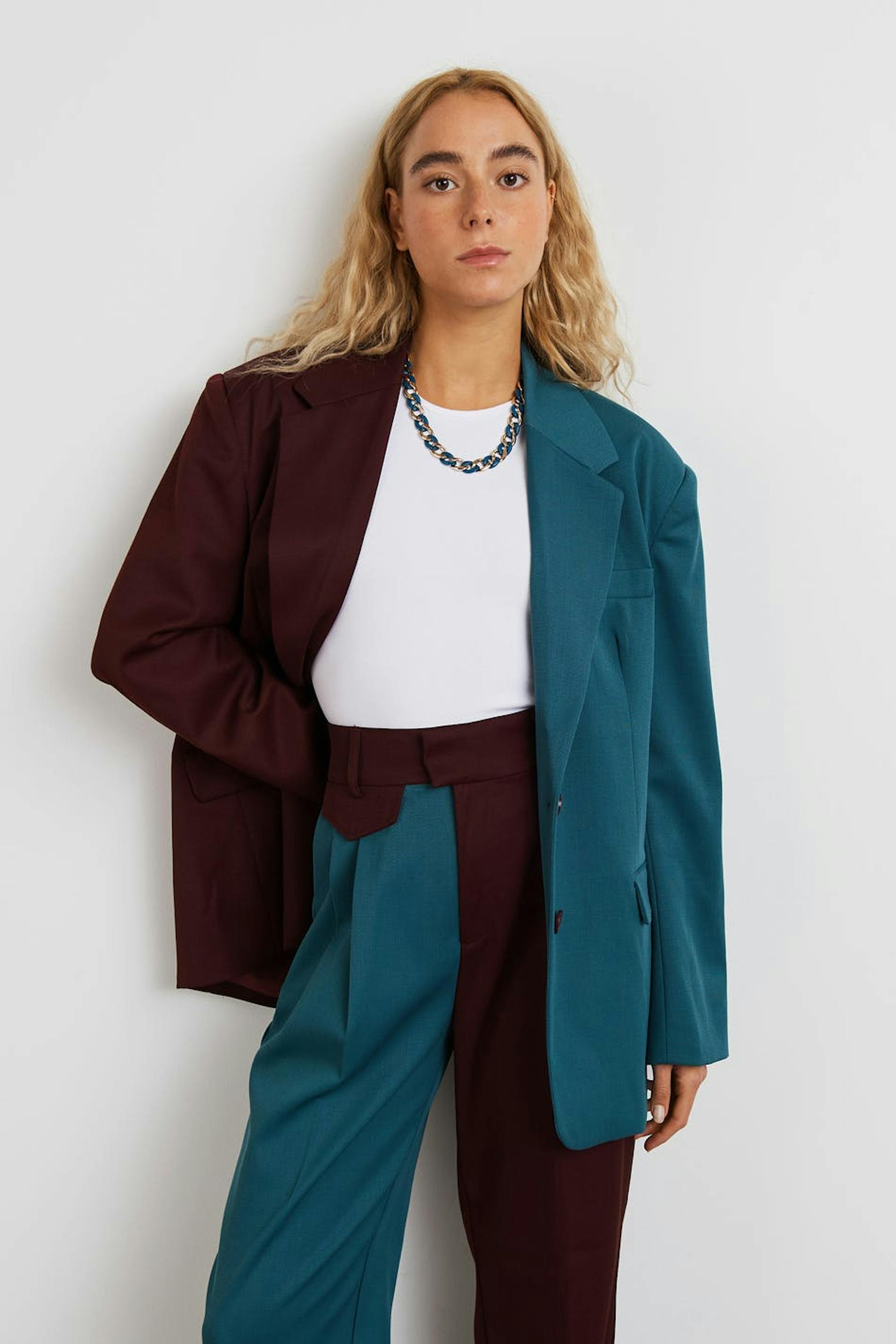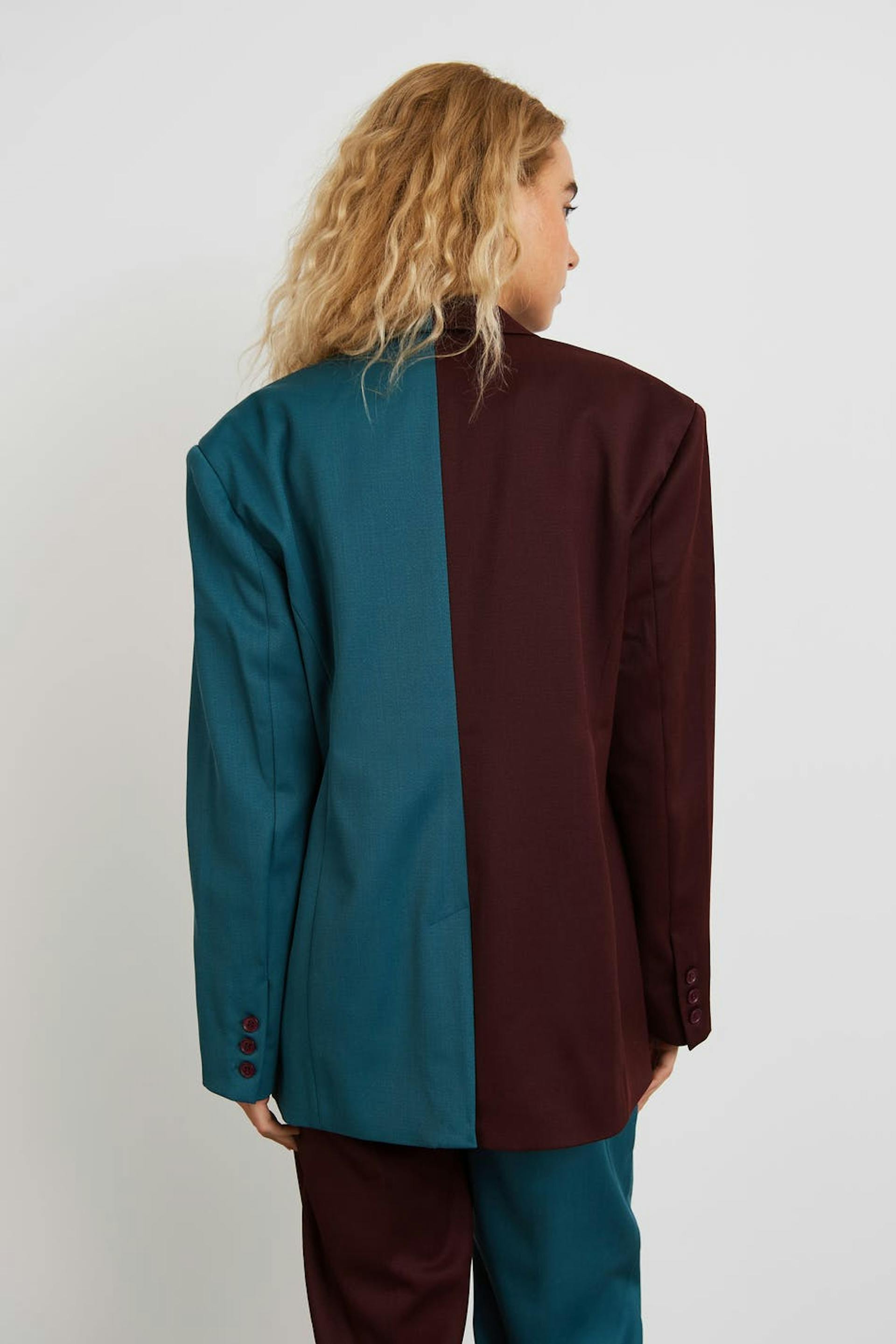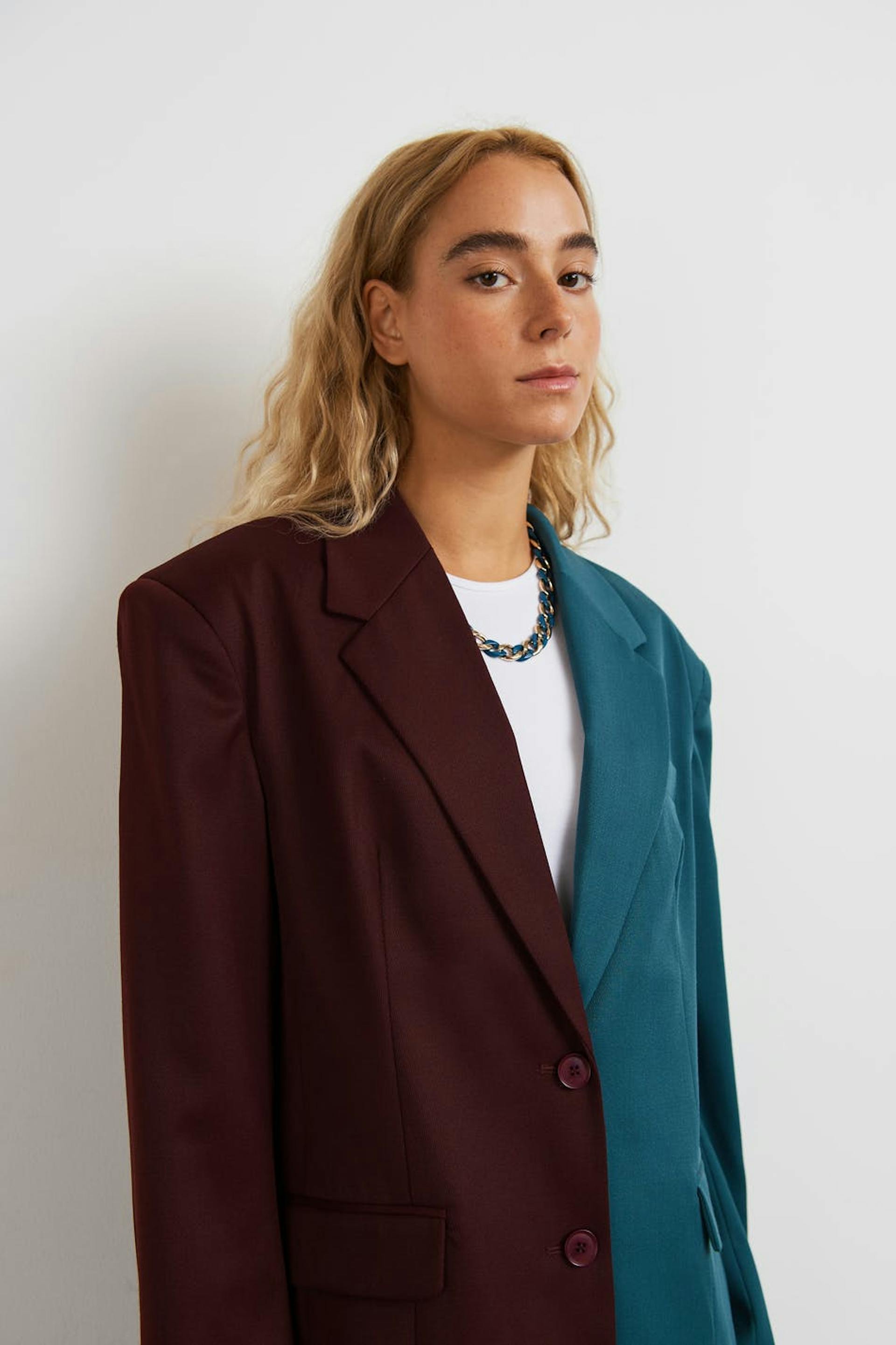 Hobnob X Gina Tricot. Blazer med färgade block. Blazern är röd och blå och har dekorativa sömdetaljer framtill. Den har en krage, markerade axlar, passpoalfickor med lock och knappar framtill och vid ärmsluten.