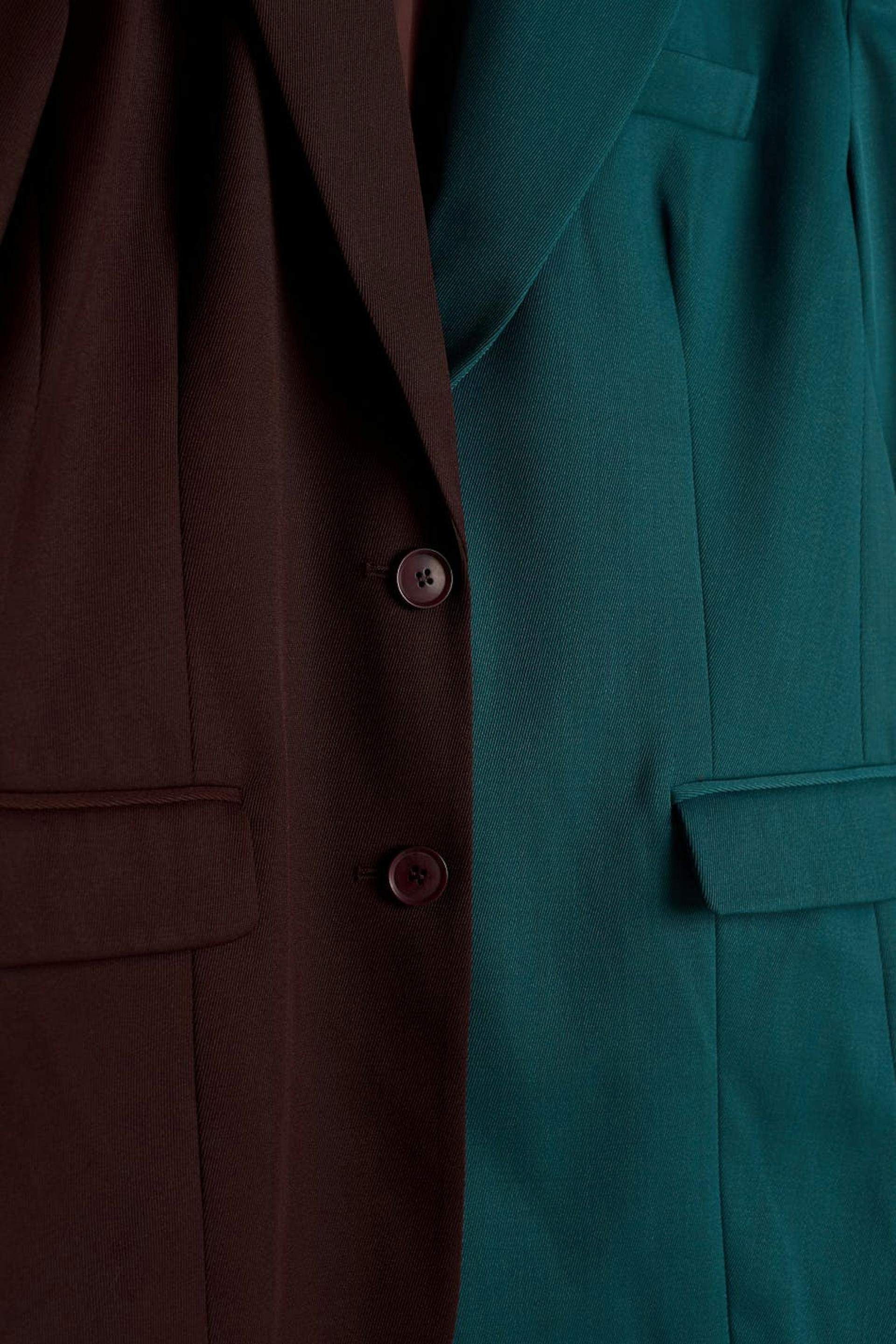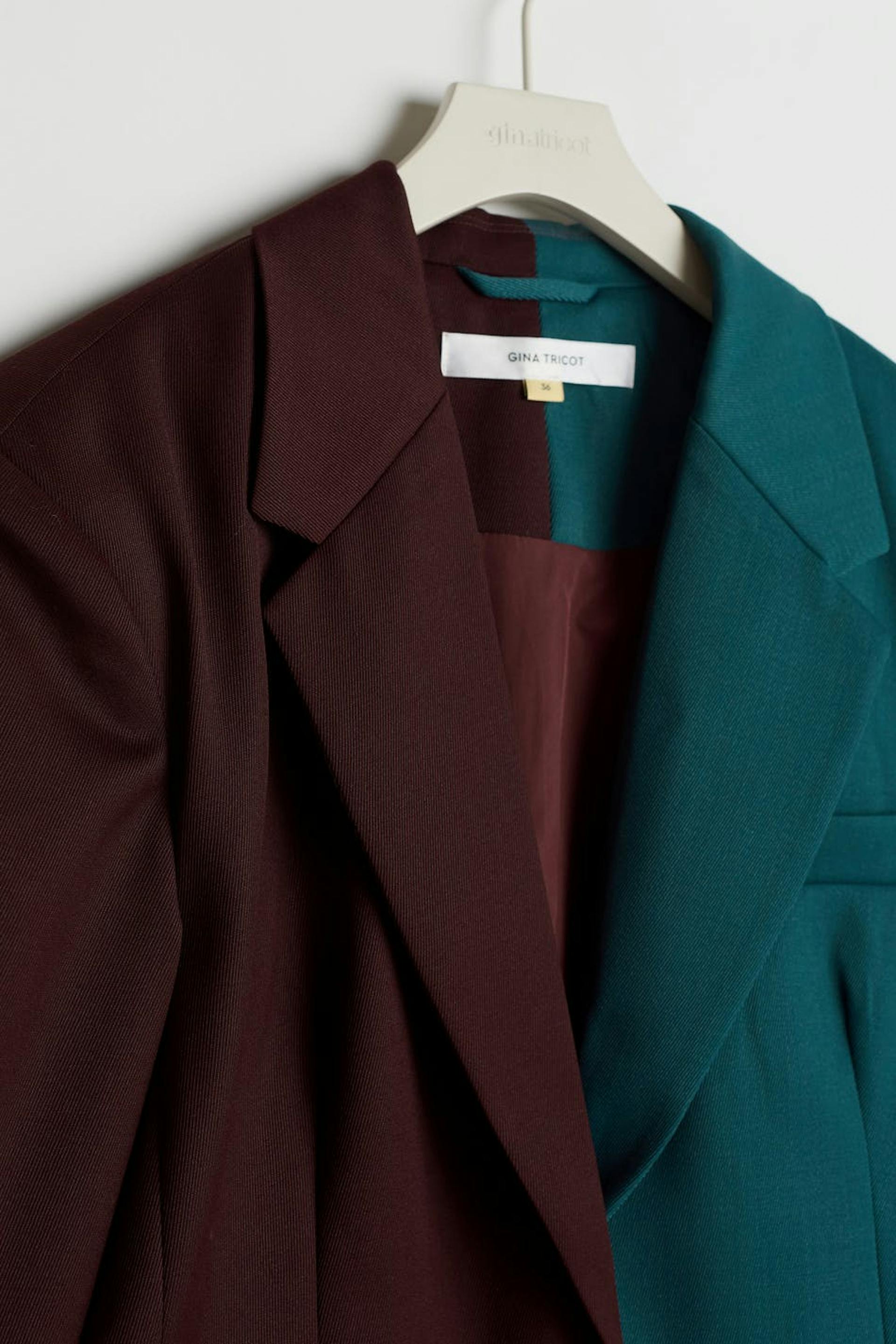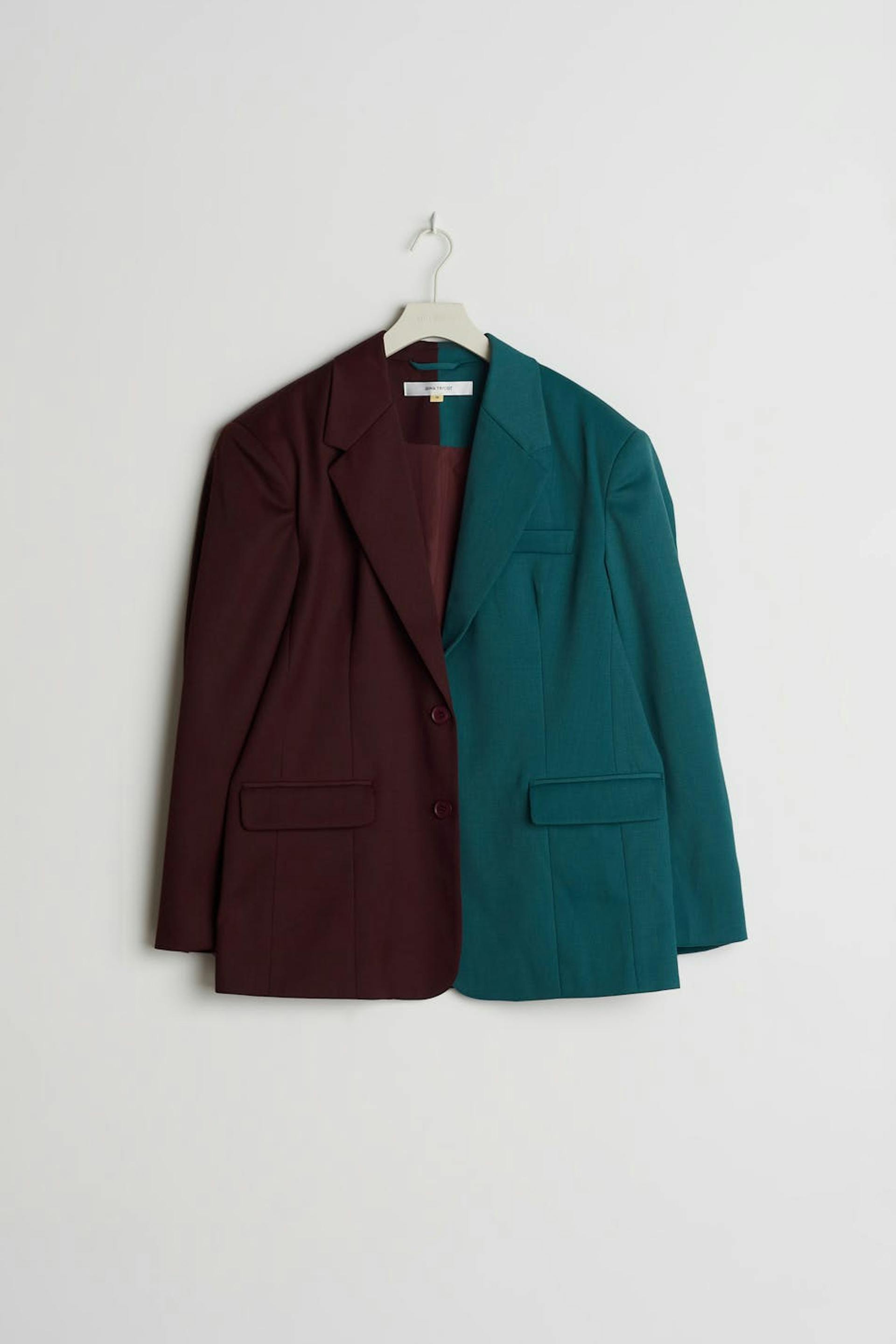 Hobnob X Gina Tricot. Blazer med färgade block. Blazern är röd och blå och har dekorativa sömdetaljer framtill. Den har en krage, markerade axlar, passpoalfickor med lock och knappar framtill och vid ärmsluten.