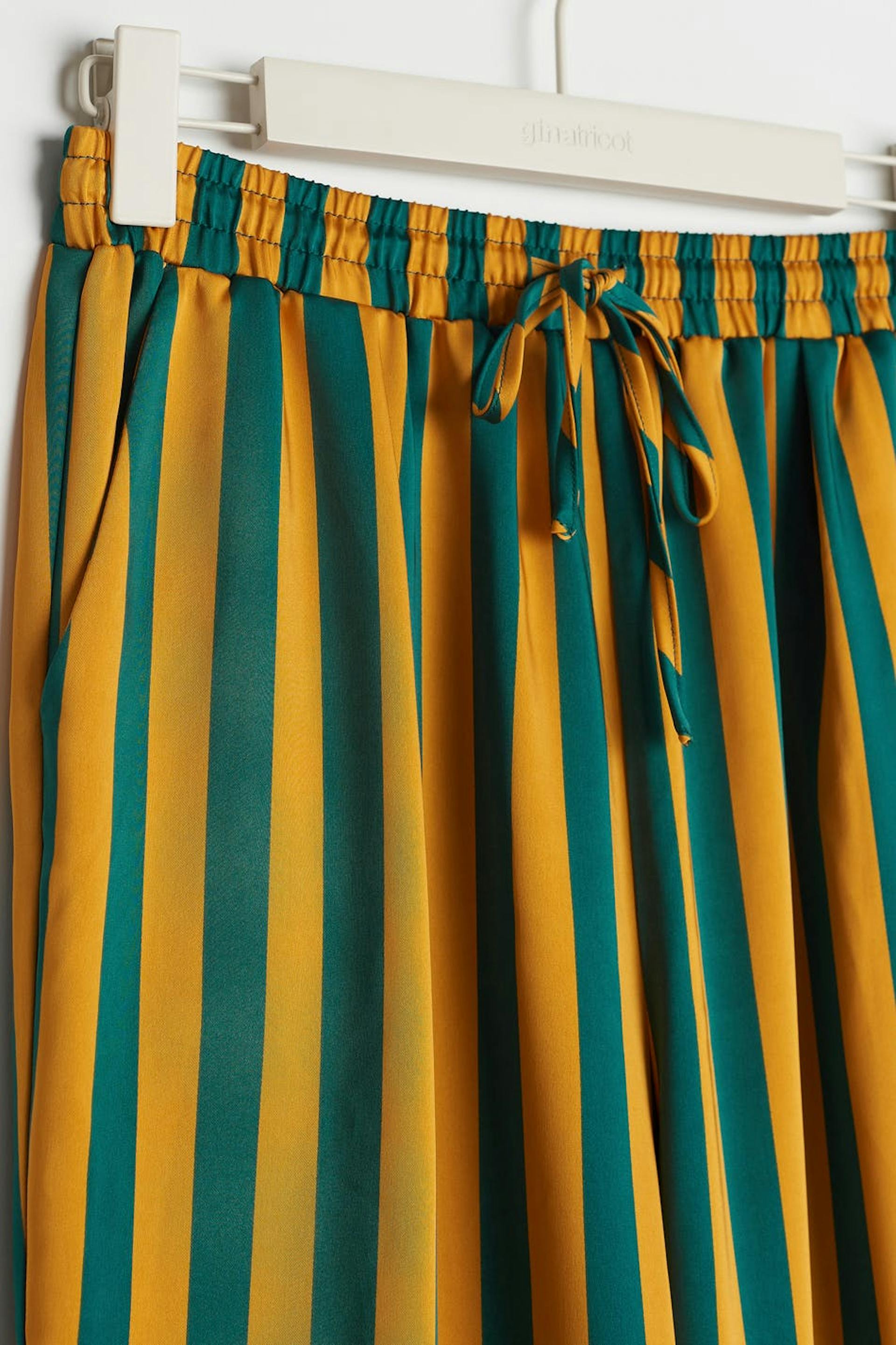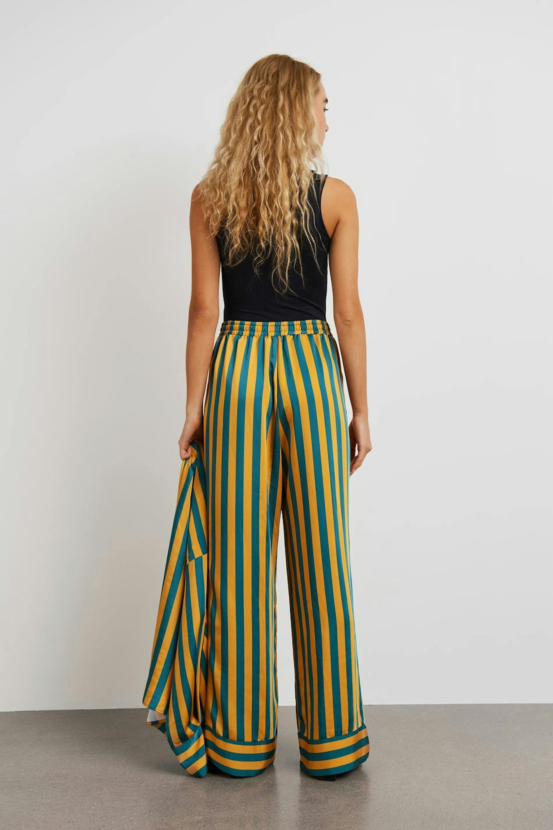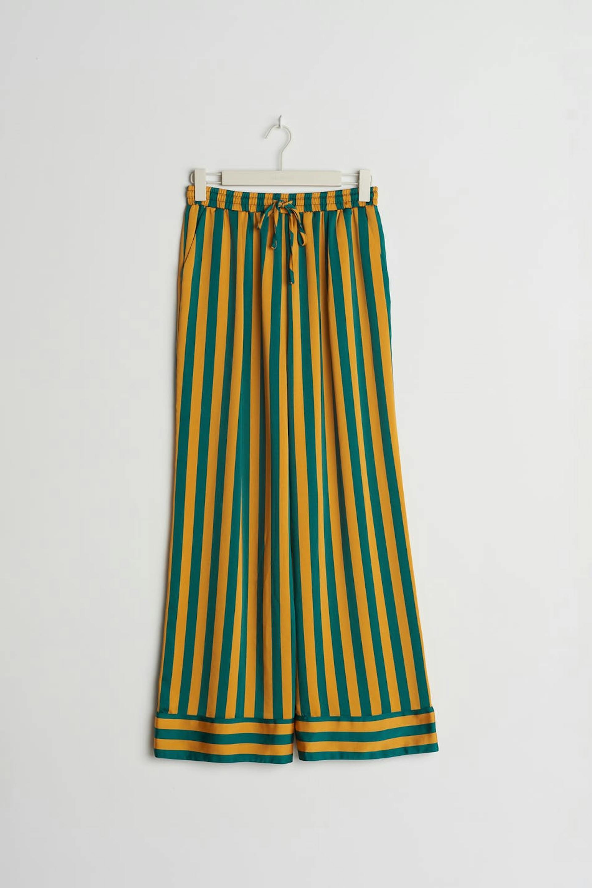 Hobnob X Gina Tricot. Randiga pyjamasbyxor med oversize fit. Pyjamasbyxorna är gula och blåa och har ett satinmaterial. De har en mjuk resår i midjan med en knytning framtill och byxben med en fullängd.
