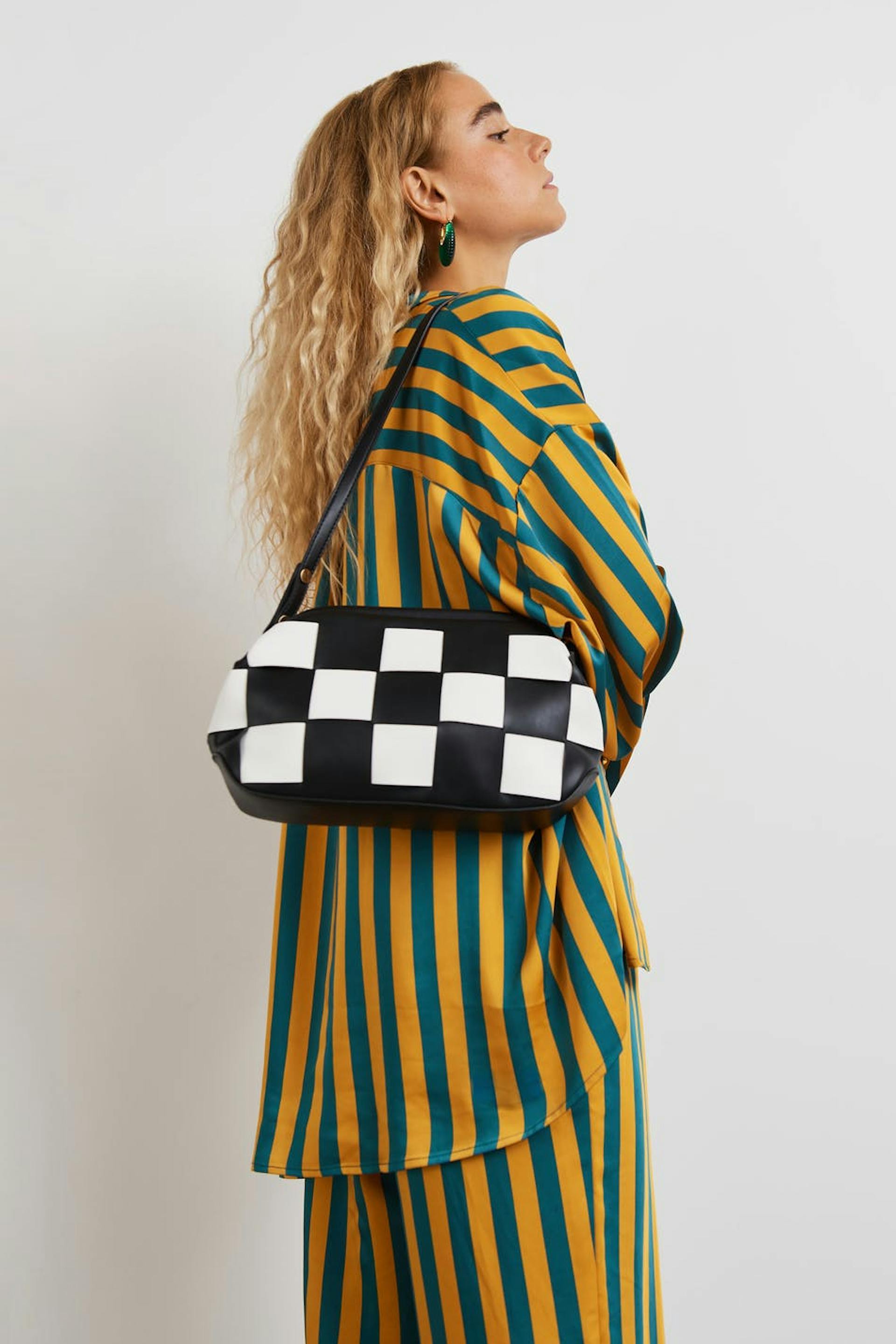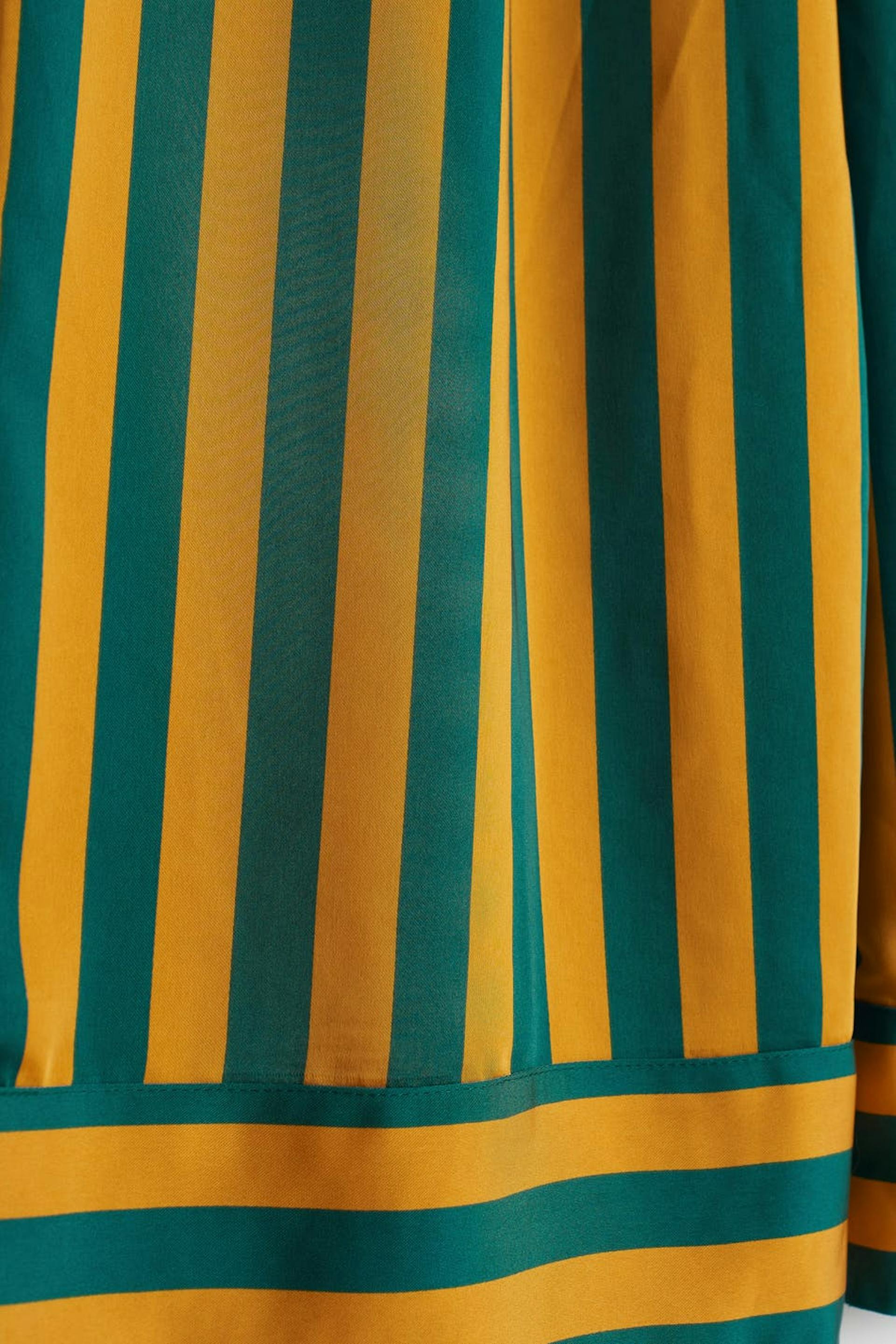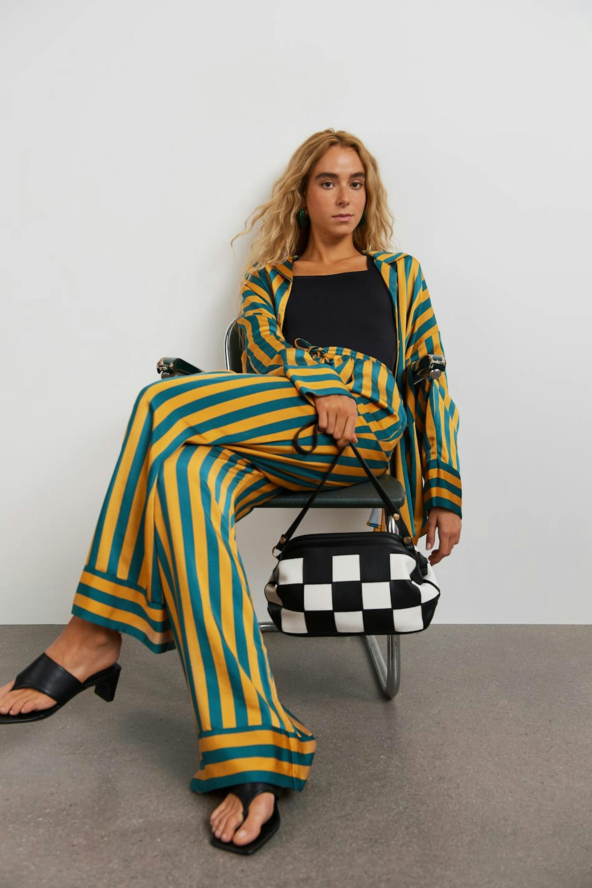 Hobnob X Gina Tricot. Randiga pyjamasbyxor med oversize fit. Pyjamasbyxorna är gula och blåa och har ett satinmaterial. De har en mjuk resår i midjan med en knytning framtill och byxben med en fullängd.